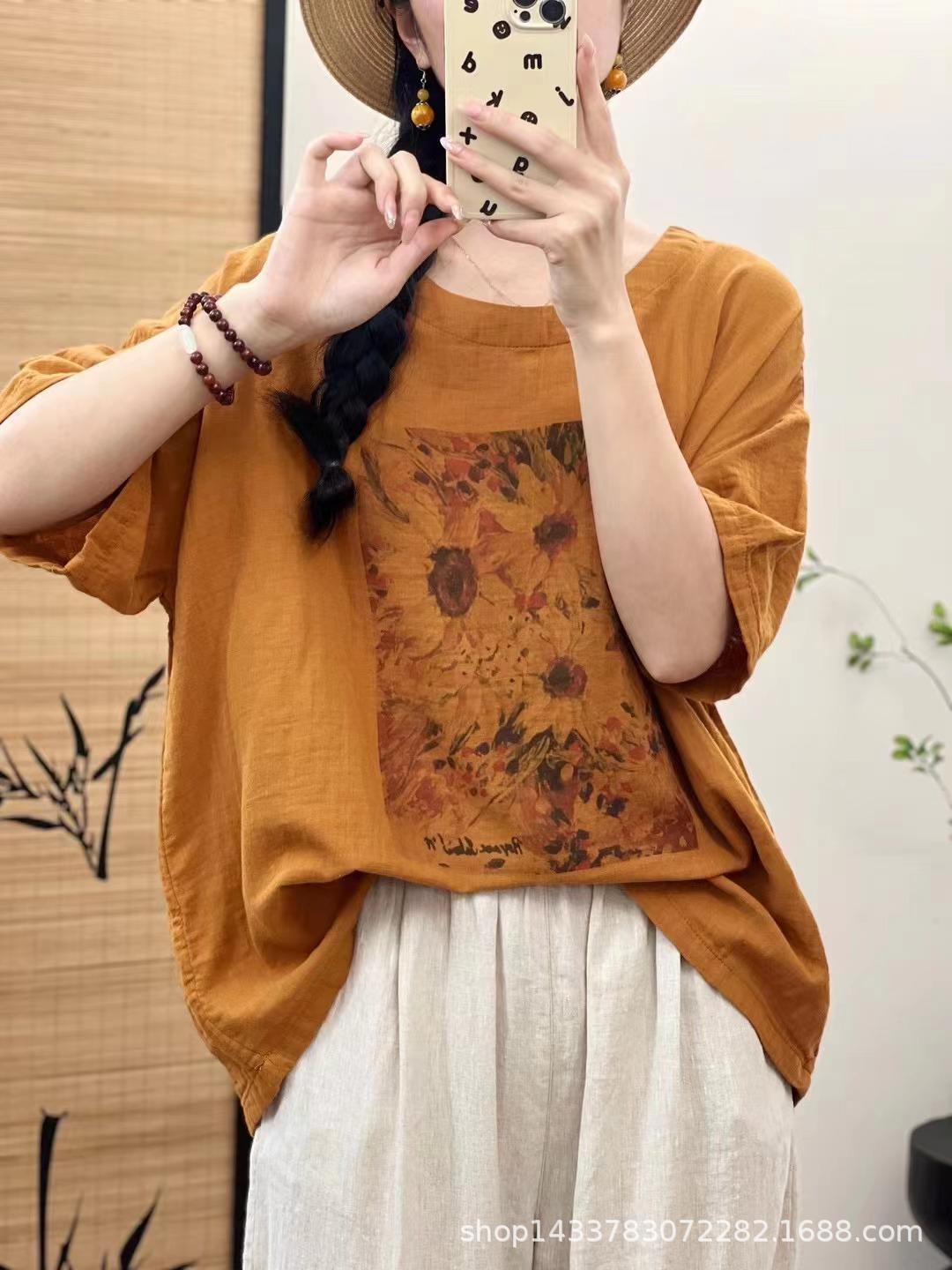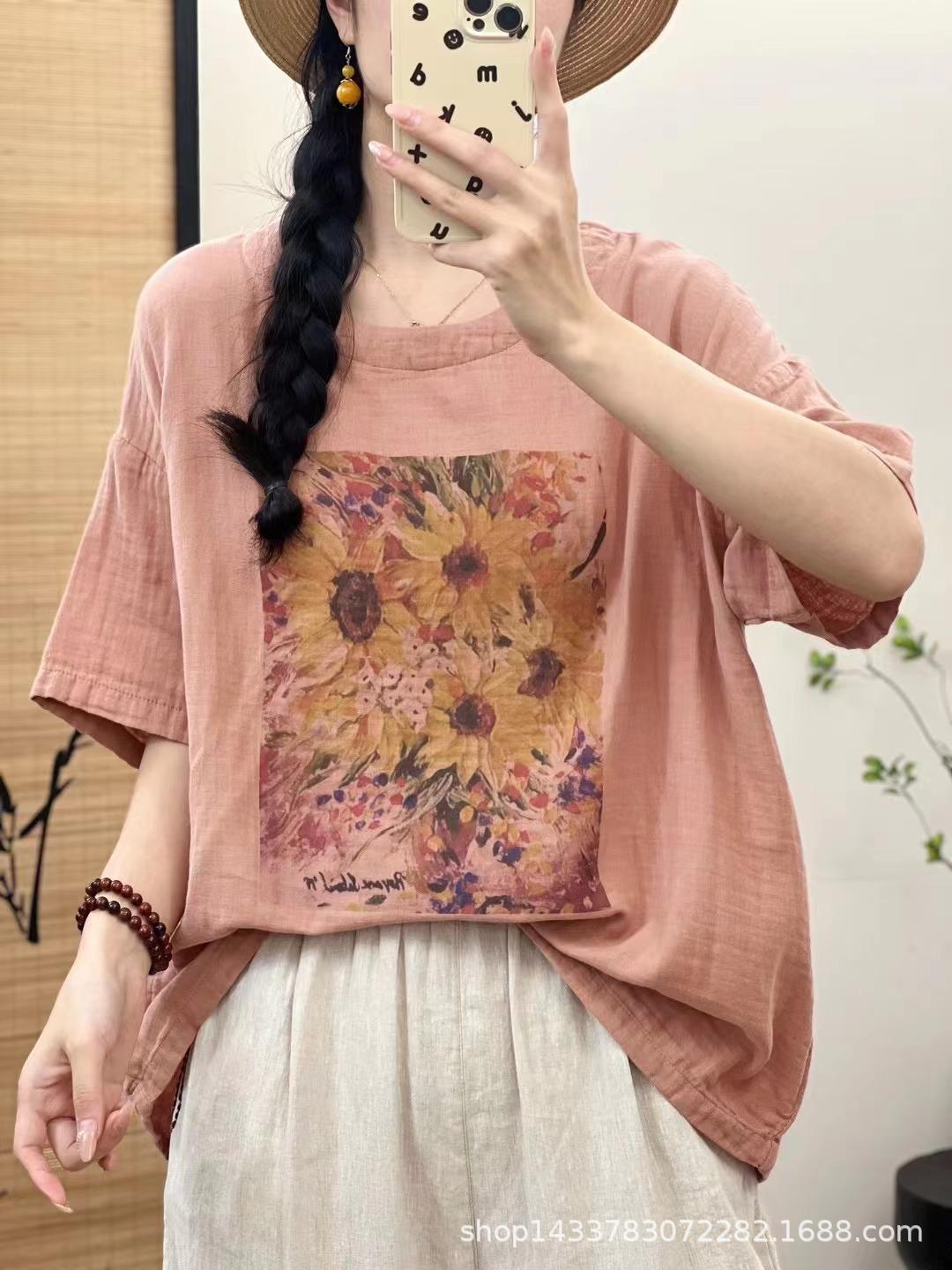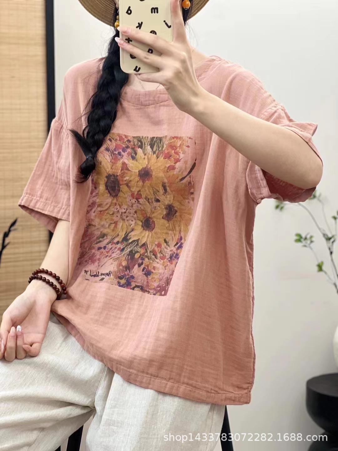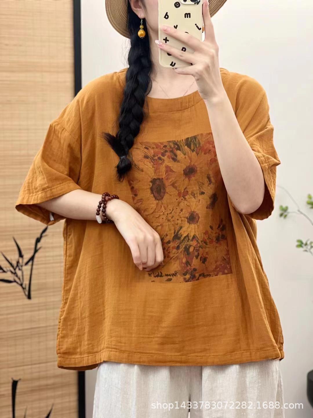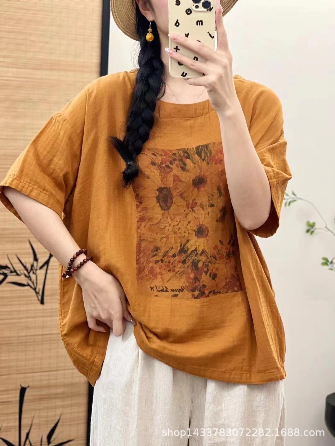 Camiseta de manga corta con cuello redondo y estampado retro para mujer, holgada, informal, transpirable y adelgazante, novedad de verano de 2024