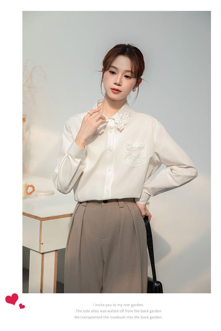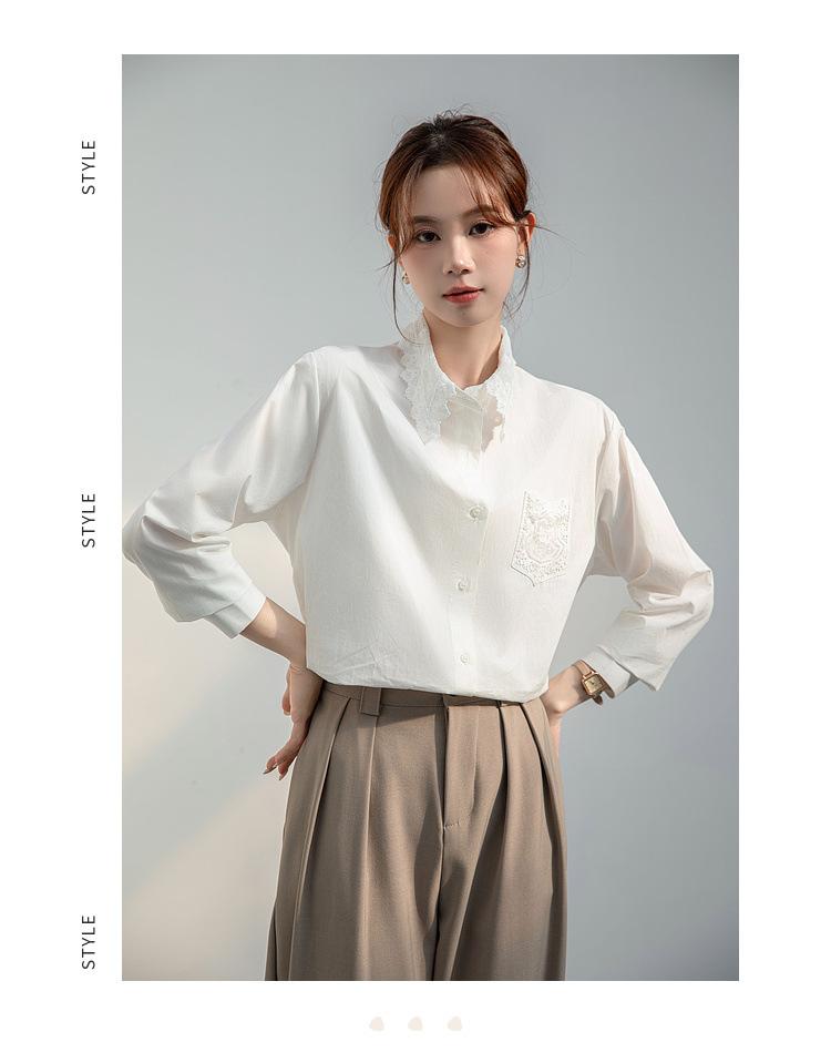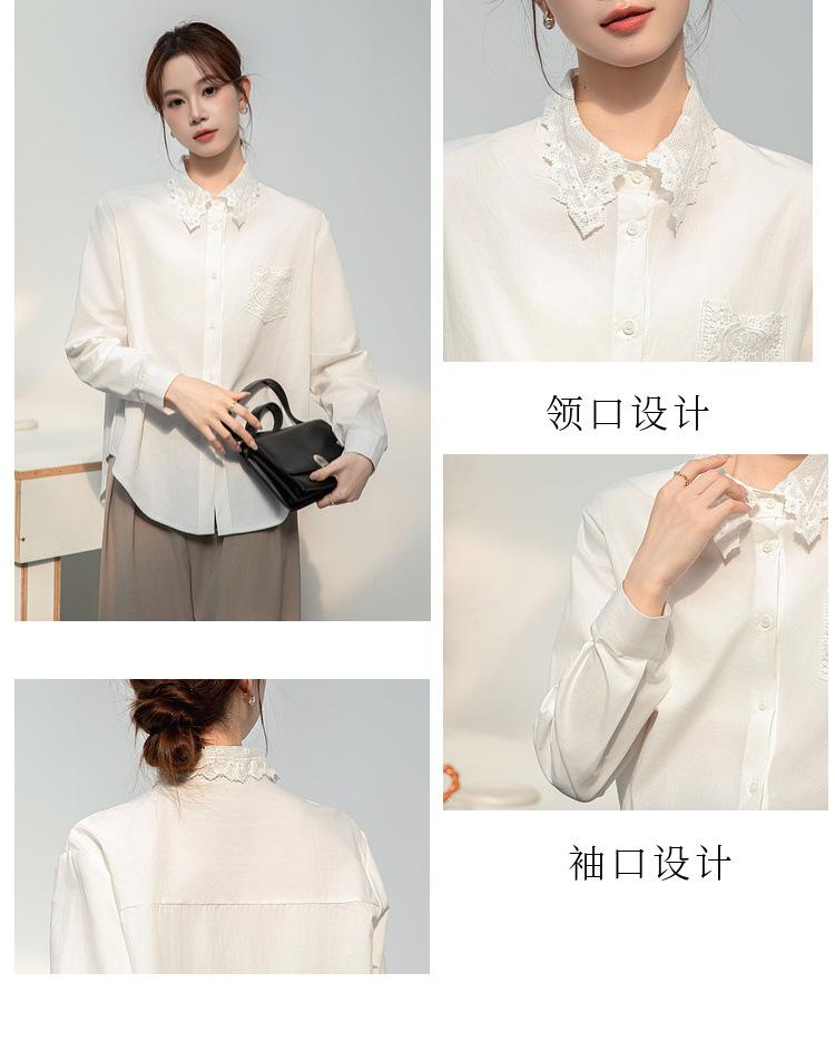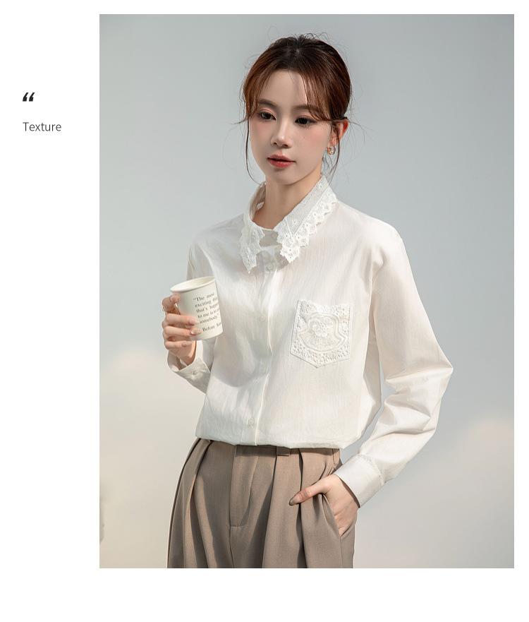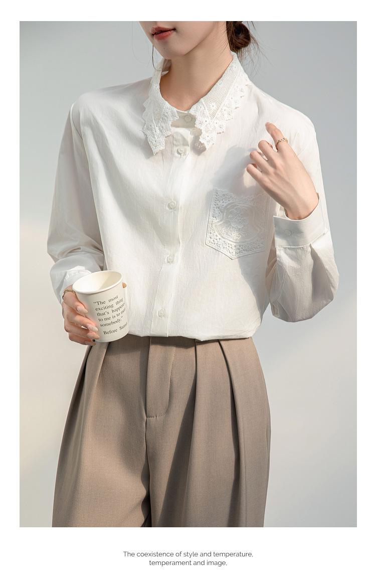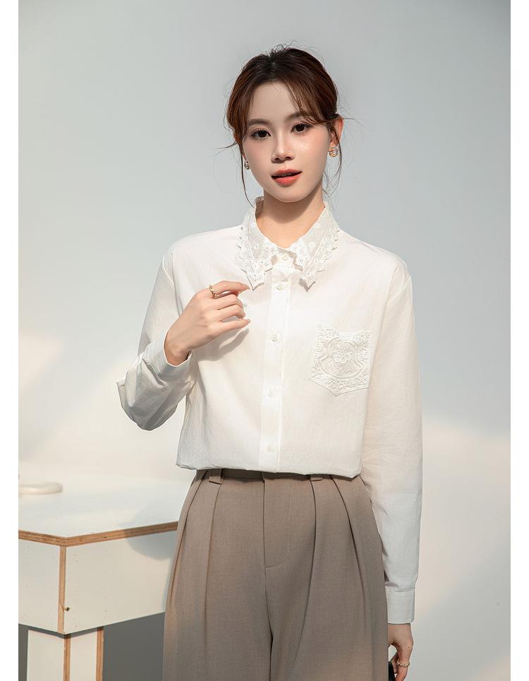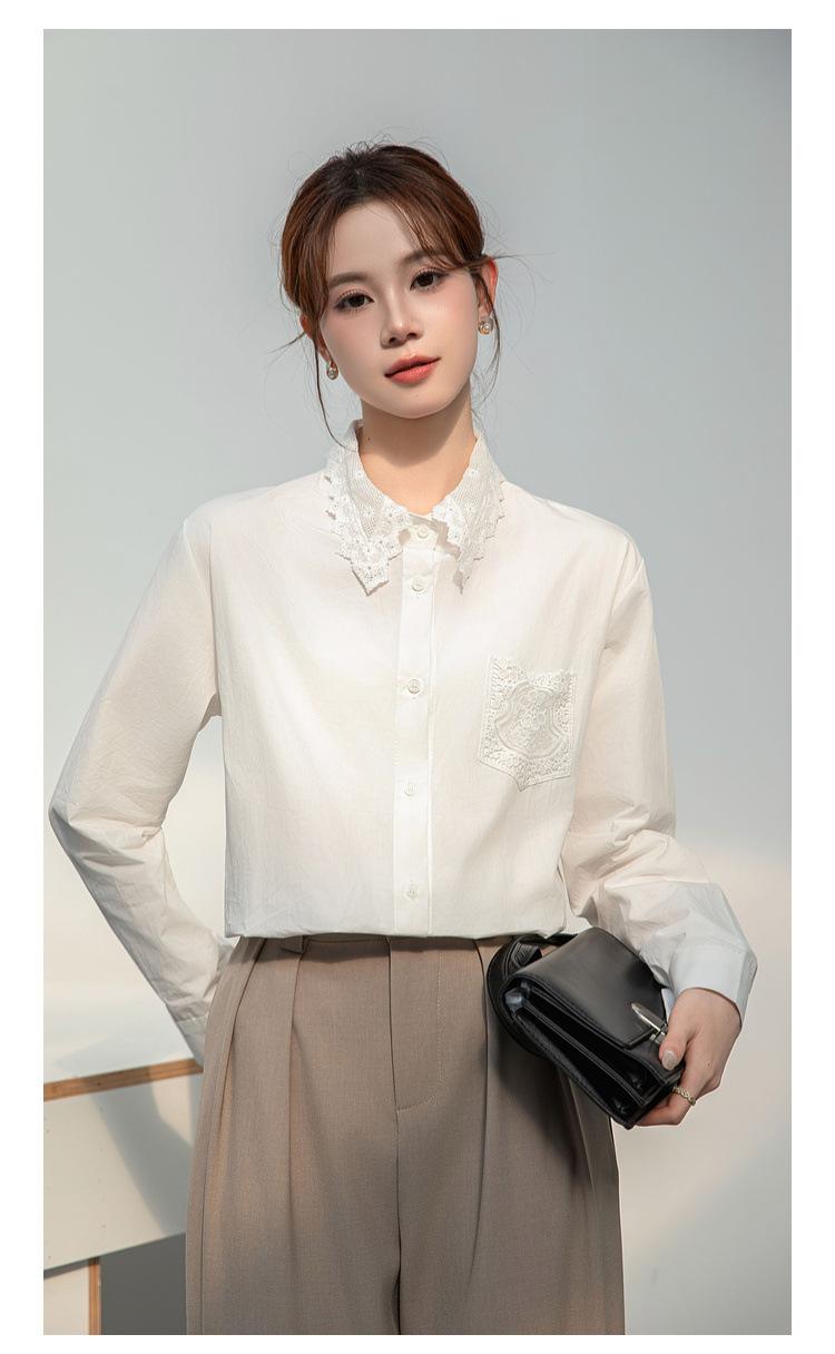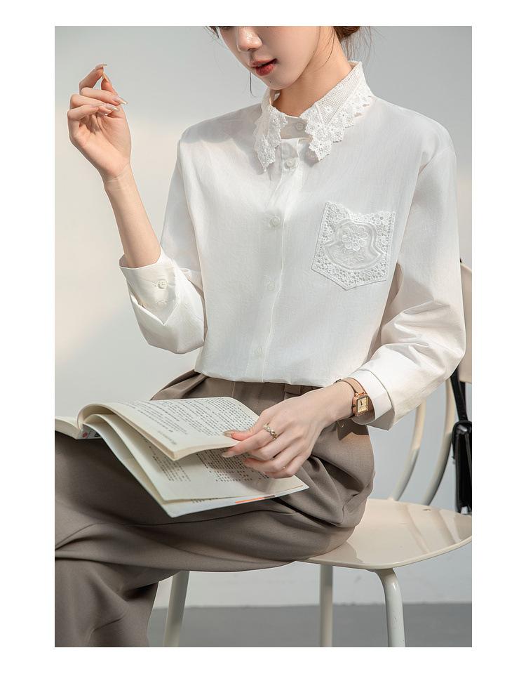 Camisa elegante de manga larga blanca con cuello bordado y encaje grueso para mujer, nueva moda coreana primavera 2025