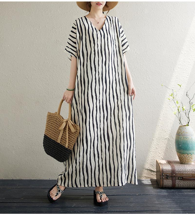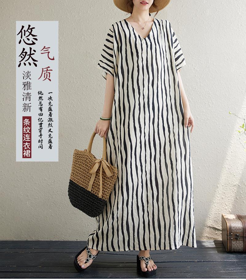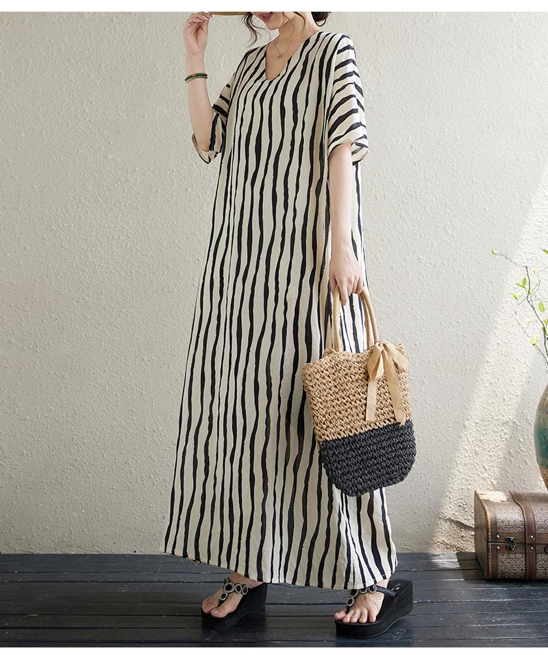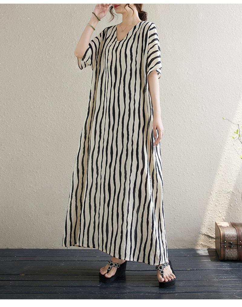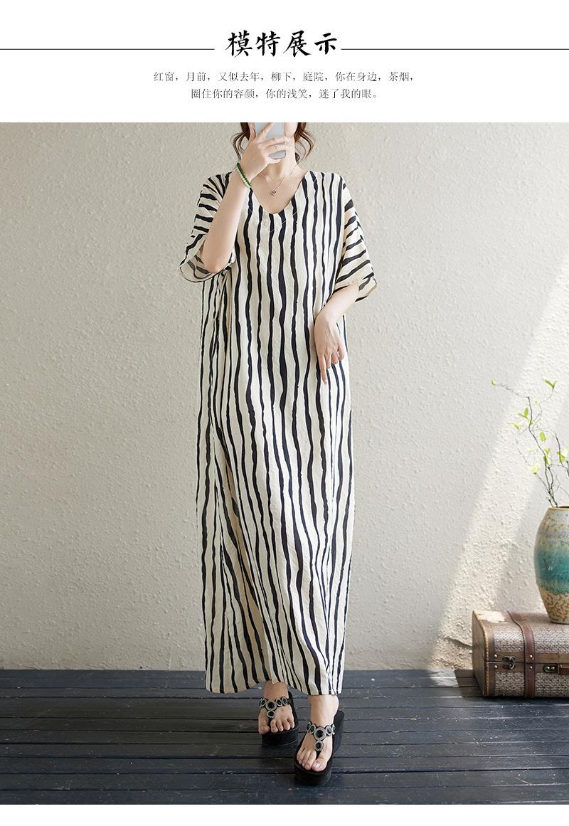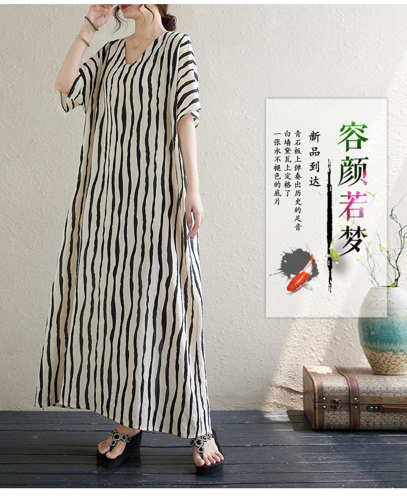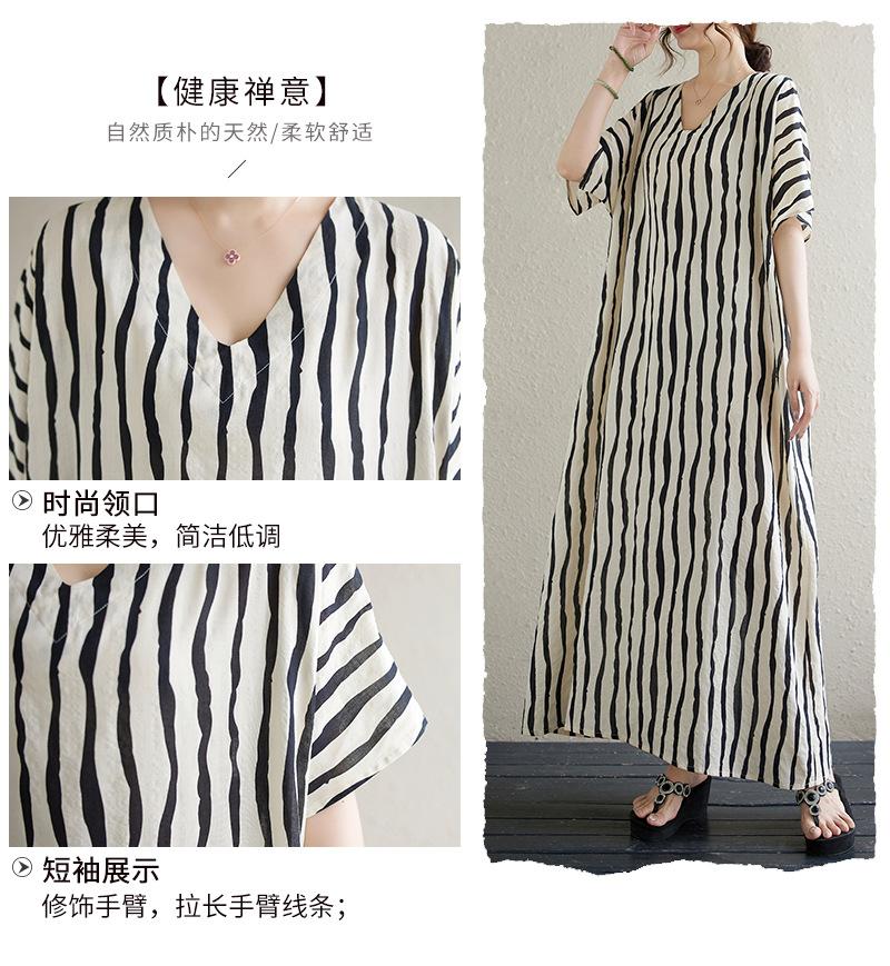 Bata de verano 2024 de algodón y lino, estilo retro, holgada, adelgazante, con escote en V y parte inferior blanca, a rayas verticales, para mujer