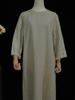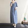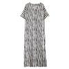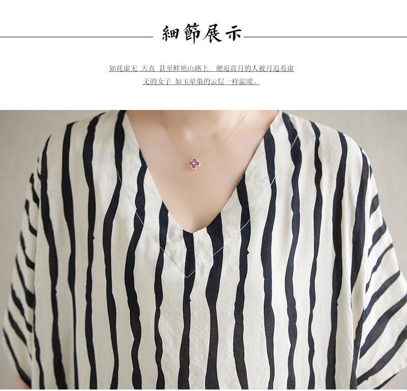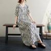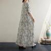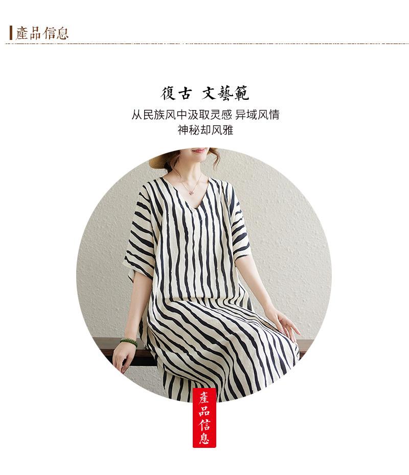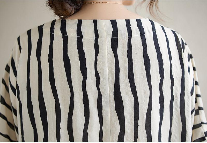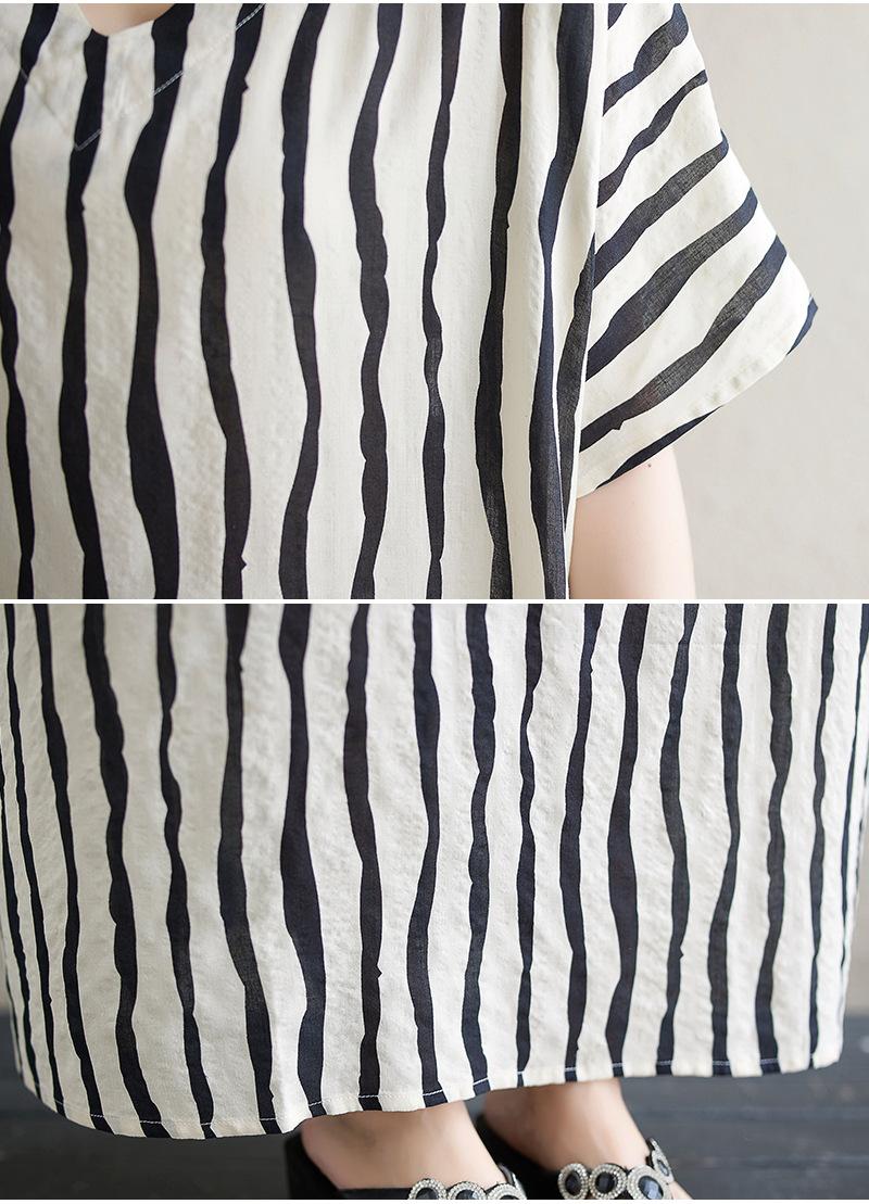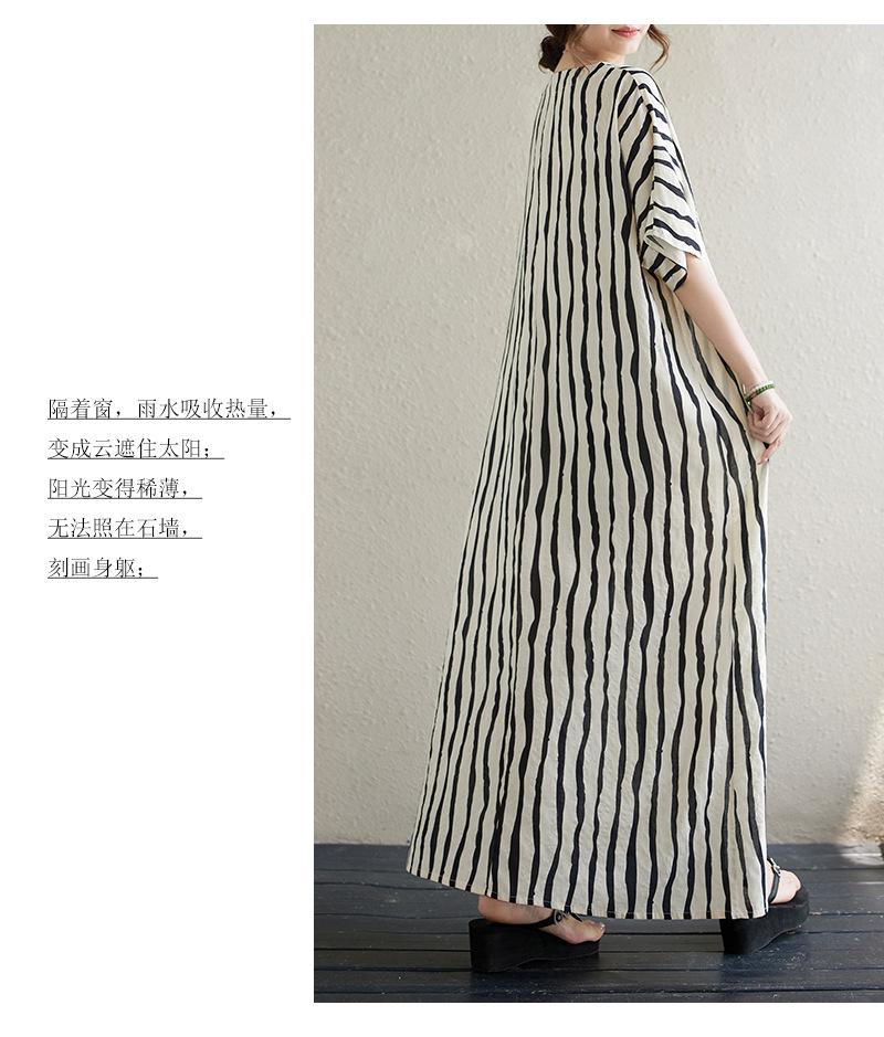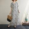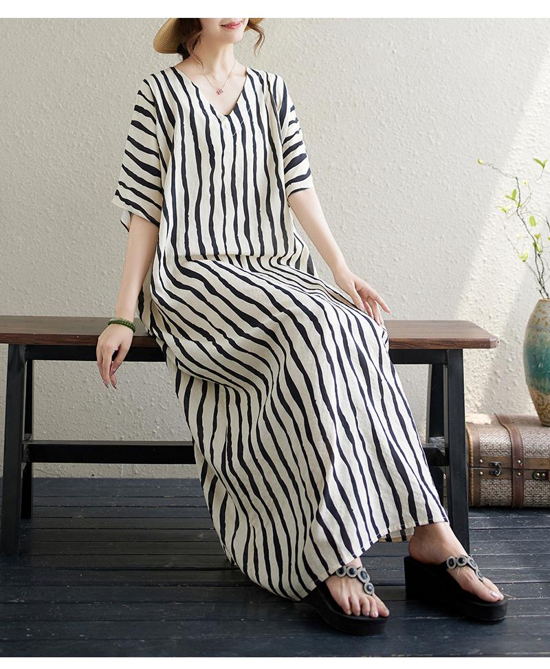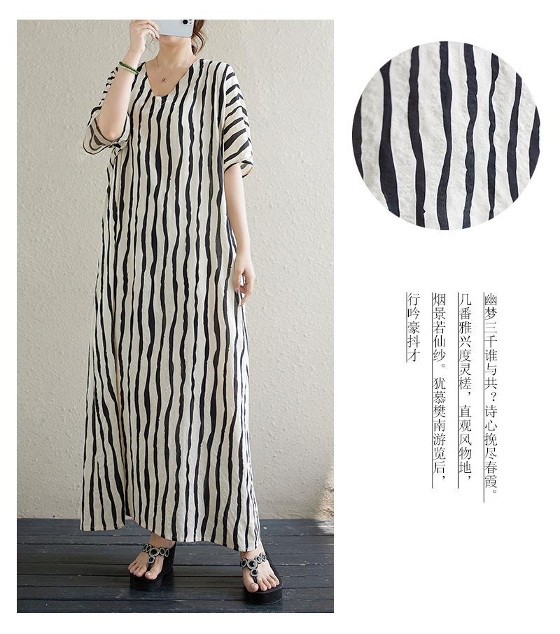 Bata de verano 2024 de algodón y lino, estilo retro, holgada, adelgazante, con escote en V y parte inferior blanca, a rayas verticales, para mujer