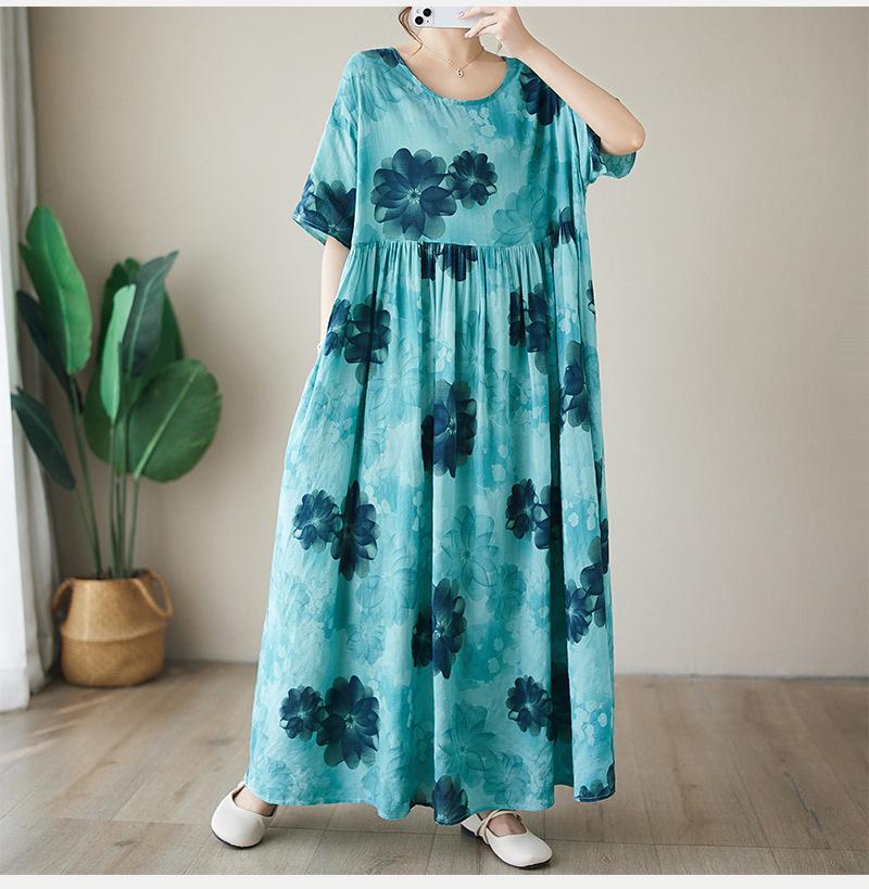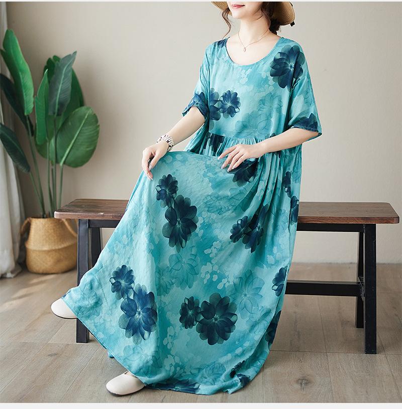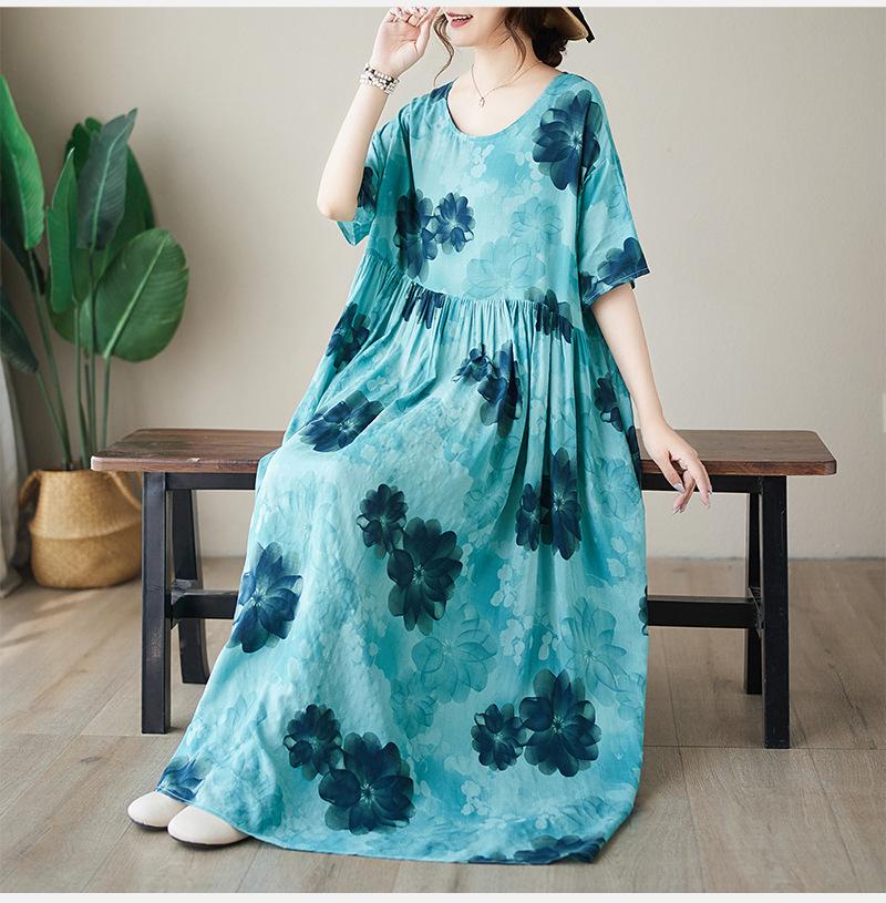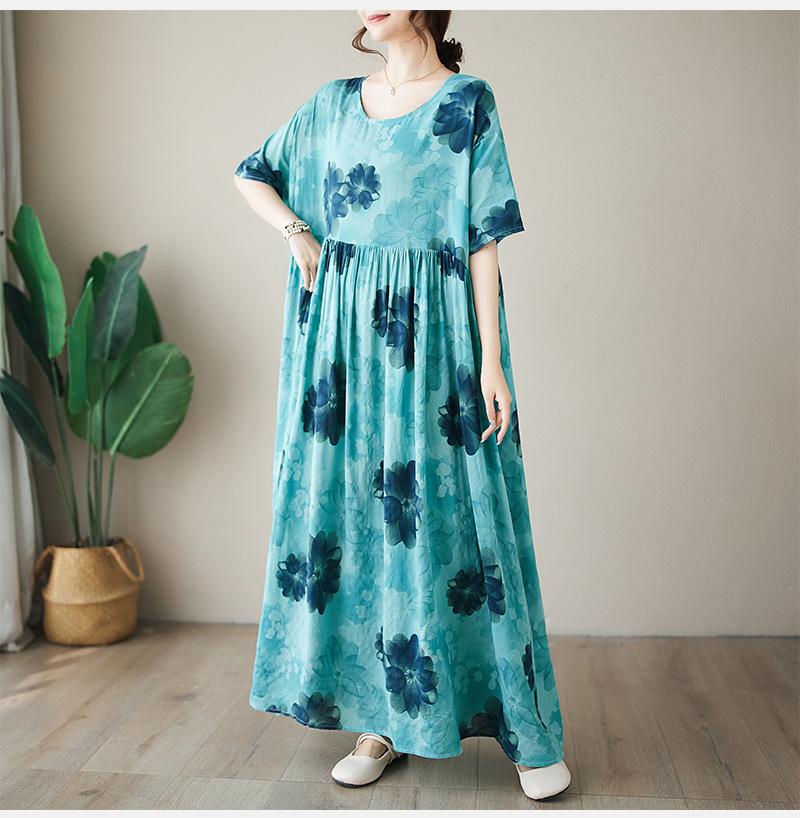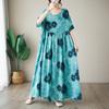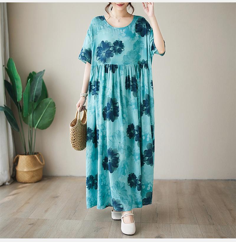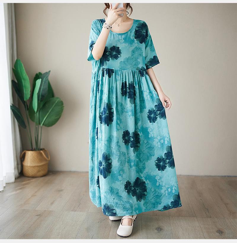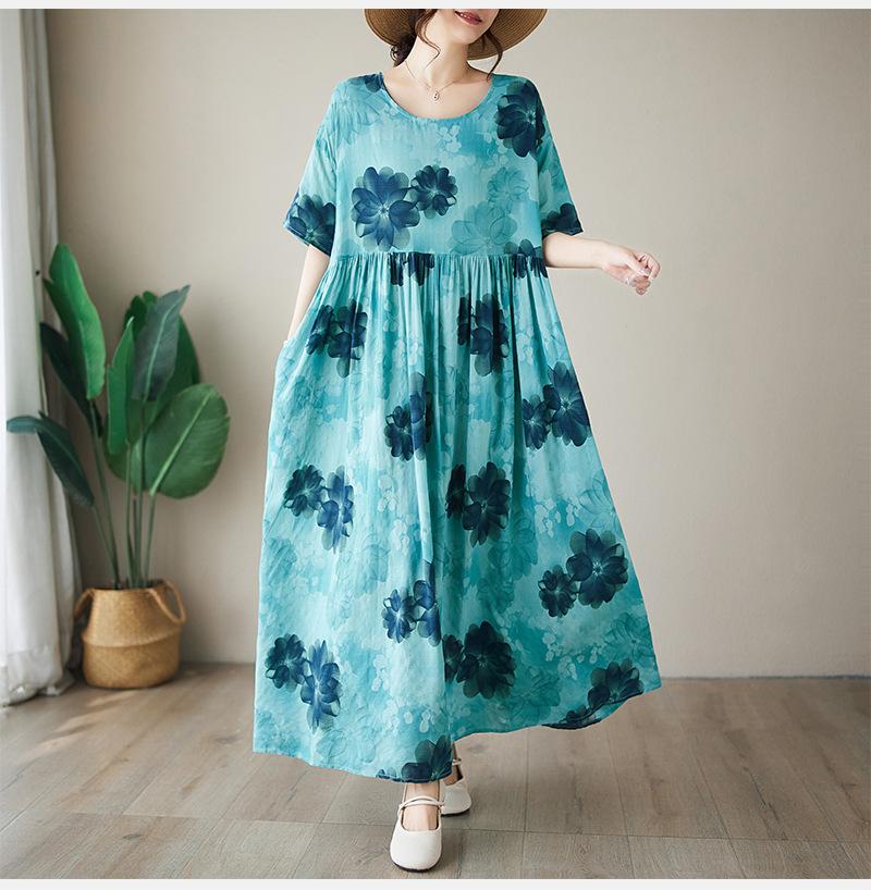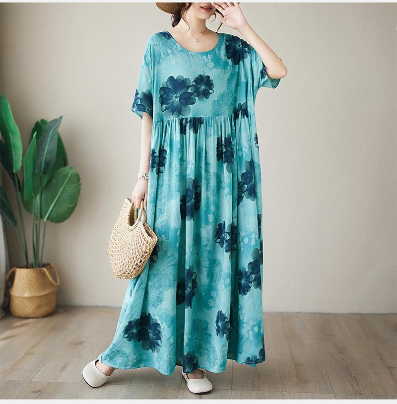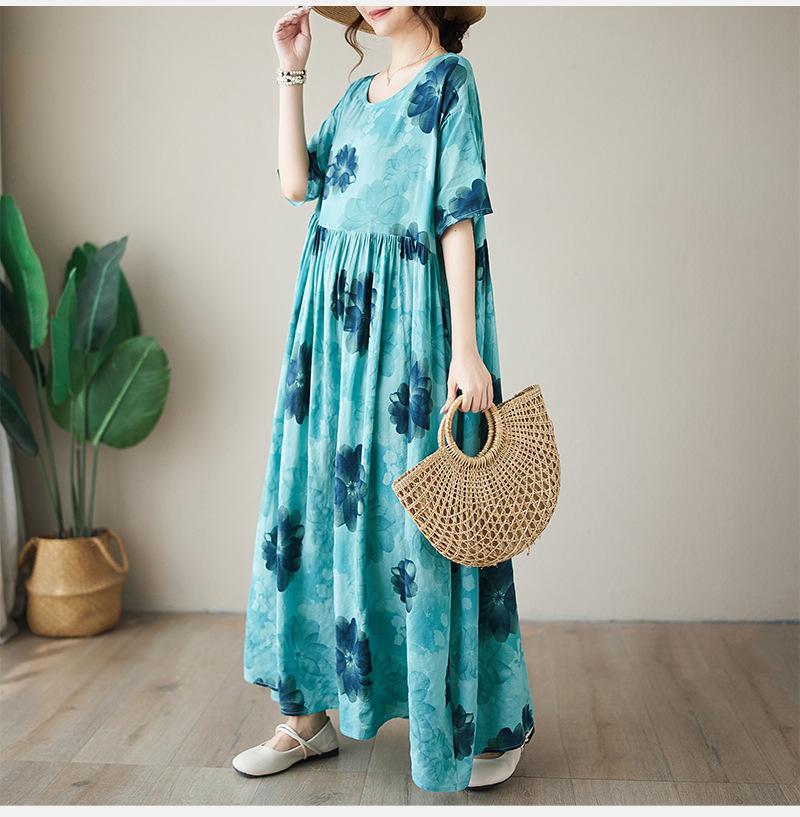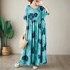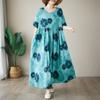 Vestido de verano 2024, nuevo, artístico, retro, suelto, bohemio, de manga corta, cuello redondo, estampado, de longitud media, para mujer