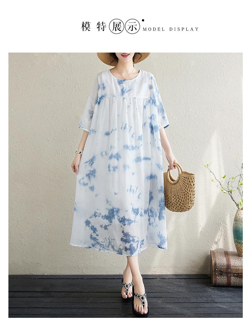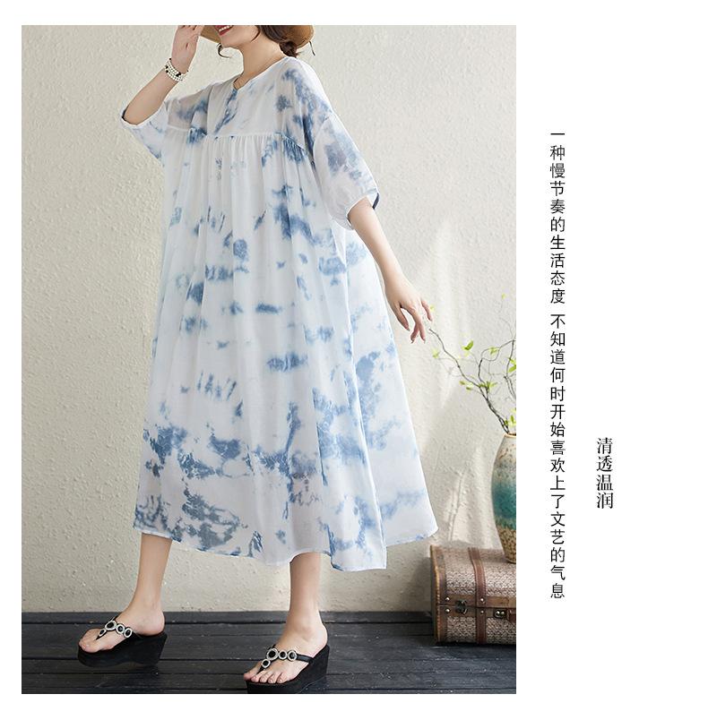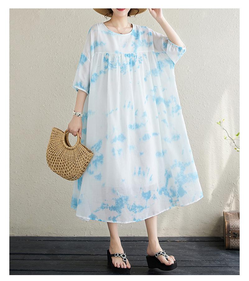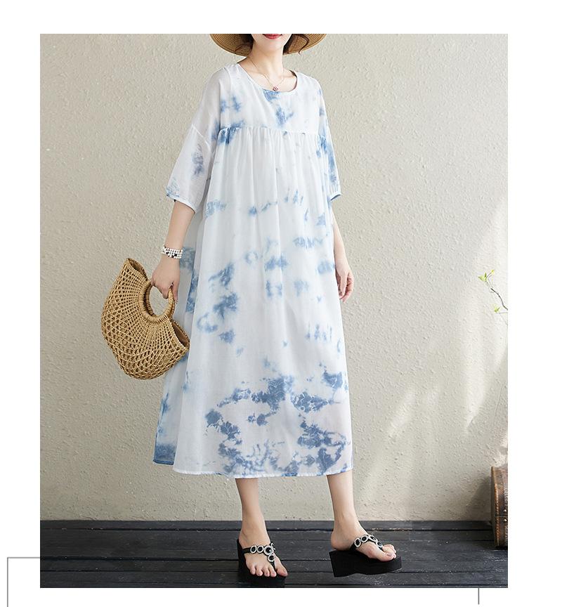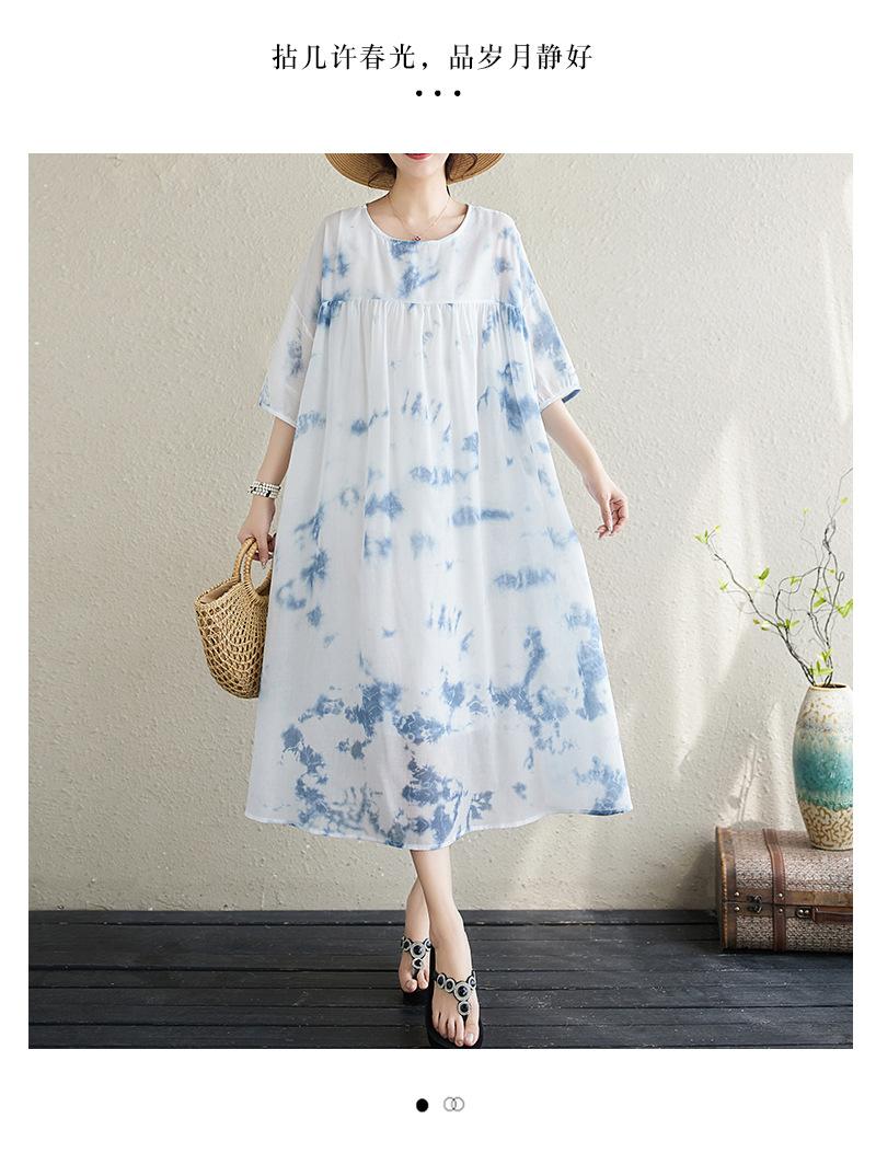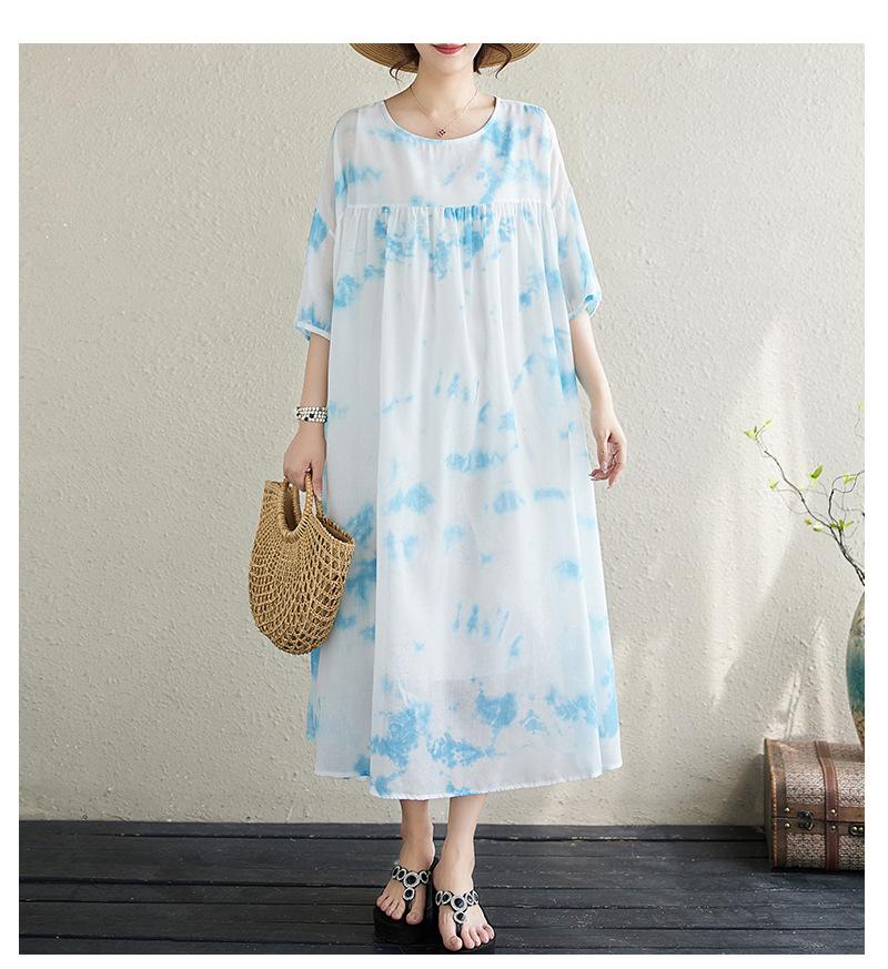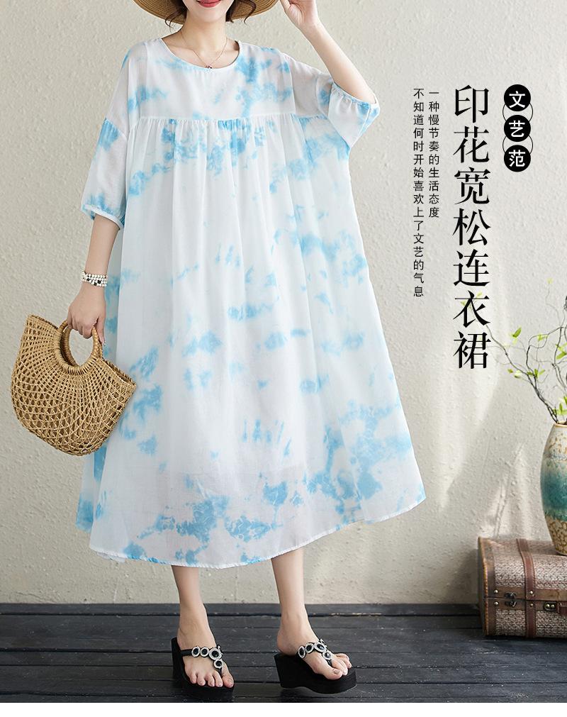 Vestido de verano 2024 de algodón y lino con efecto tie-dye artístico, suelto, de cuello redondo y longitud media para mujer