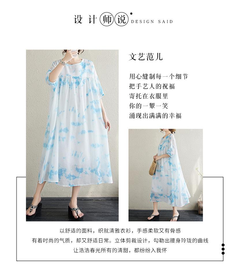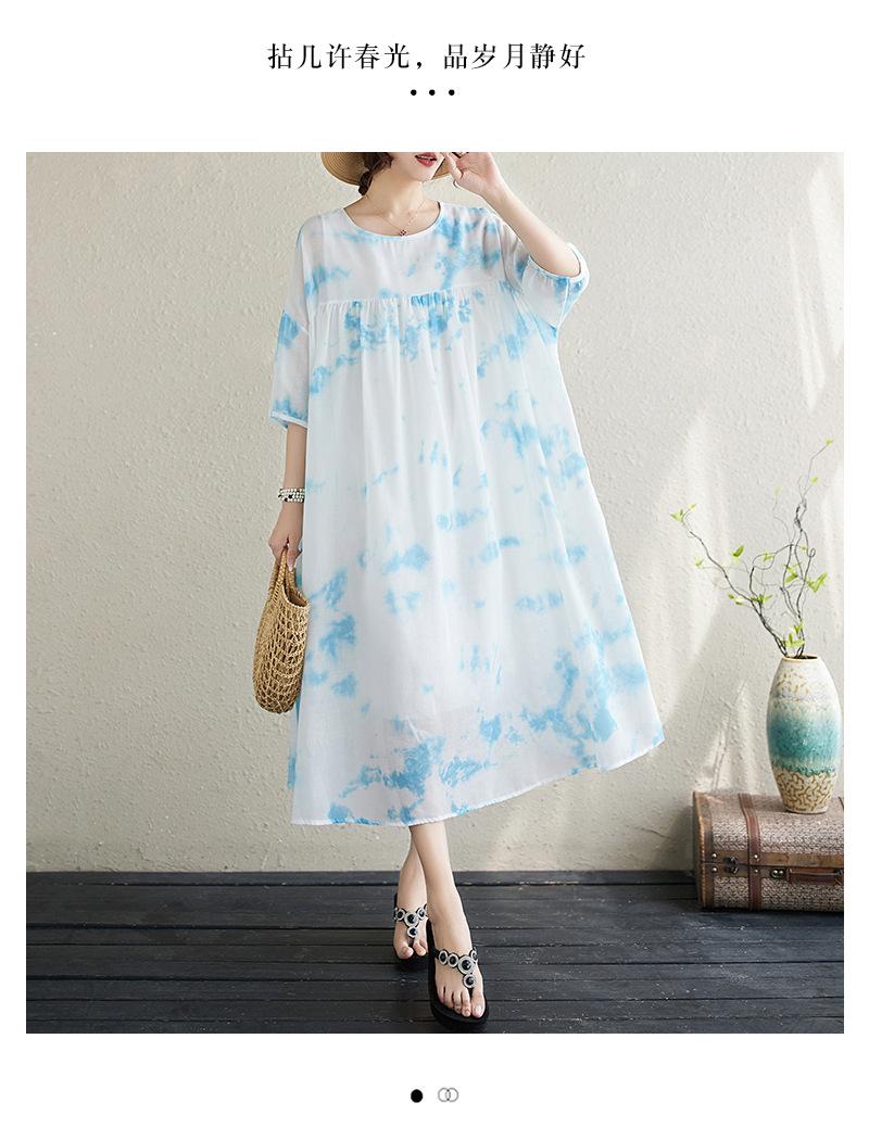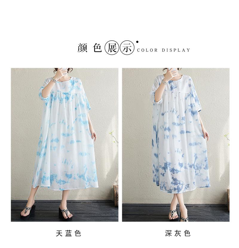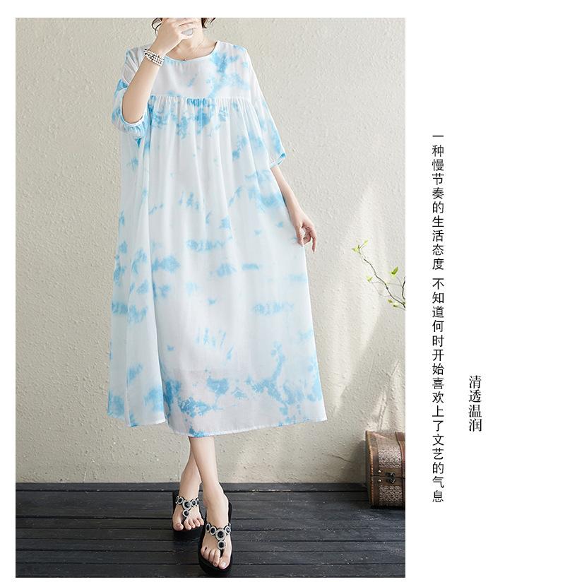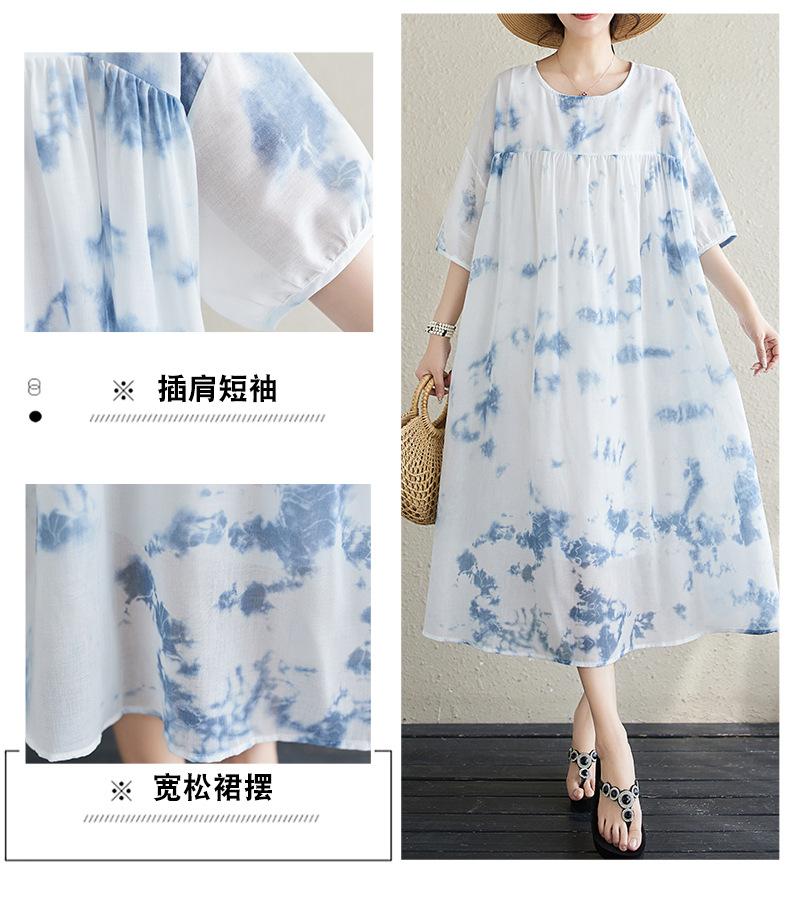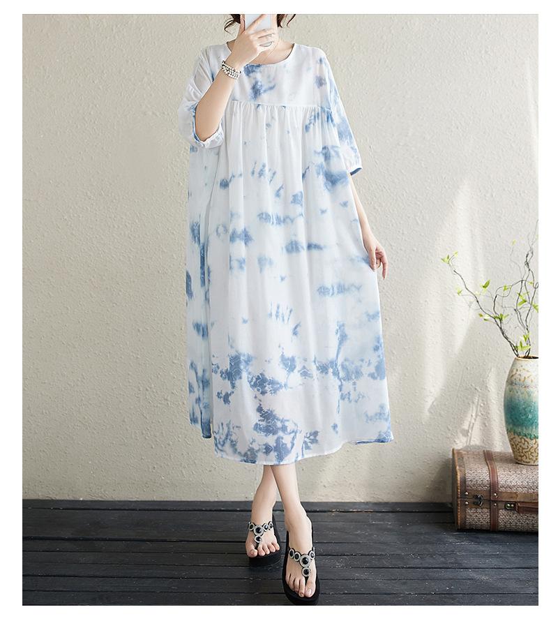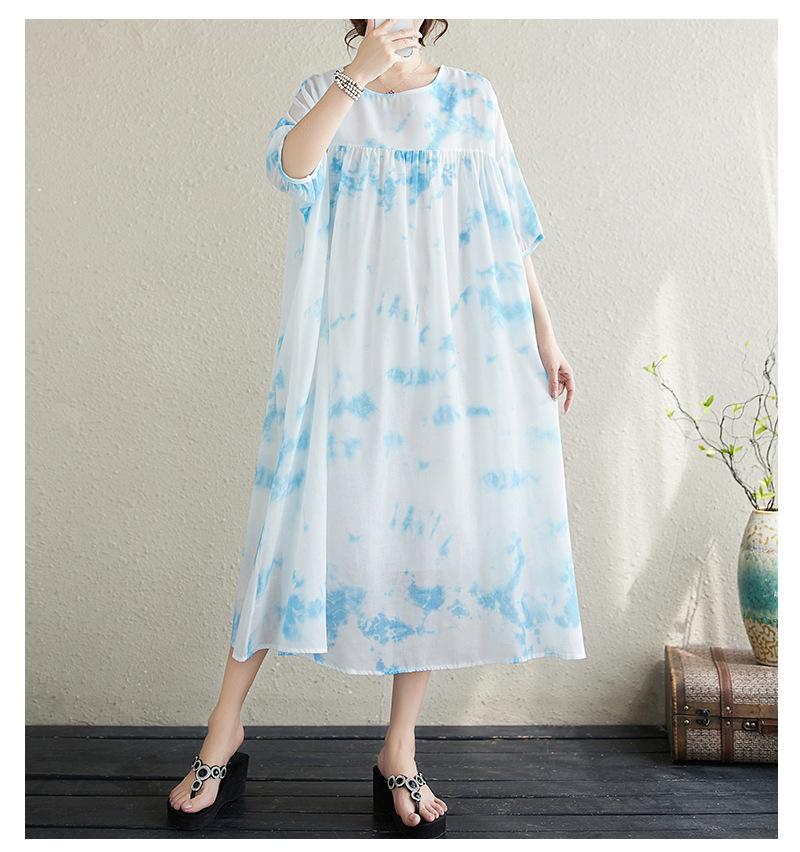 Vestido de verano 2024 de algodón y lino con efecto tie-dye artístico, suelto, de cuello redondo y longitud media para mujer