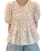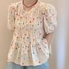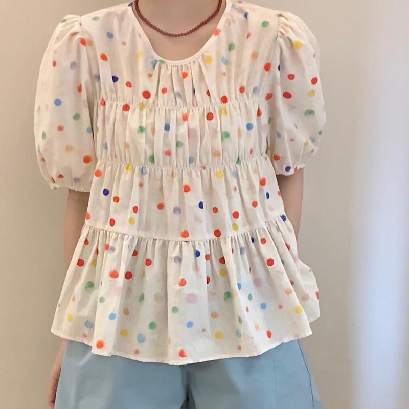 Camisa Colorida de Lunares con Manga Abullonada para Mujer 2023 Verano Nuevo Estilo Coreano Cuello Redondo Plisada Holgada Look Adelgazante Top Babydoll
