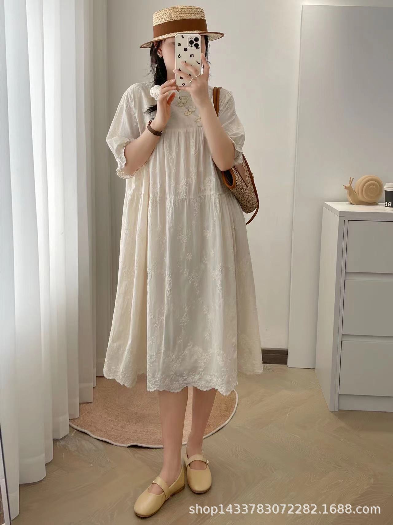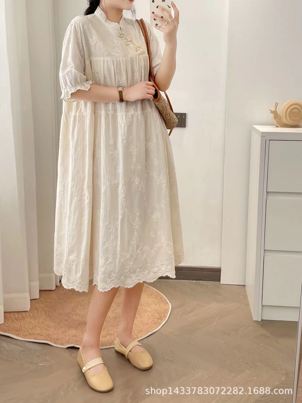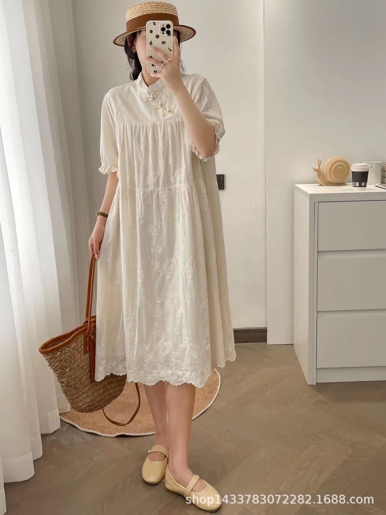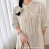 Nuevo vestido estilo chino nacional vintage con hebilla, botonadura inclinada, manga corta, cheongsam modificado, cuello pequeño, bordado, vestido midi suelto