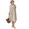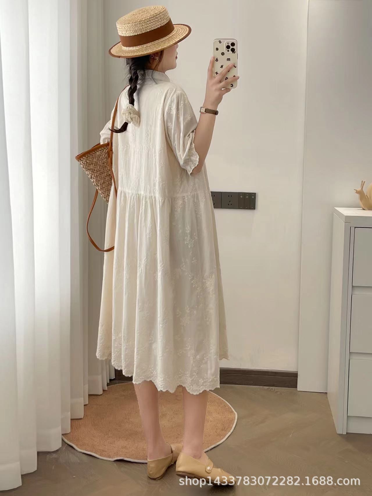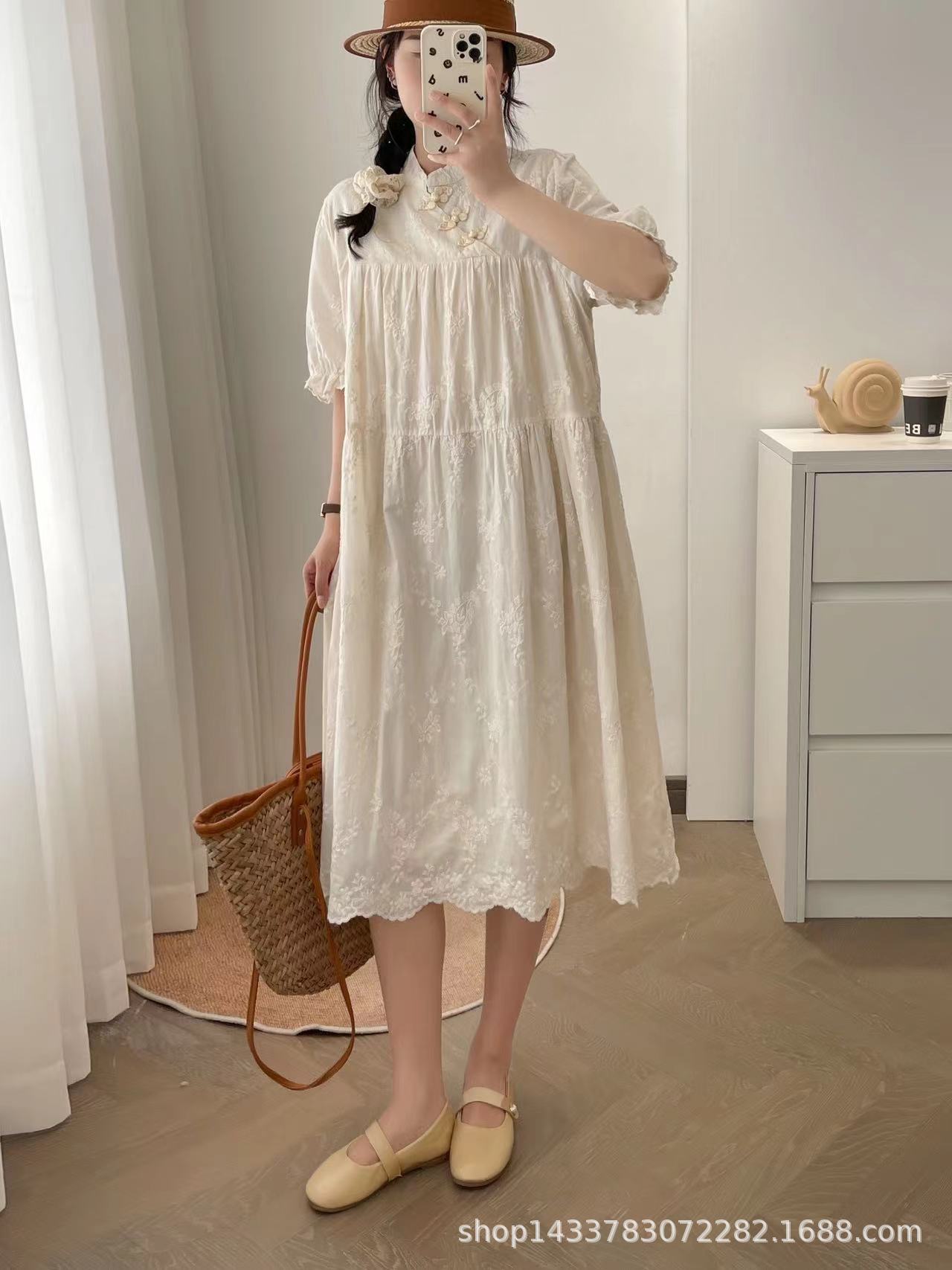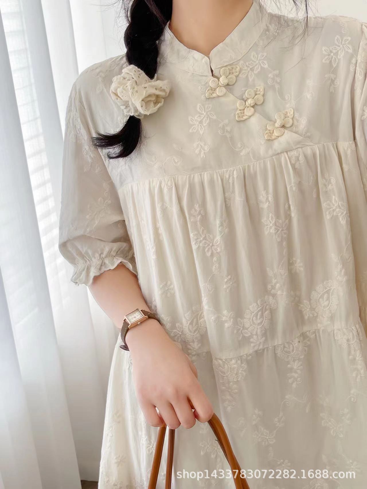 Nuevo vestido estilo chino nacional vintage con hebilla, botonadura inclinada, manga corta, cheongsam modificado, cuello pequeño, bordado, vestido midi suelto
