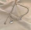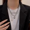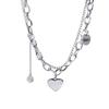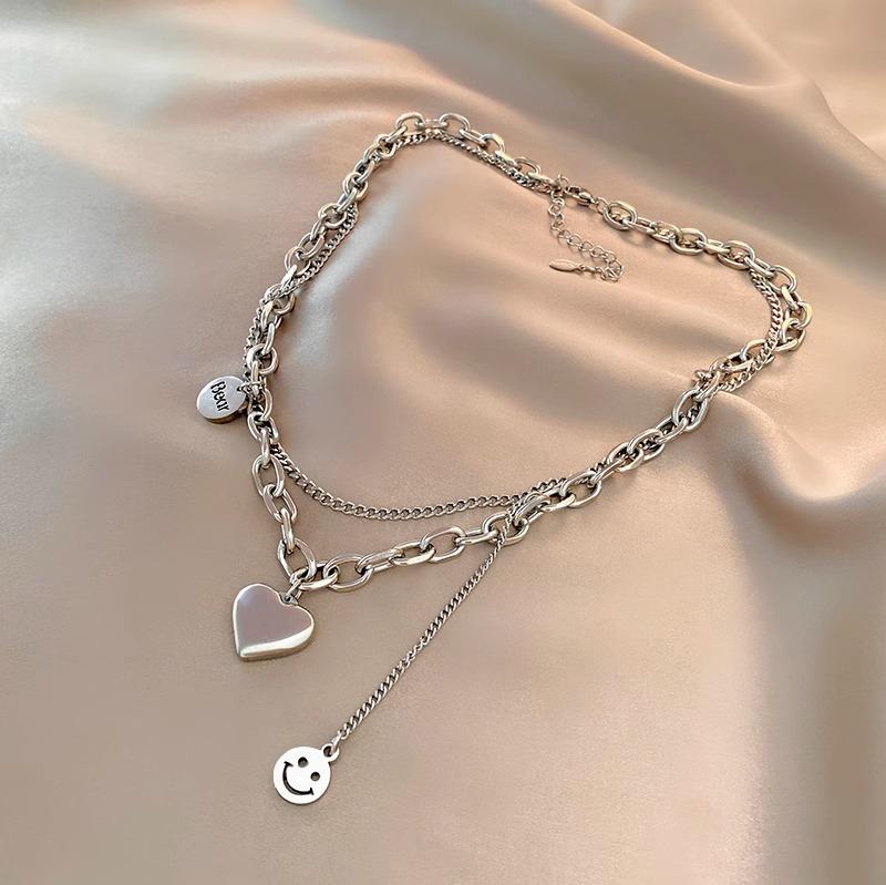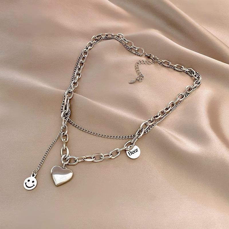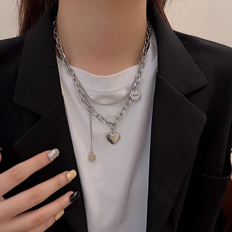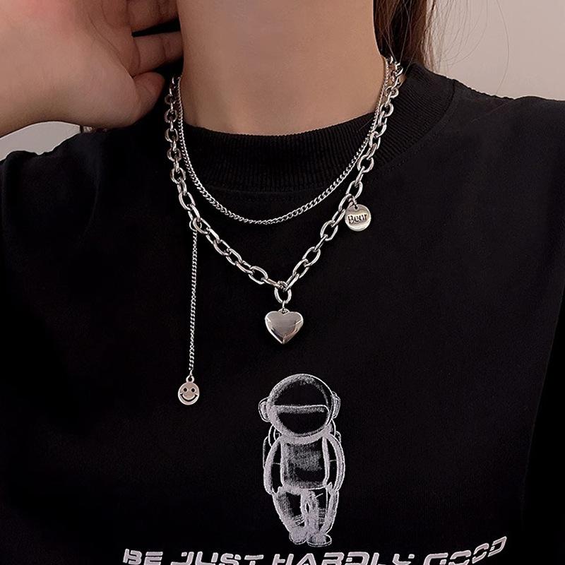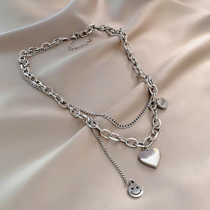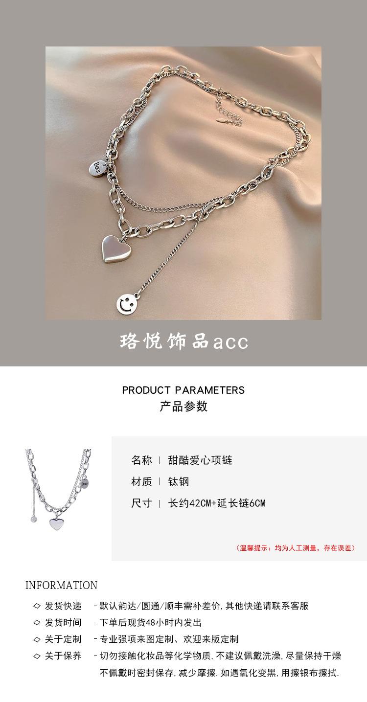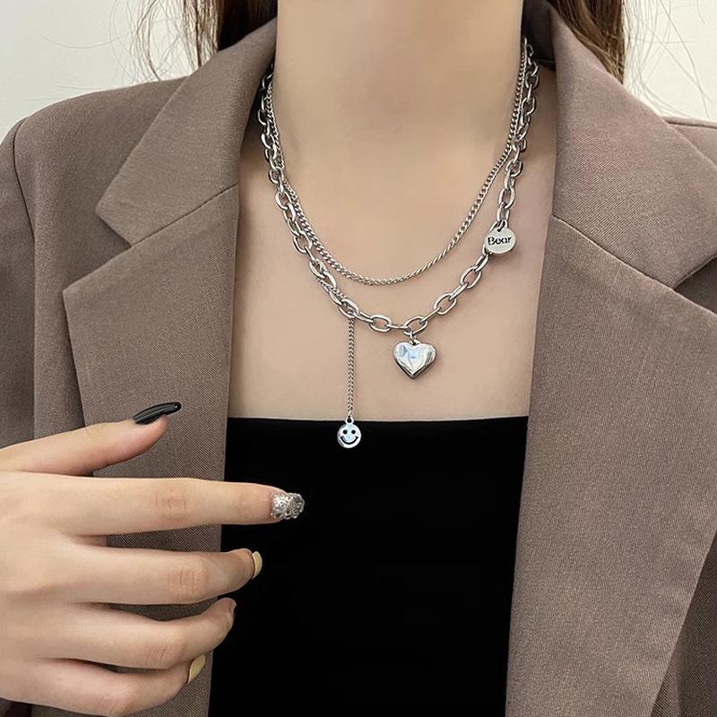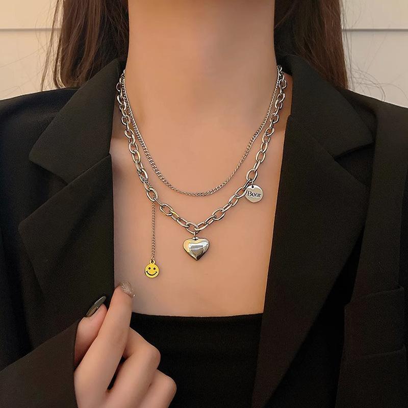 Collar de acero de titanio de doble capa con forma de corazón para mujer, estilo hip hop, cadena de clavícula que combina con todo, accesorios colgantes con cara sonriente de alta calidad.