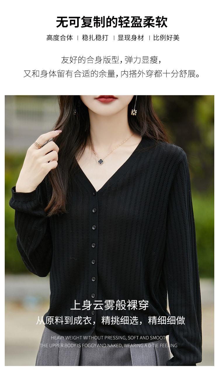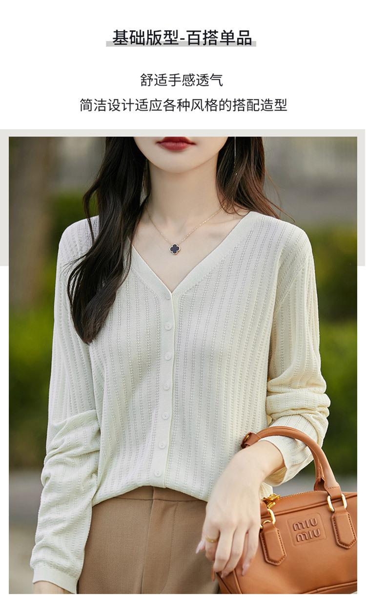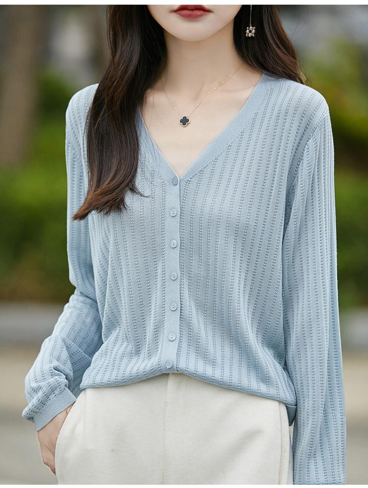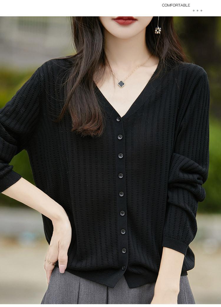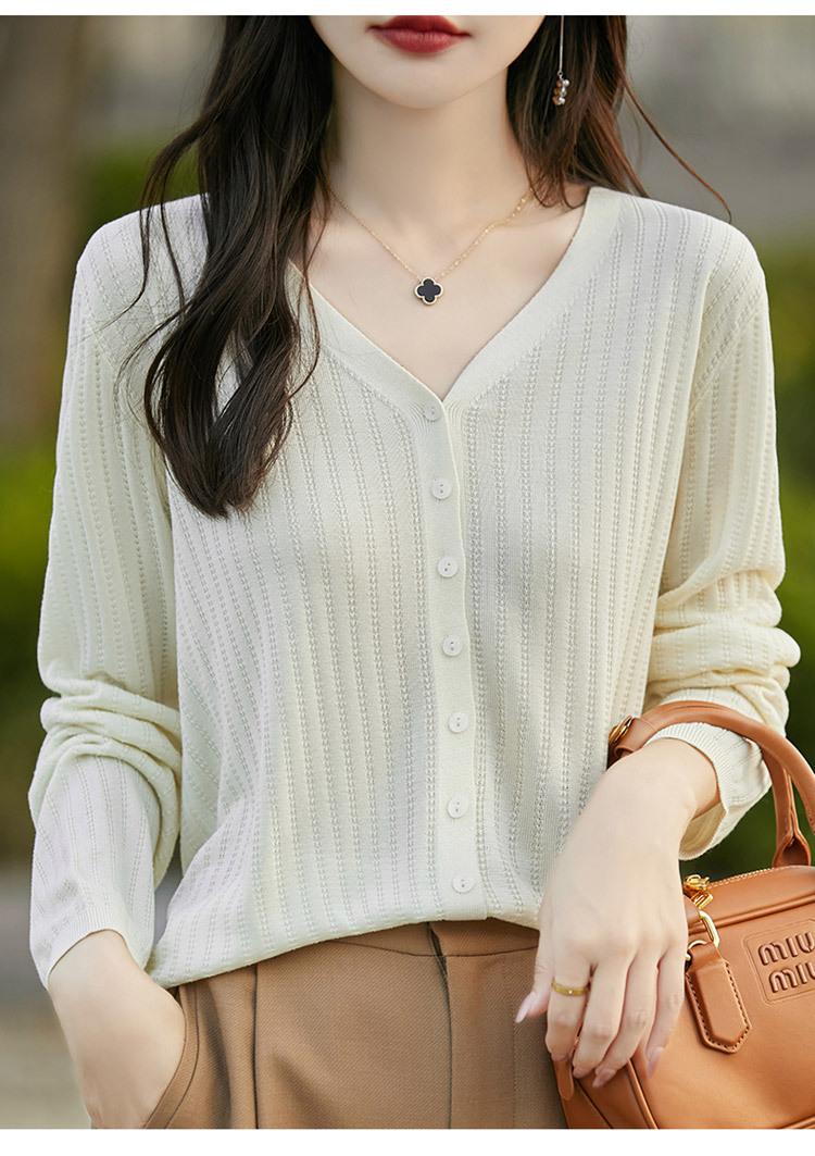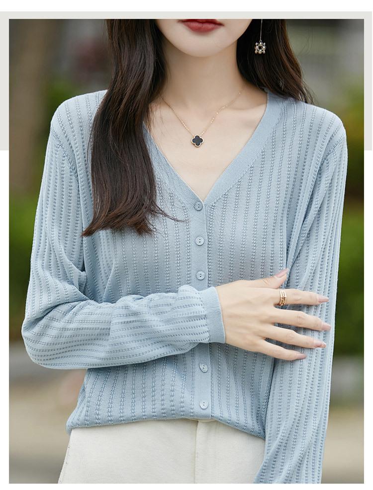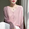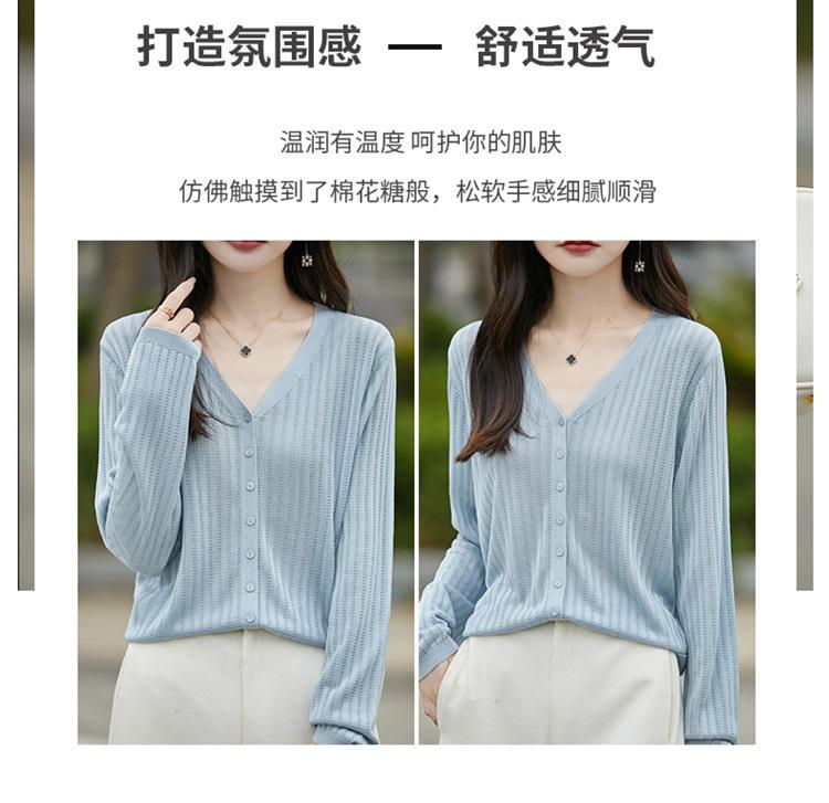 Cárdigan de Punto de Manga Larga de Seda Helada con Cuello en V para Mujer Transfronterizo Color Puro Calado Crochet Top Exterior Holgado Protección Solar