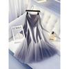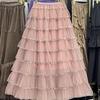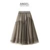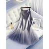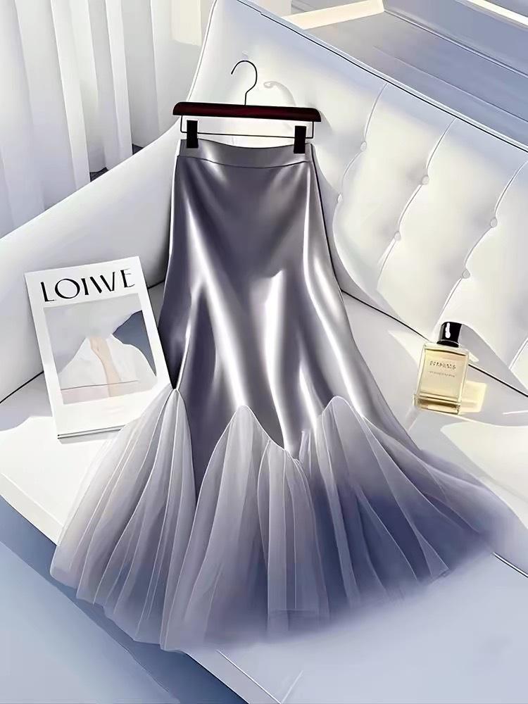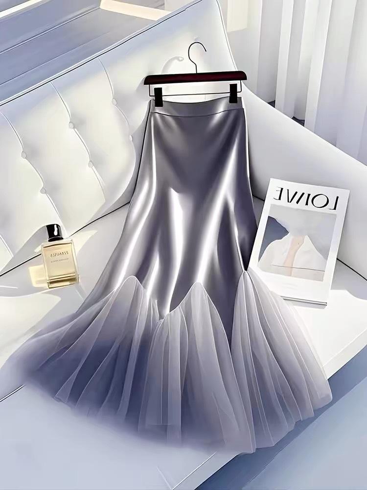 Falda de satén gris de este año 2025, principios de la primavera, cintura alta, drapeado, súper hada, falda larga con costuras de malla de hada