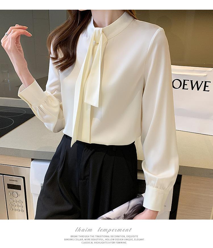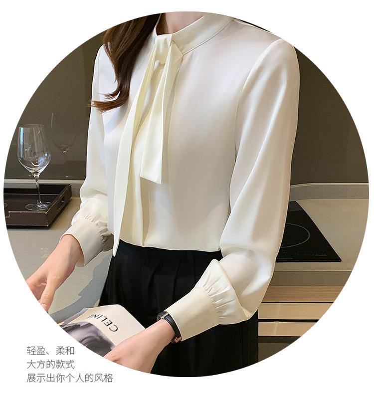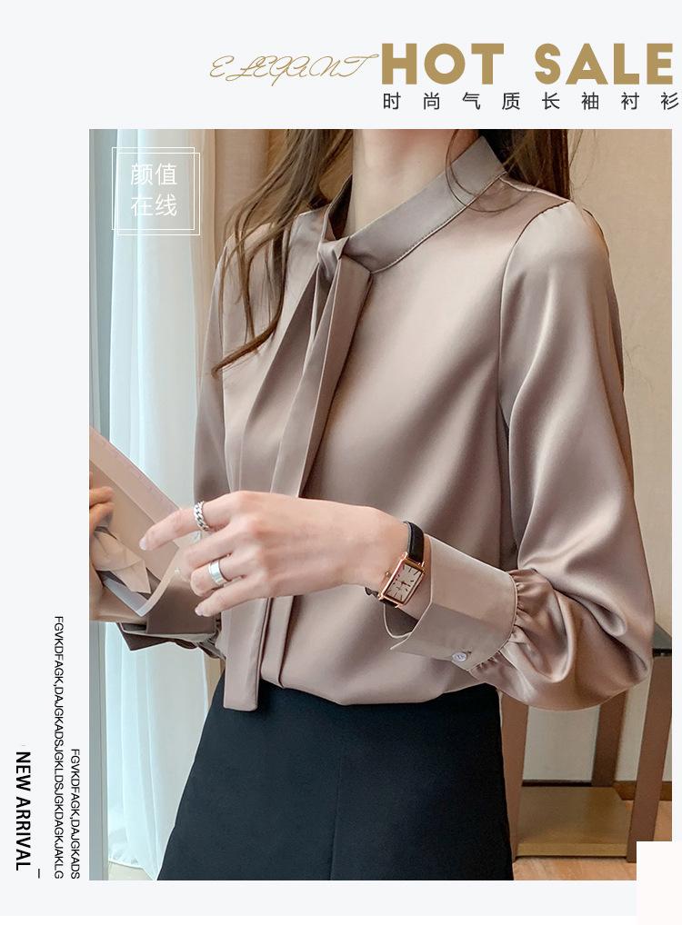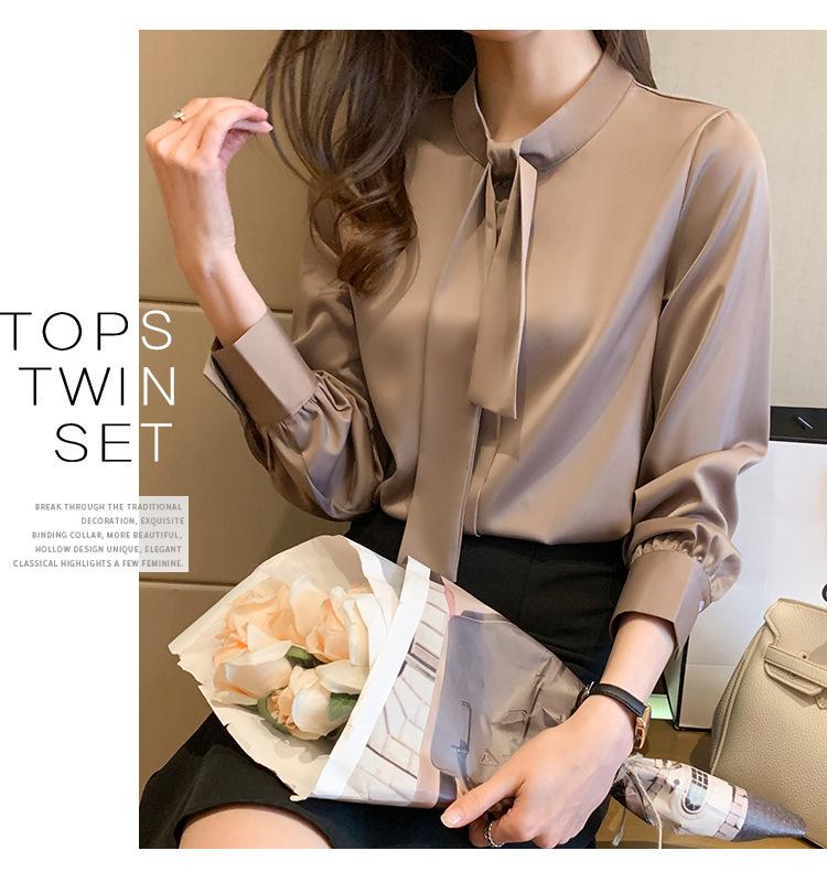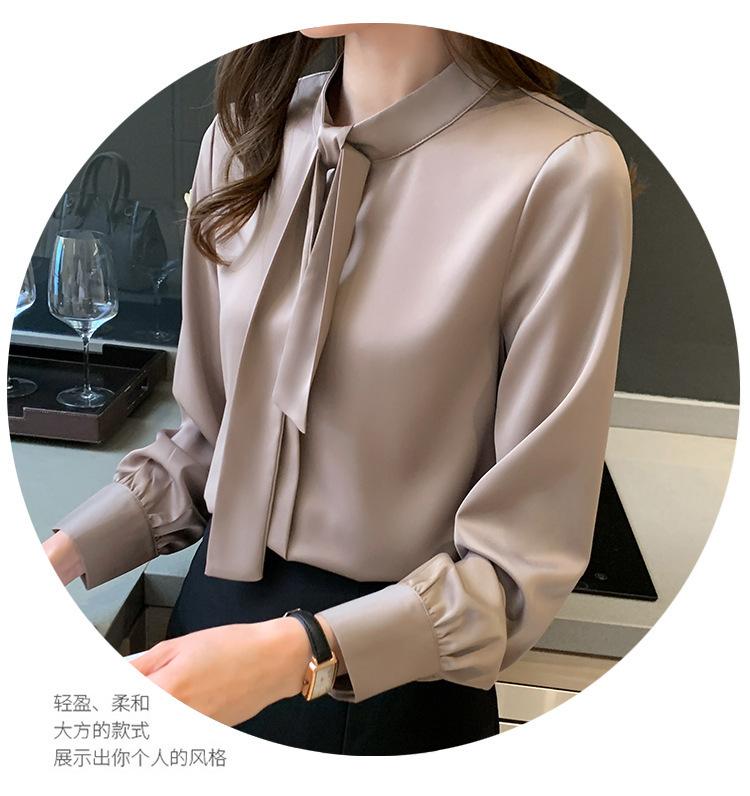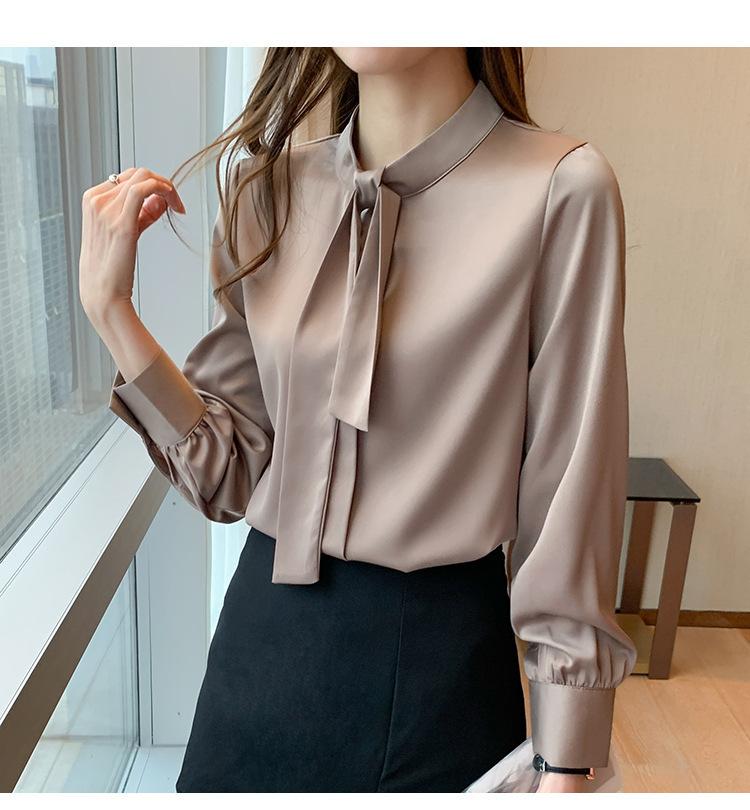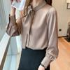 Camisa de mujer de manga larga, nueva llegada de primavera y otoño 2022, elegante blusa de satén con cinta en color liso y ácido acético.