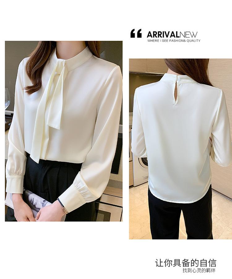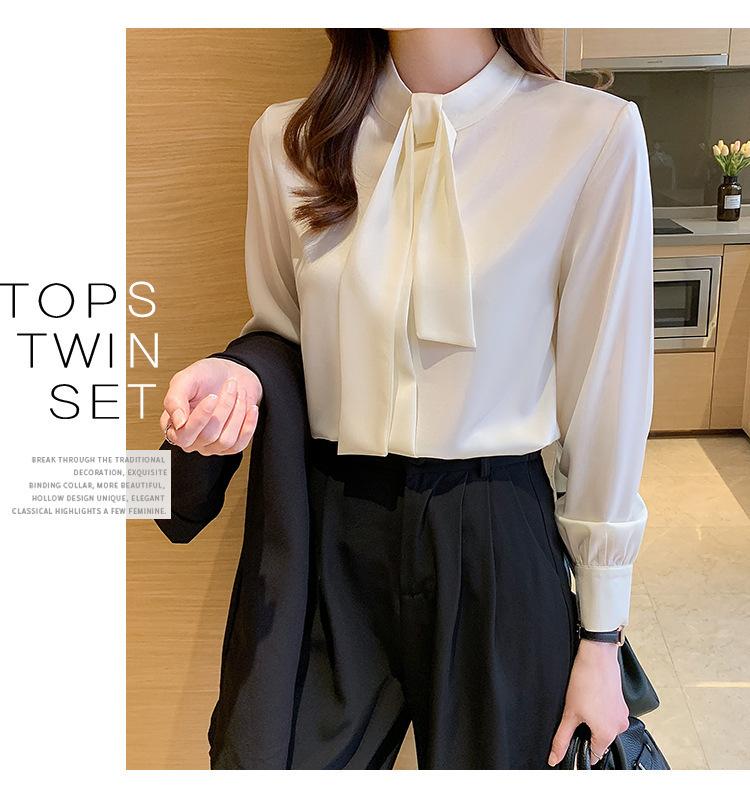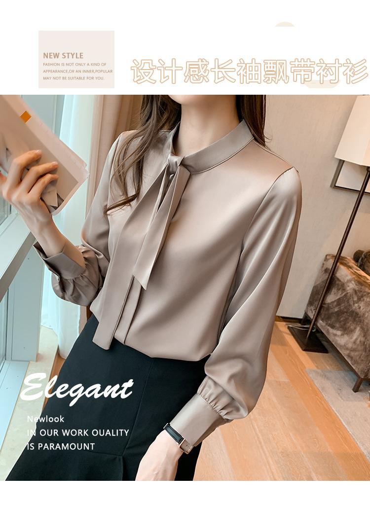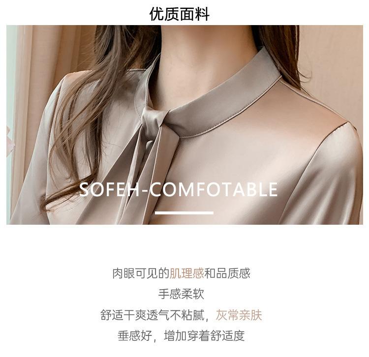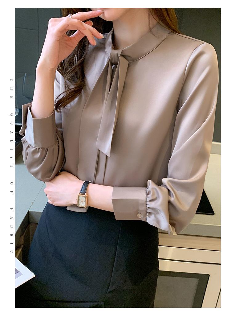 Camisa de mujer de manga larga, nueva llegada de primavera y otoño 2022, elegante blusa de satén con cinta en color liso y ácido acético.