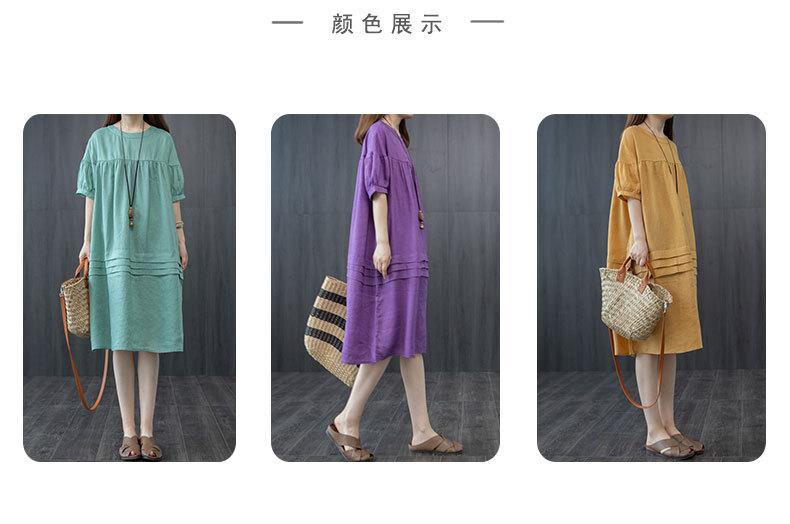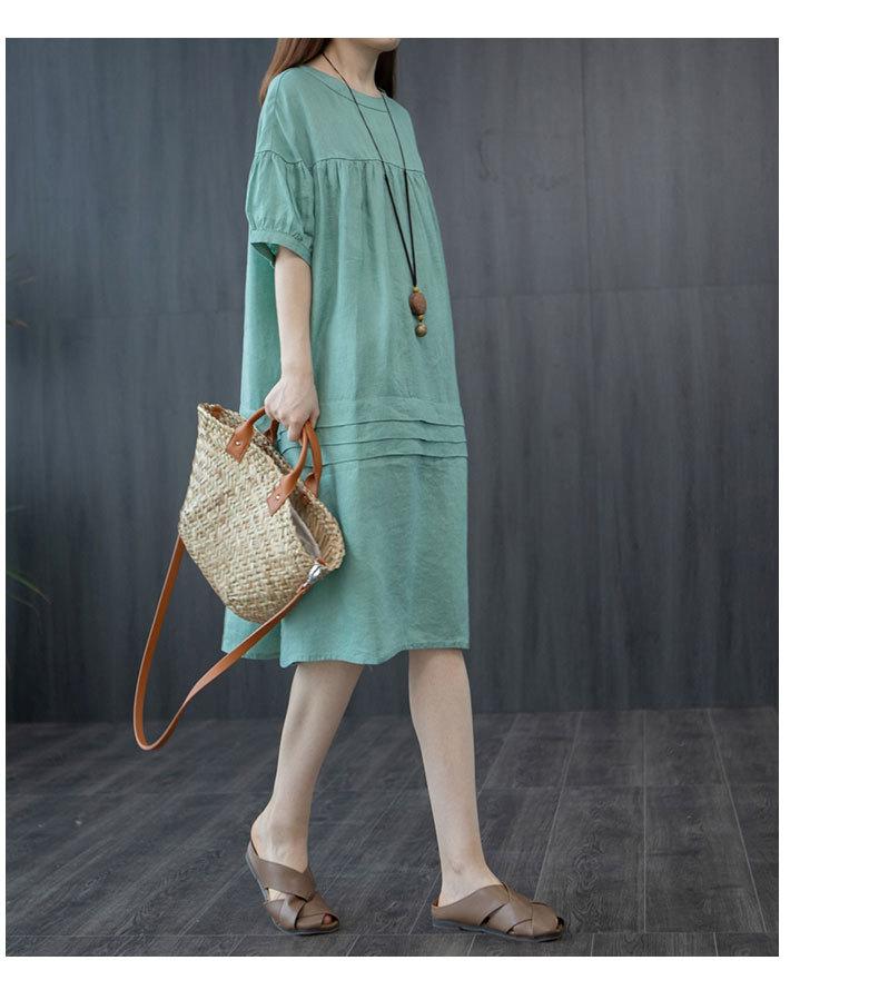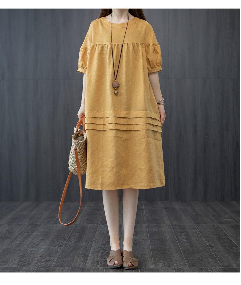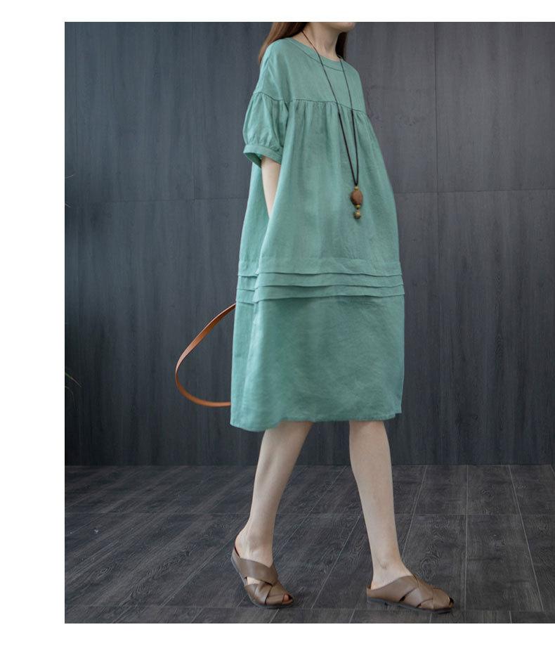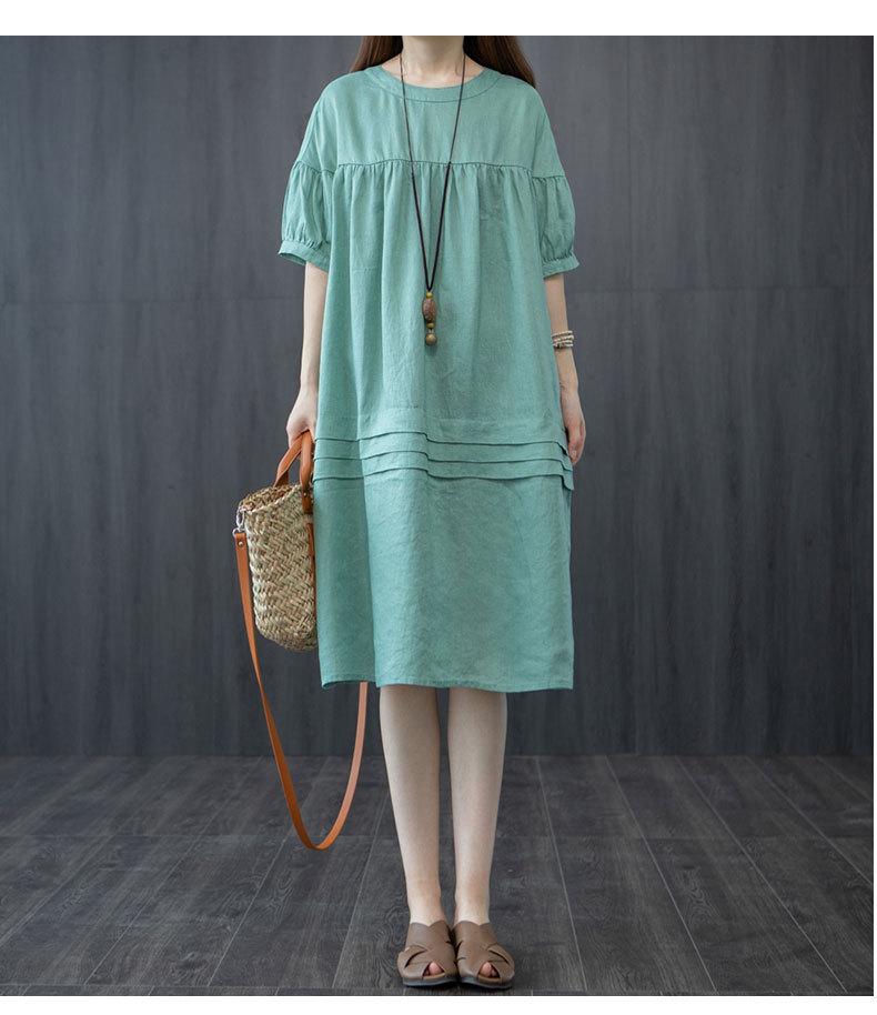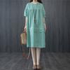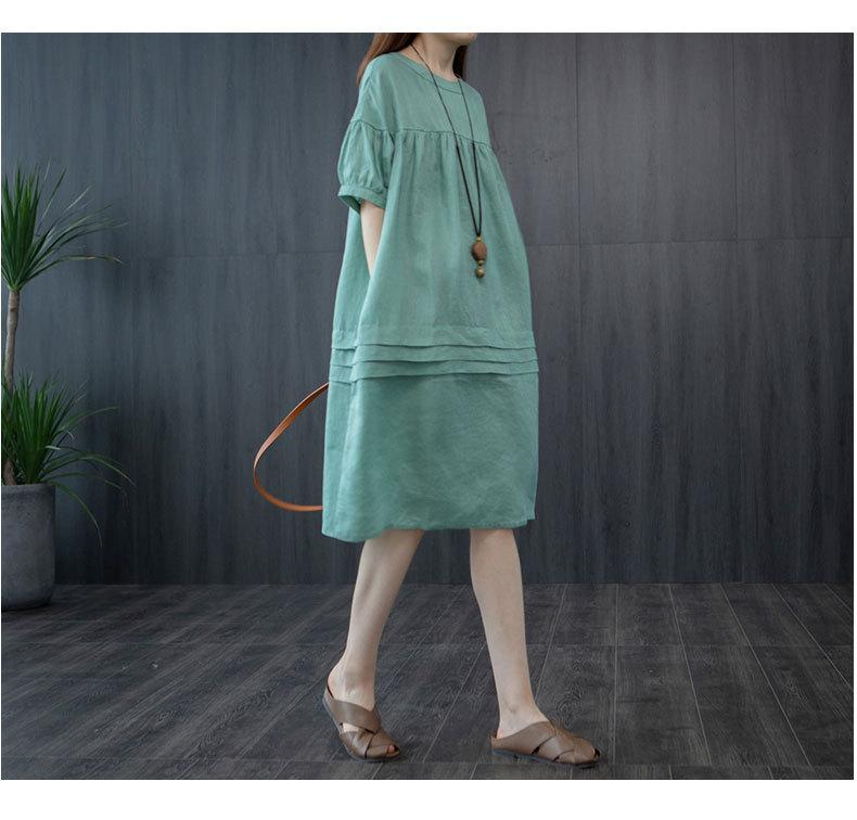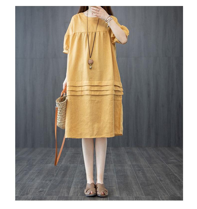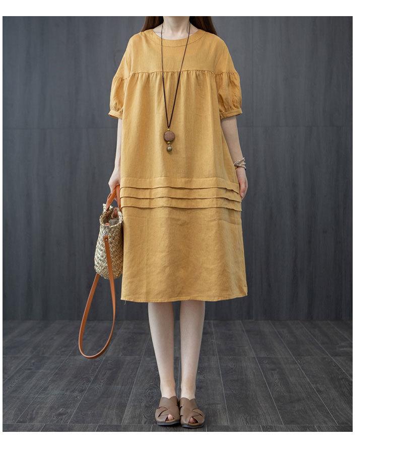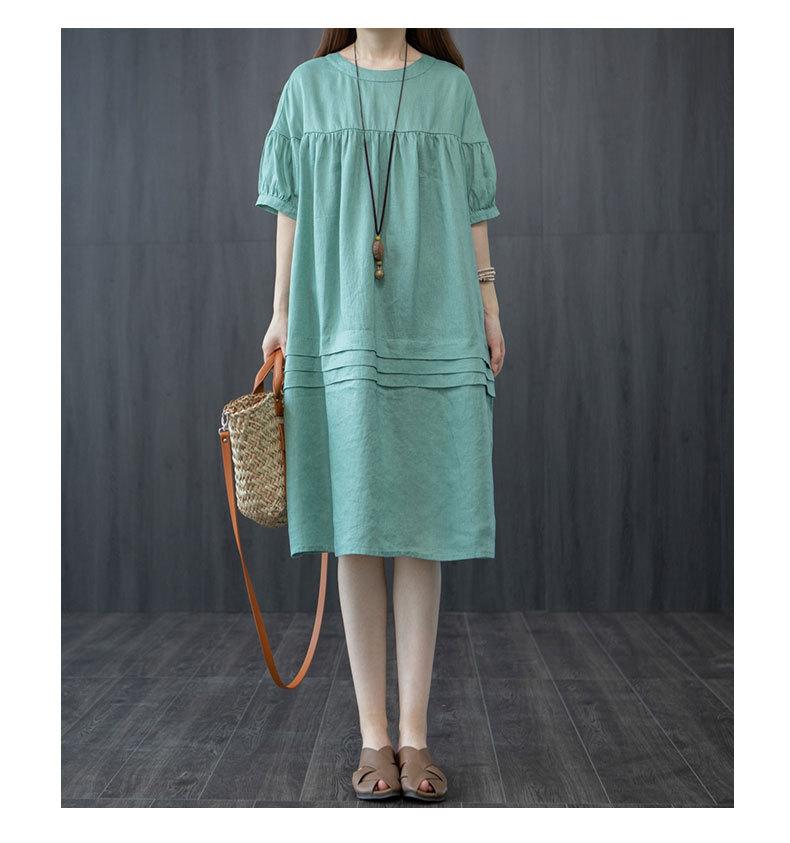 Vestido de verano 2024 nuevo con costuras sueltas literarias de color sólido con cuello redondo y manga corta para mujer, talla 229