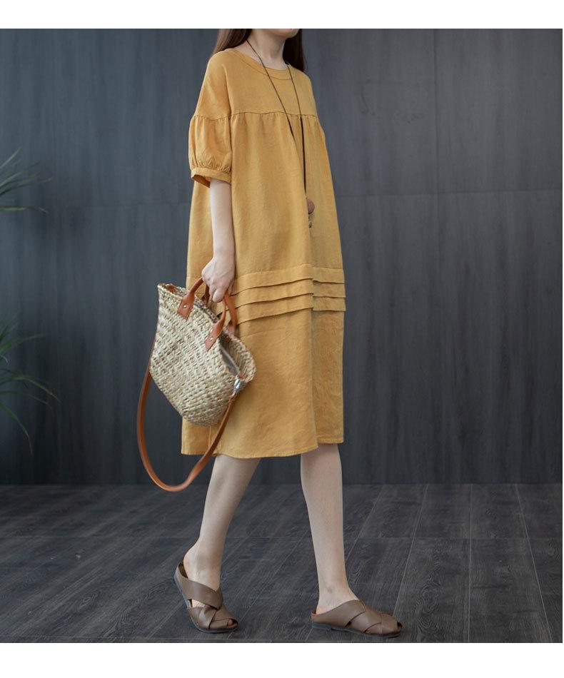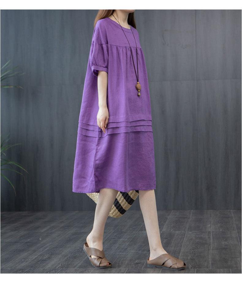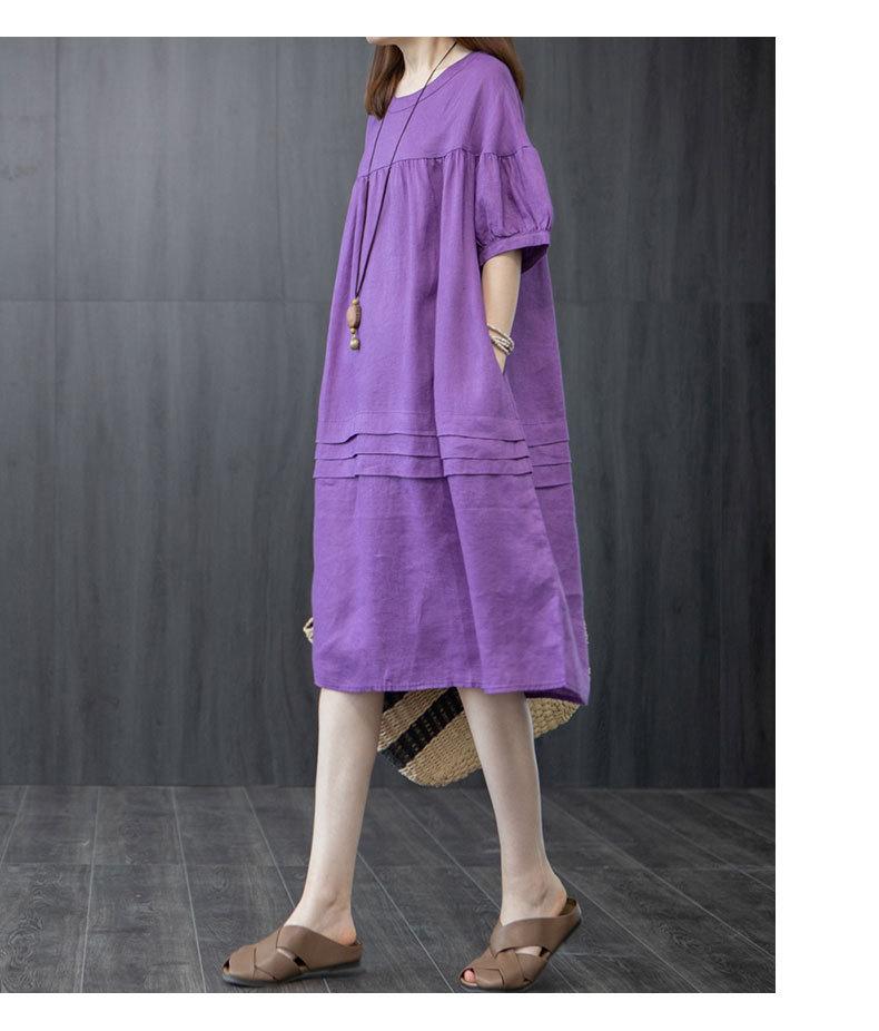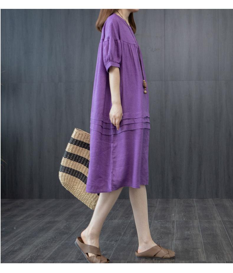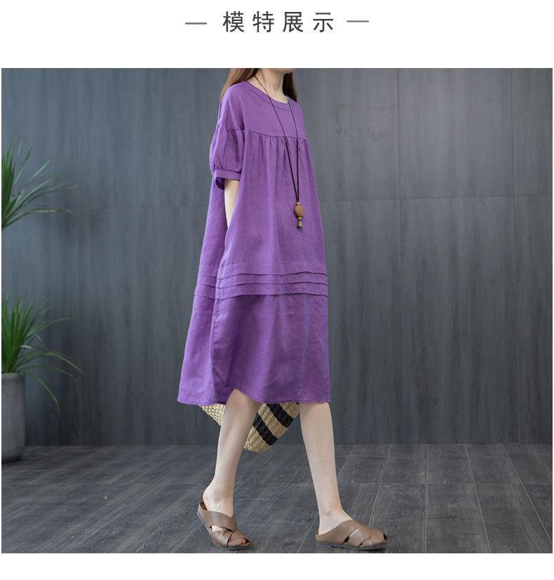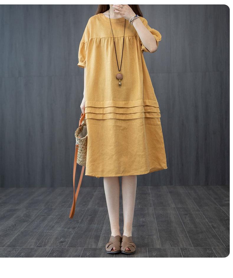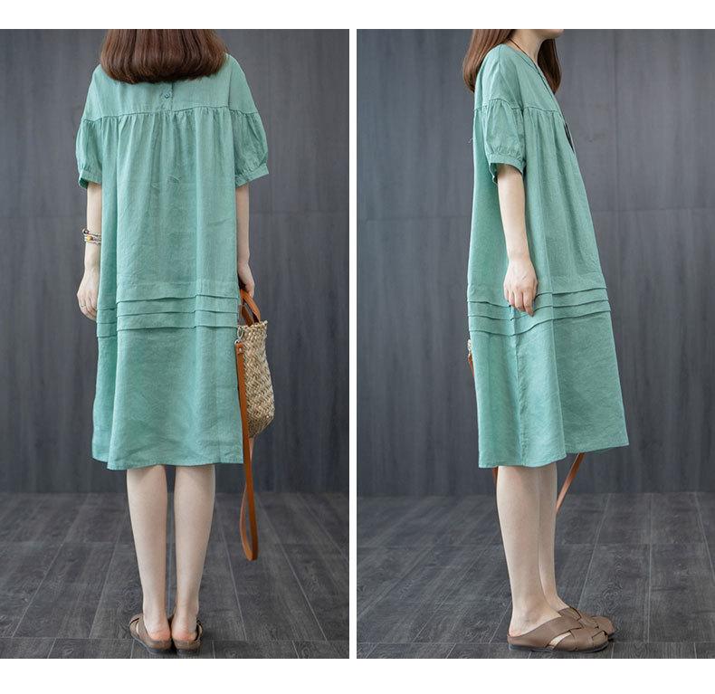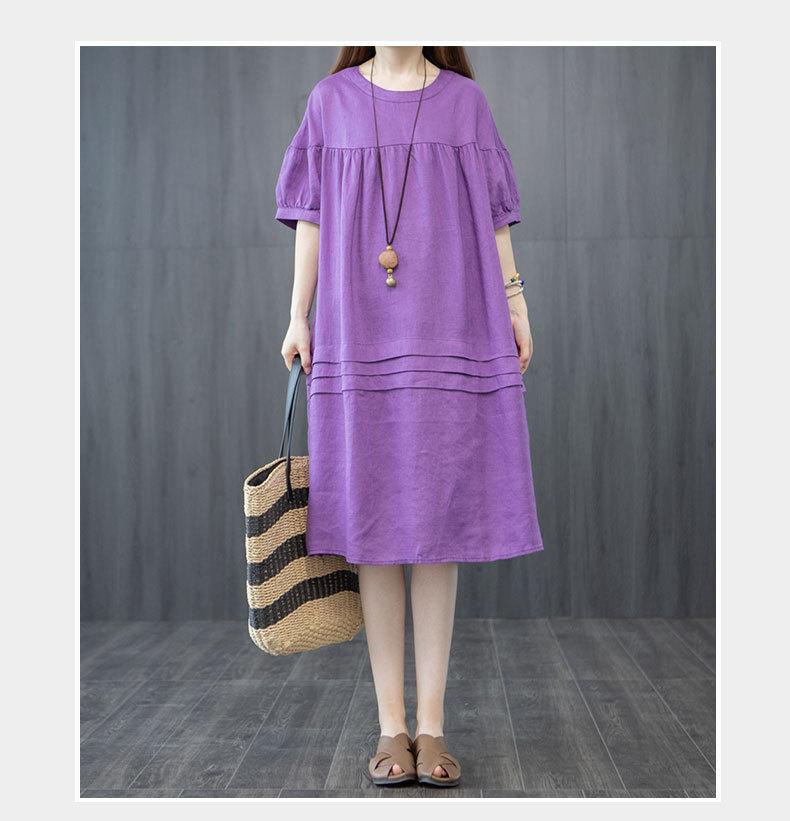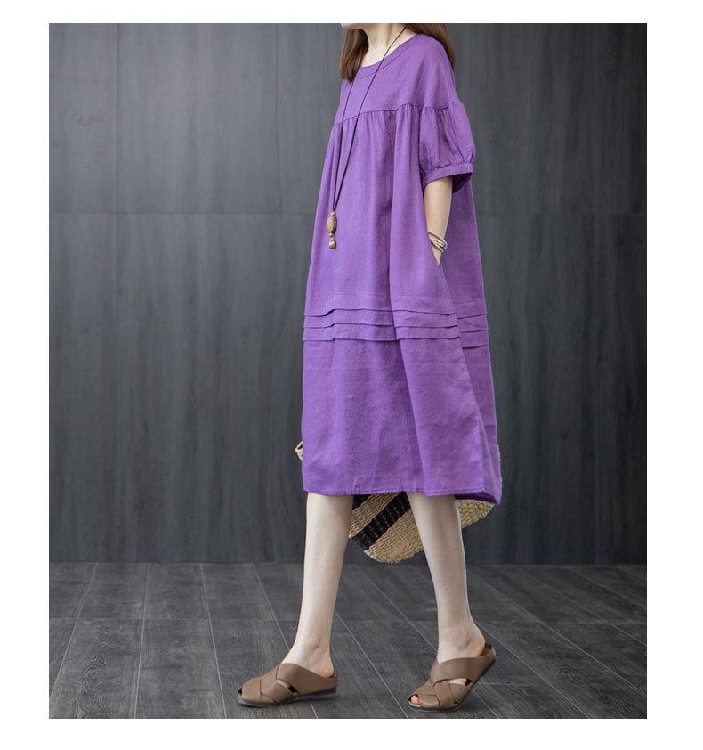 Vestido de verano 2024 nuevo con costuras sueltas literarias de color sólido con cuello redondo y manga corta para mujer, talla 229