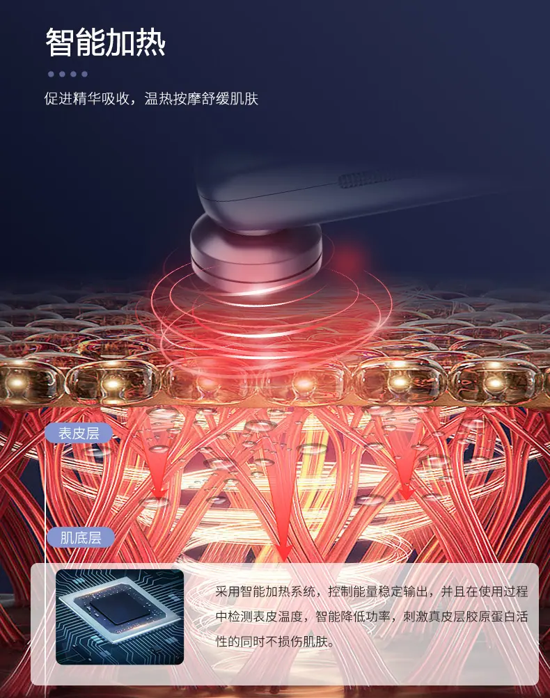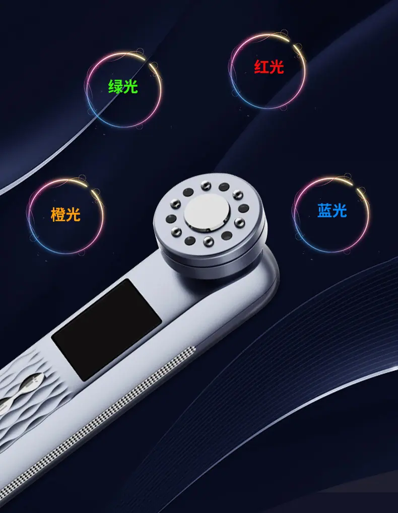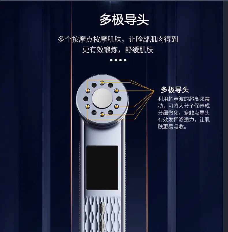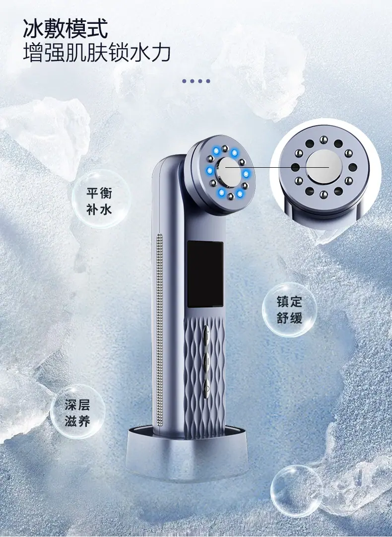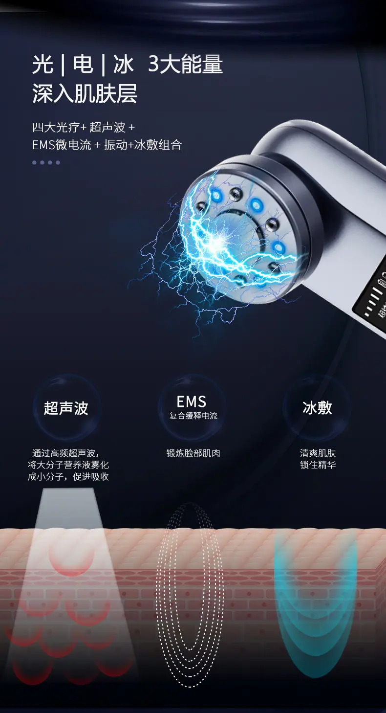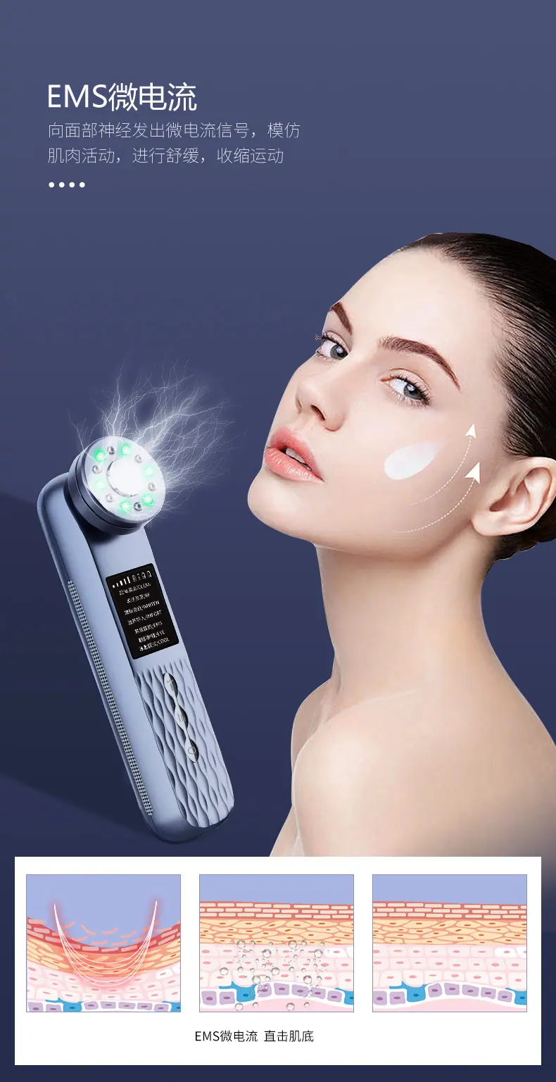 Nuevo instrumento doméstico de masaje facial vibratorio con calor y frío. Introducción: instrumento de belleza, instrumento de rejuvenecimiento de la piel con fotones de microcorriente. Fuente: fábrica.