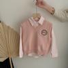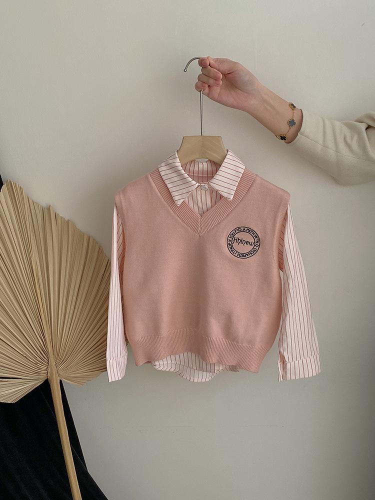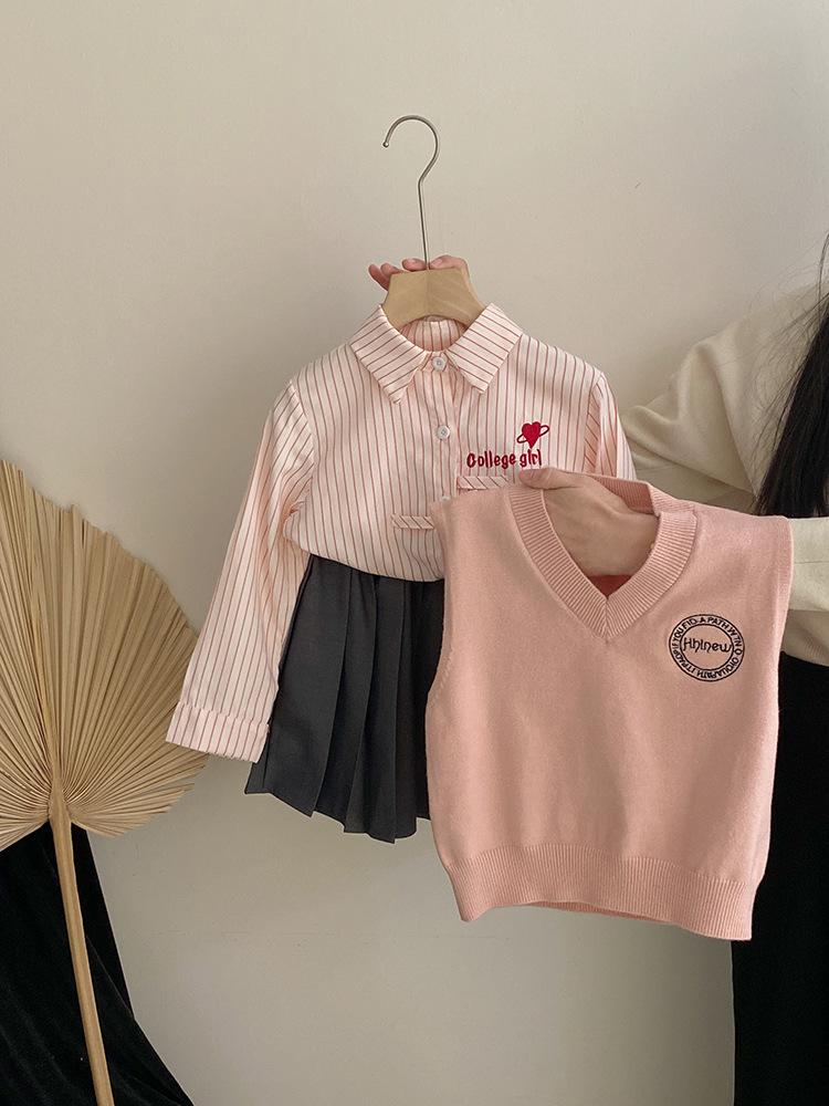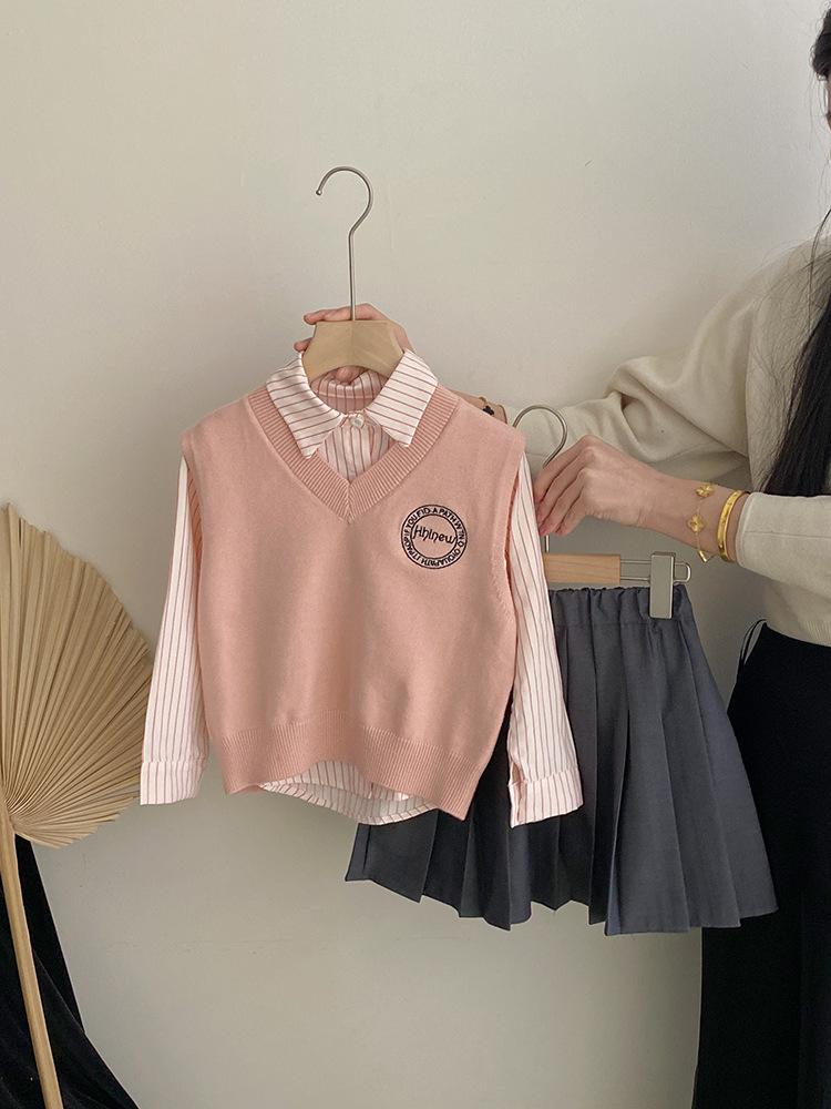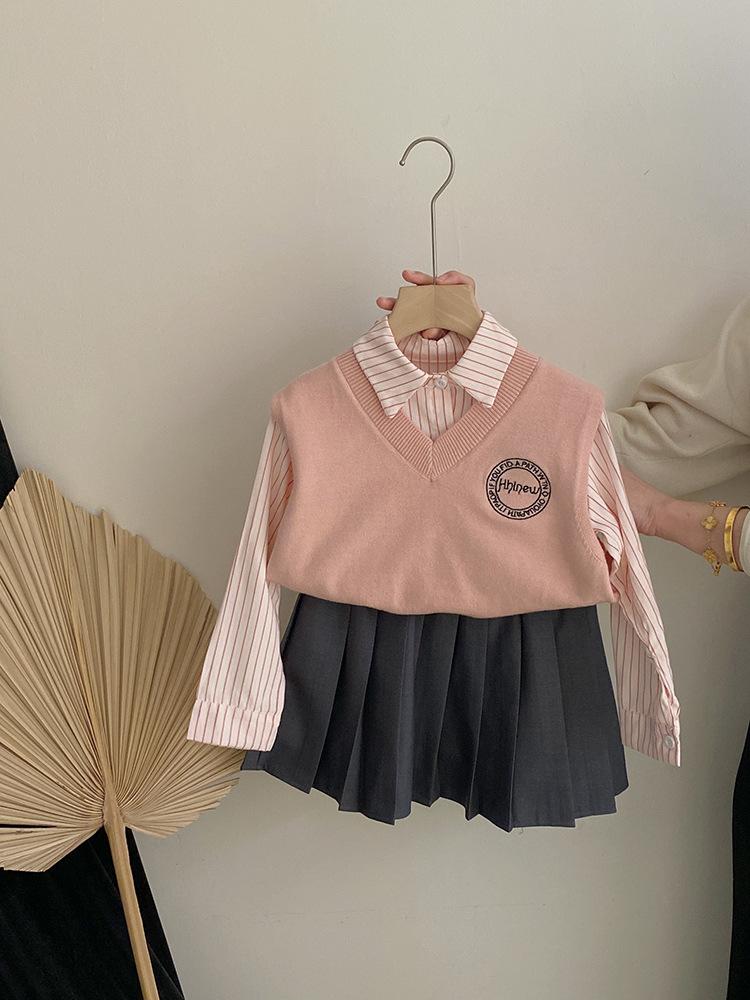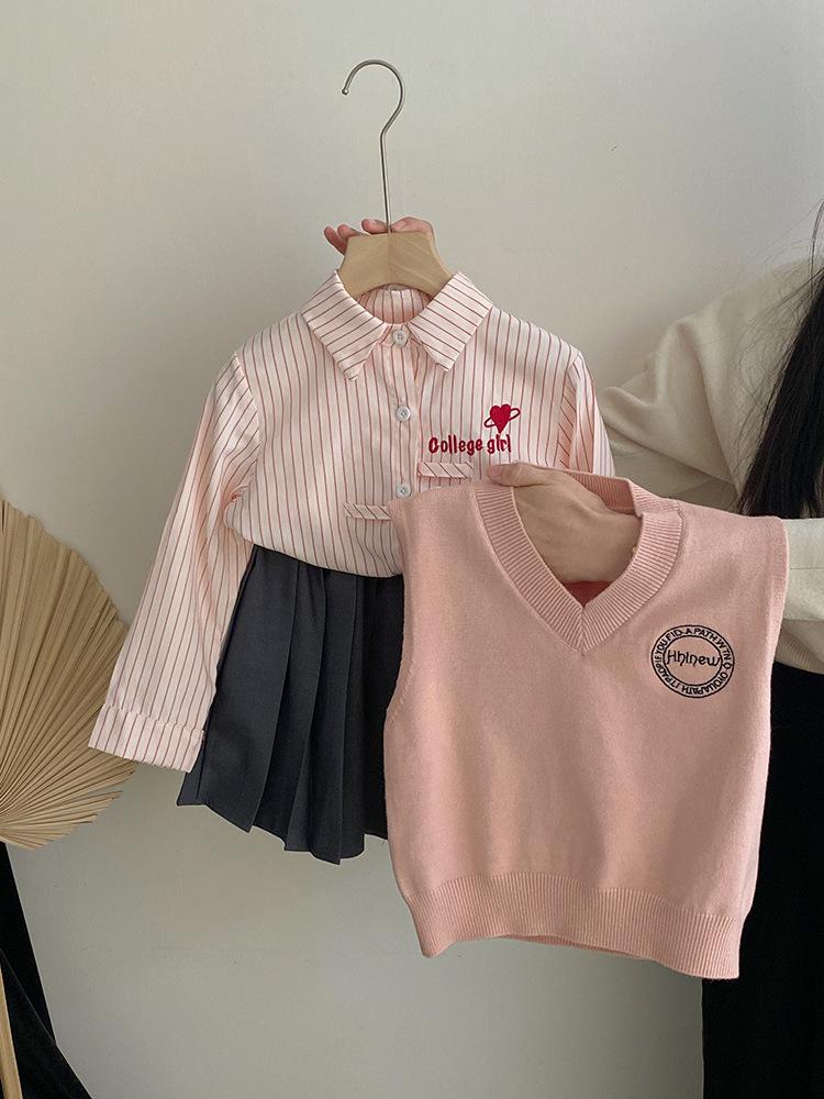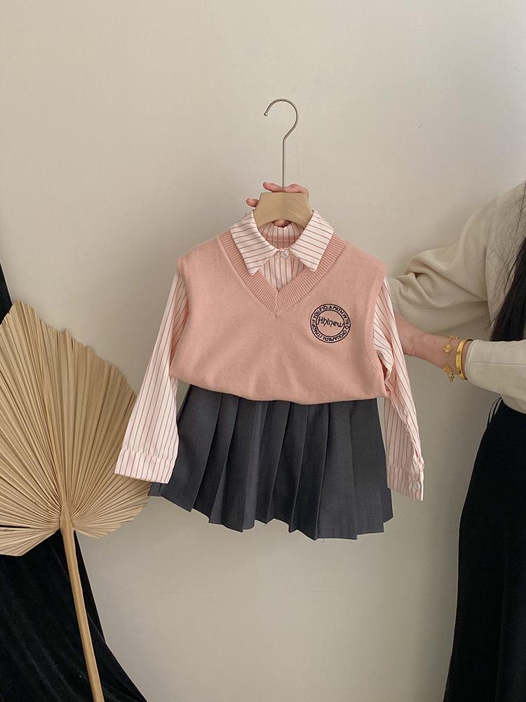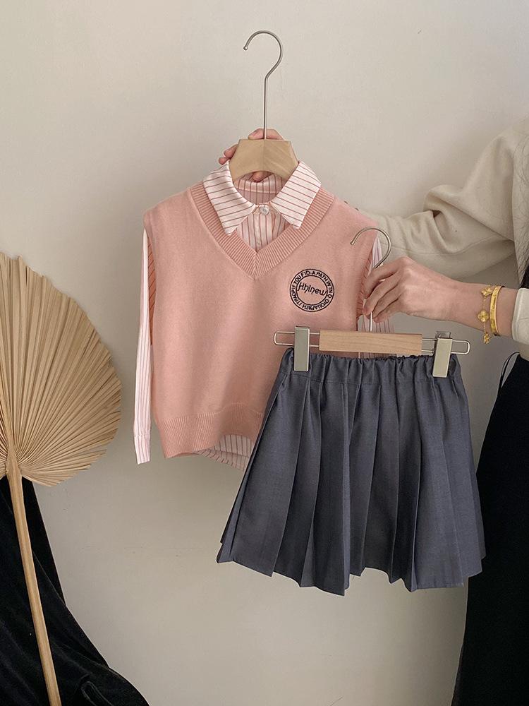 Nuevo Estilo Primavera y Otoño 2025 Niñas Estilo Universitario Lindo Chaleco Tejido Más Fácil de Combinar Camisa Rayada Traje Falda Plisada Moderno