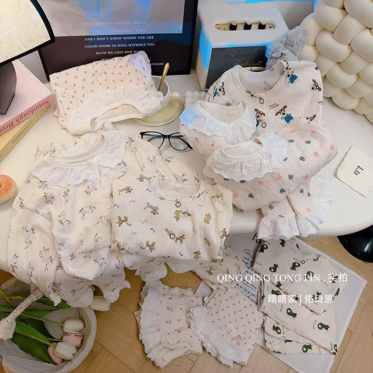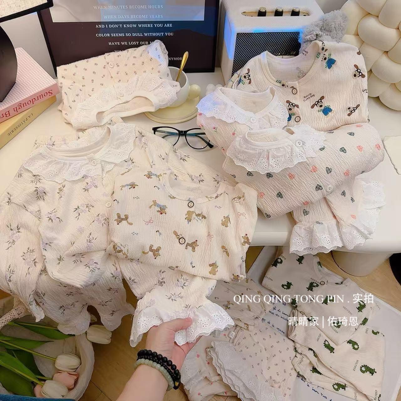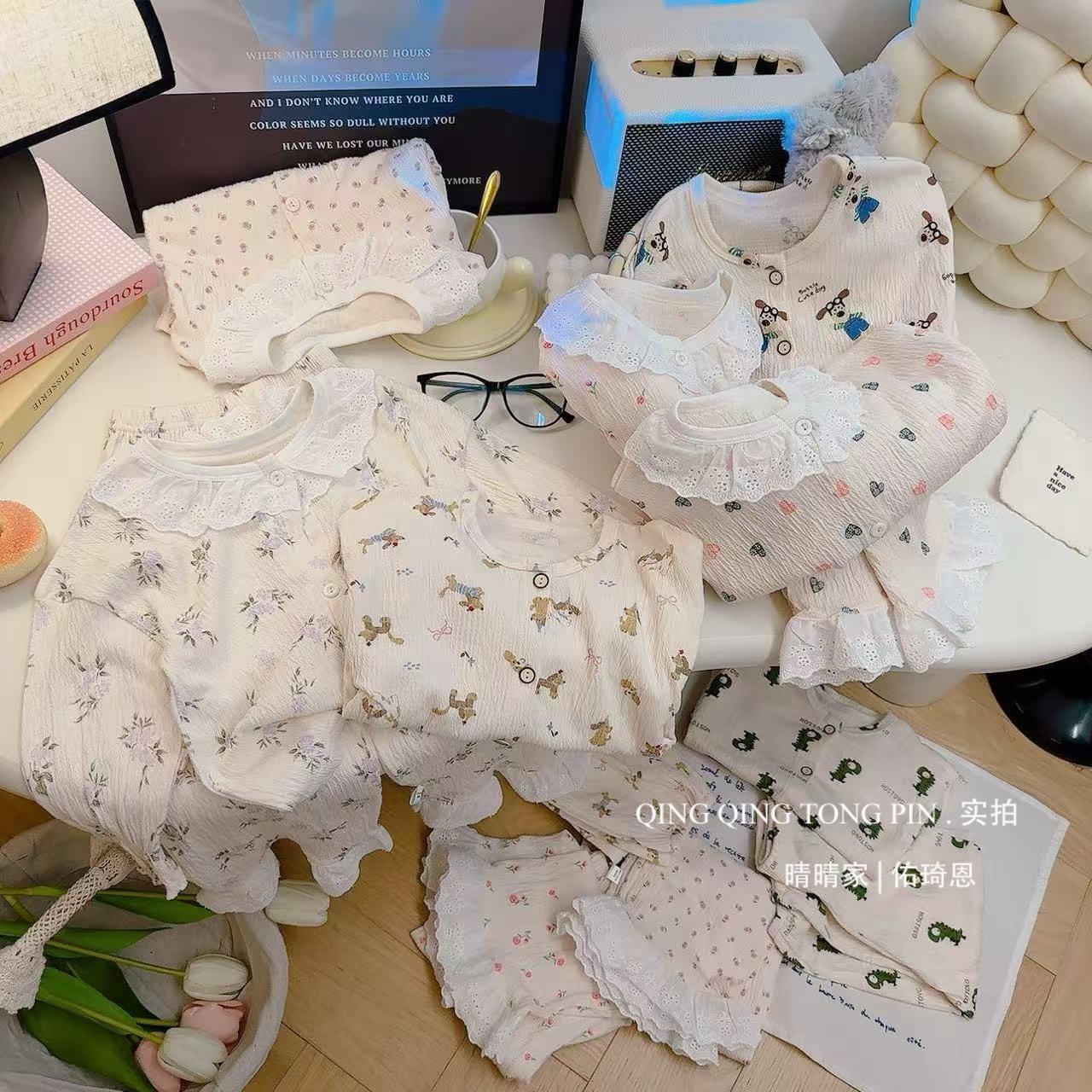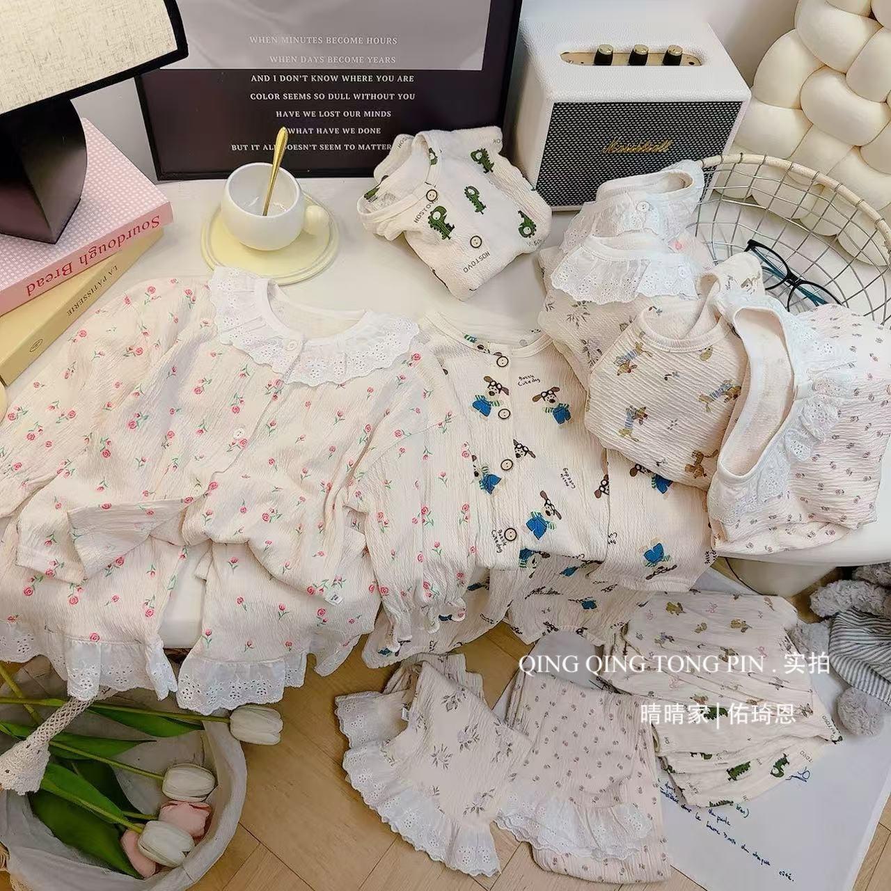 Traje de Hilo de Algodón Elástico para Niños Encaje Bebé Cárdigan de Primavera Ropa para el Hogar Estilo Coreano Lindo Ropa para Aire Acondicionado Pijamas