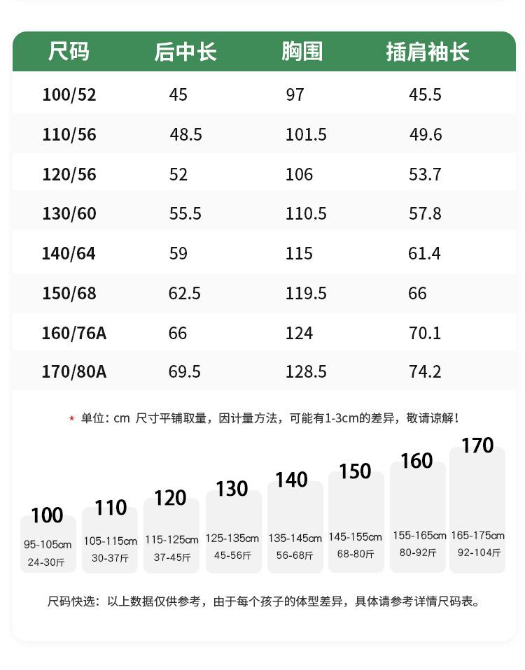 Recommended height for size 100 is 95-105cm, Recommended height for size 110 is 105-115cm, Recommended height ...