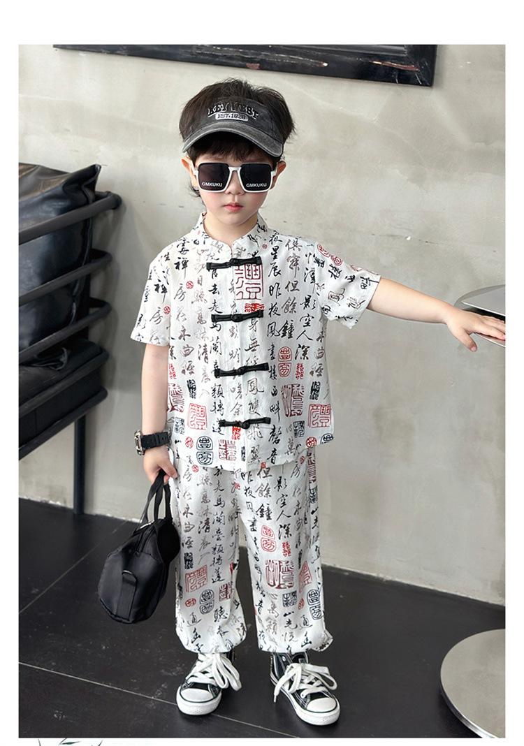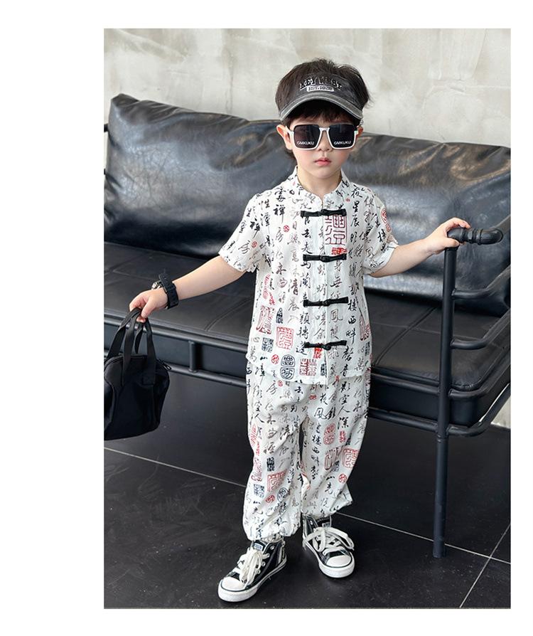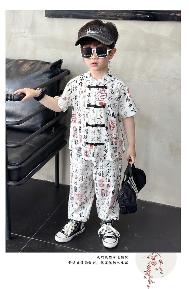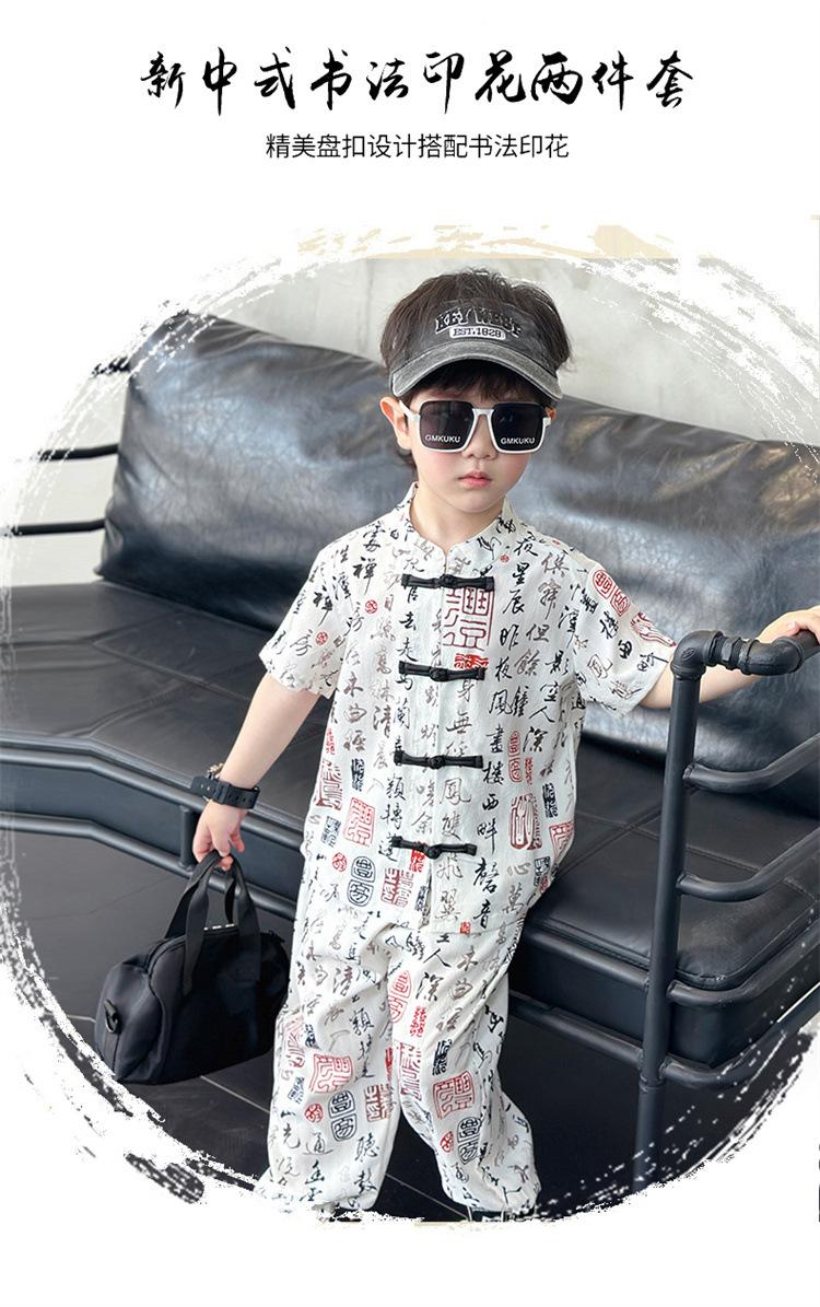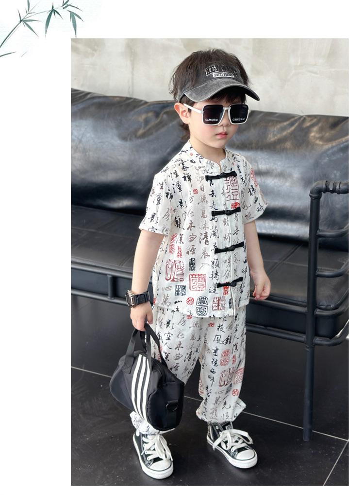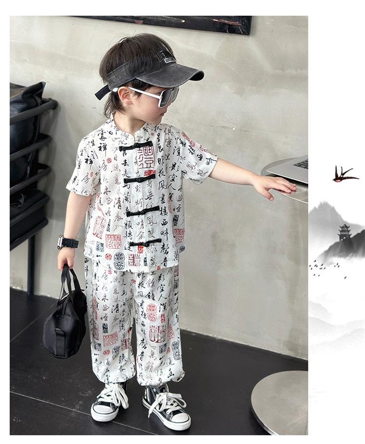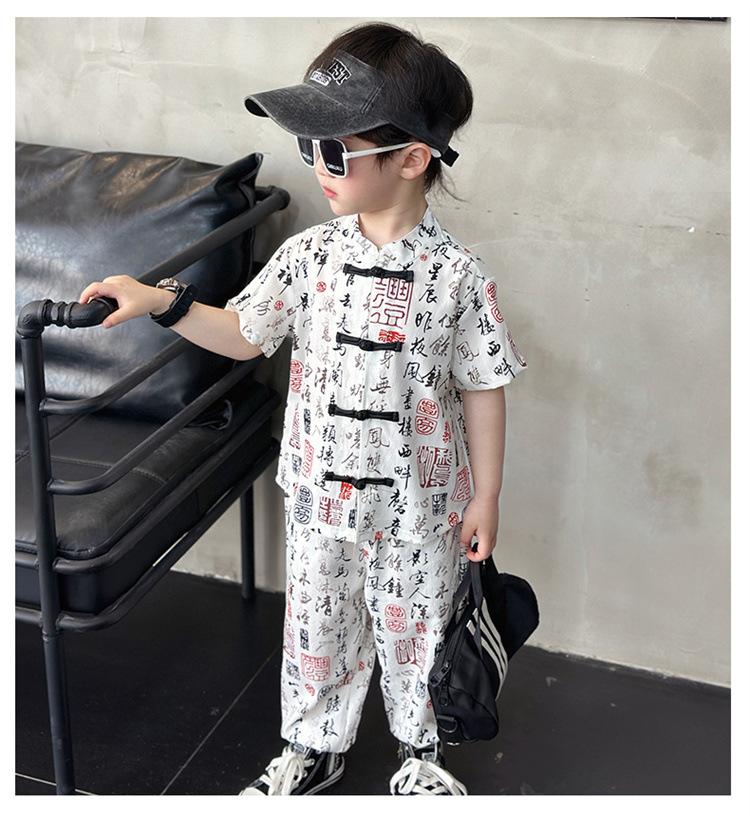 Traje de estilo nacional caligráfico para niño, verano 2025, nuevo traje de dos piezas fino de manga corta para niño.