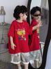 Camiseta de manga corta para niños y niñas, estilo occidental, holgada, de algodón puro, con cuello redondo, color rojo, para verano de 2025.