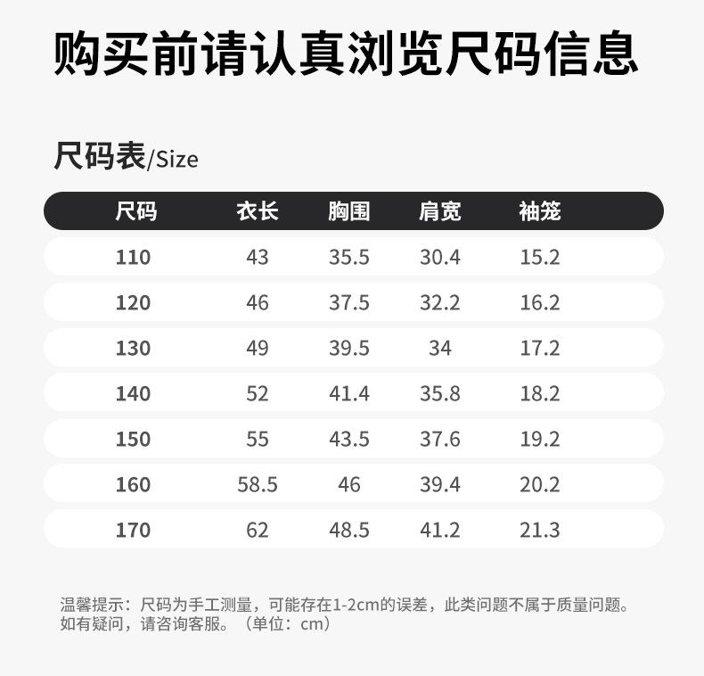 110cm, 120cm, 130cm, 140cm, 150cm, 160cm, 170cm