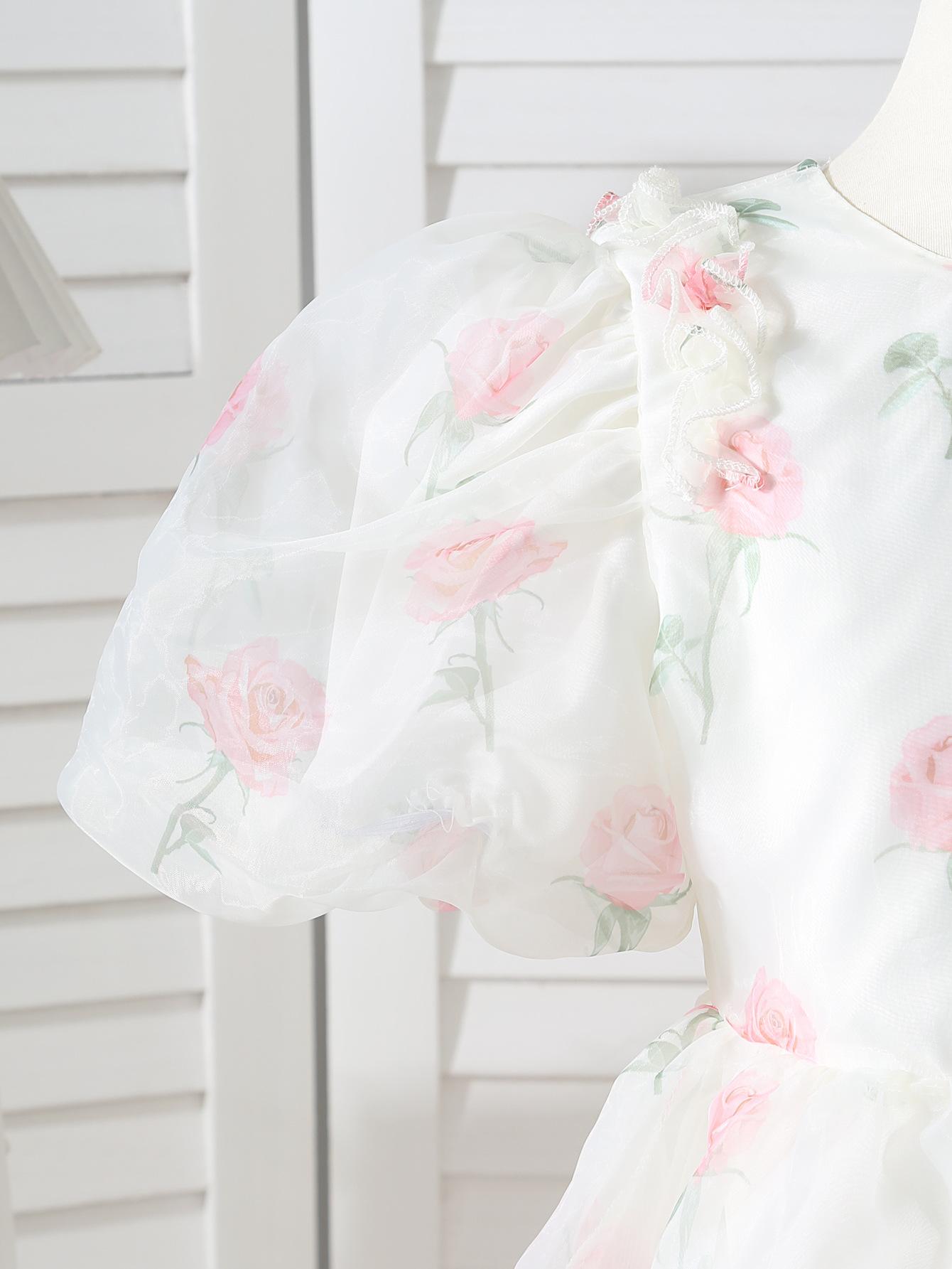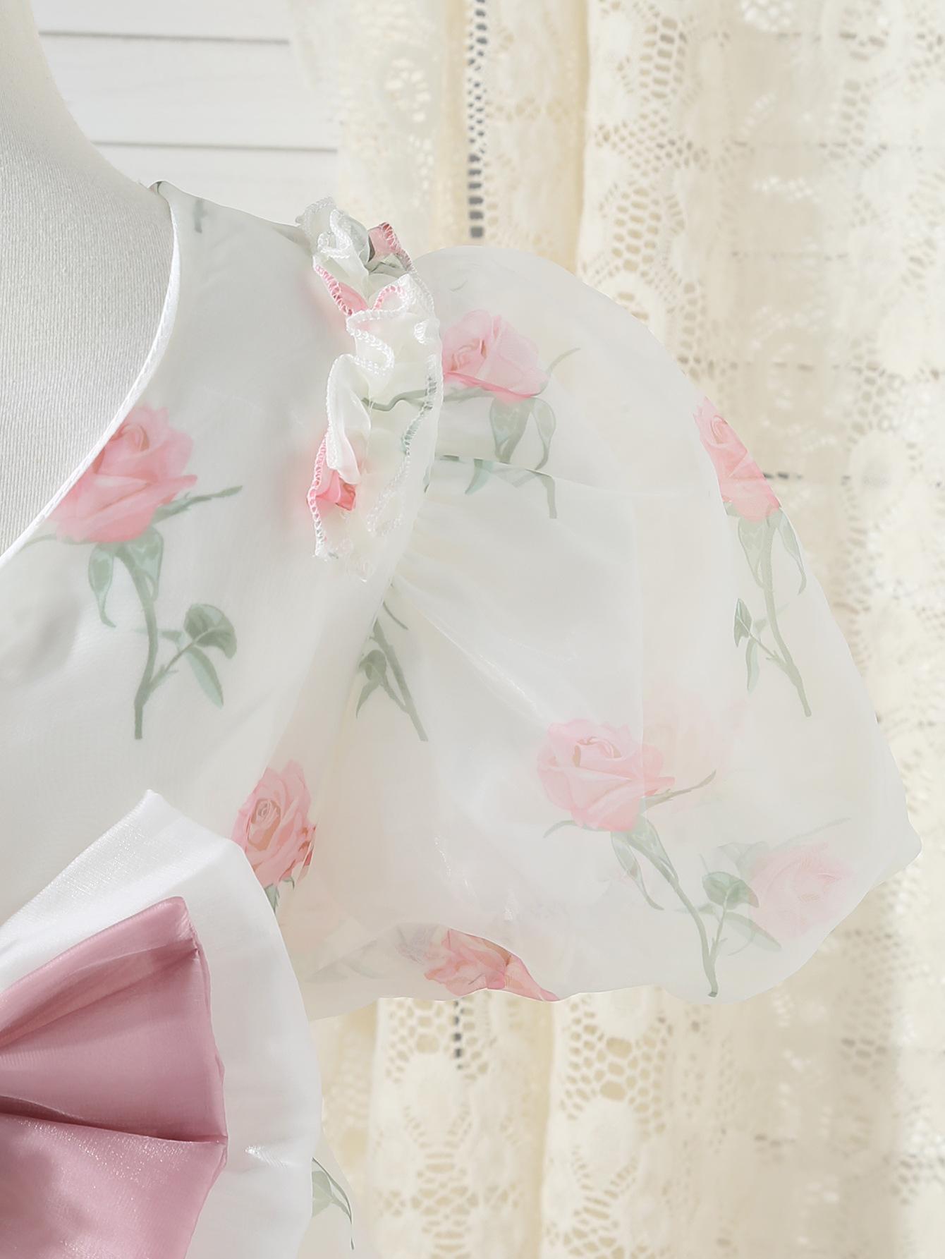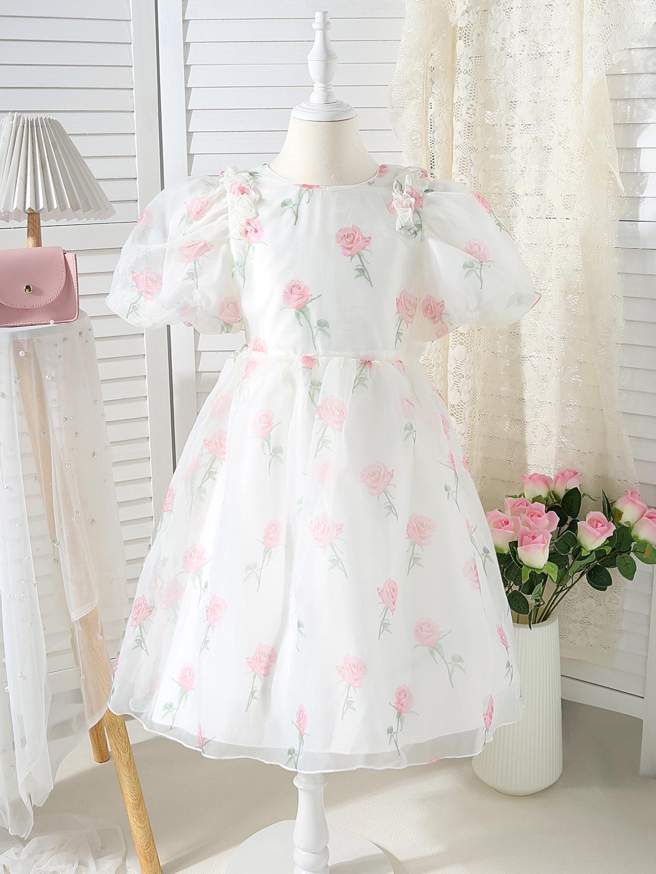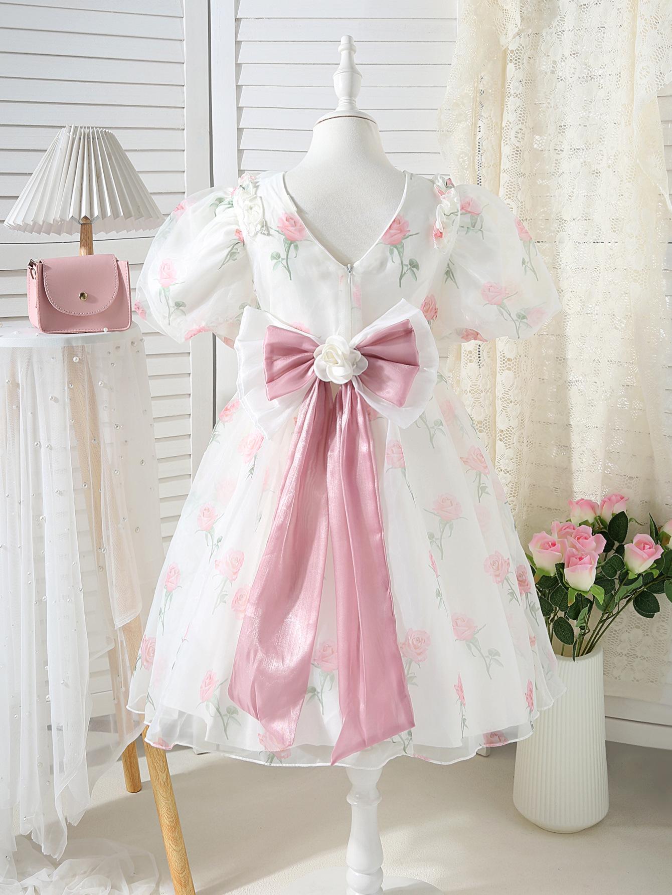 Vestido de princesa para niña, verano 2025, nuevo estilo, vestido floral para niña, vestido con mangas abullonadas y lazo.