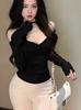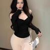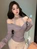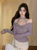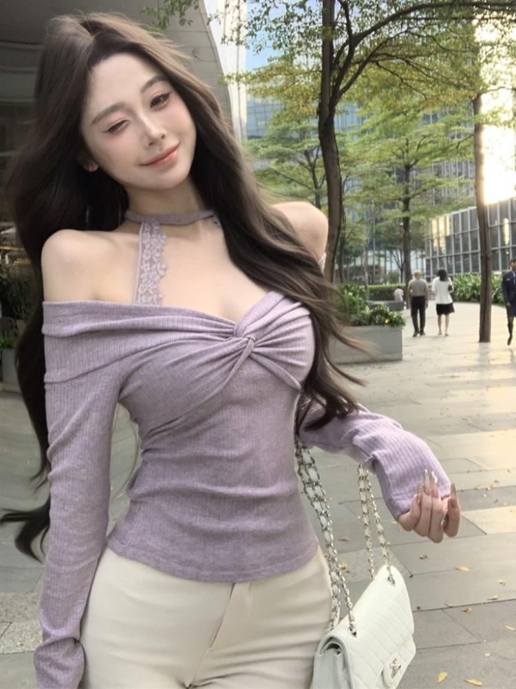 Camiseta de manga larga con cuello de encaje en los hombros para mujer, corte entallado, diseño de pliegues, base corta, color morado, para otoño