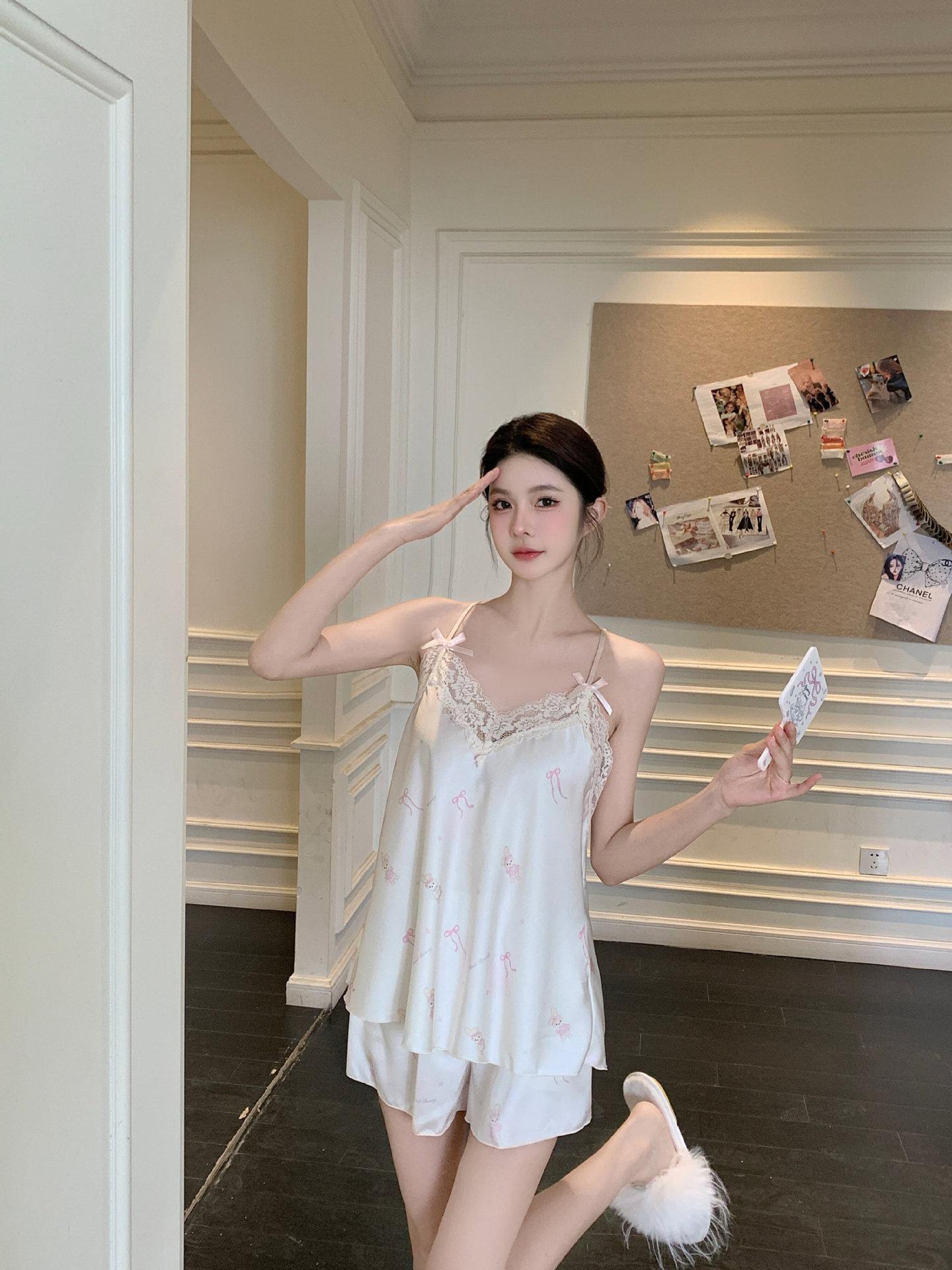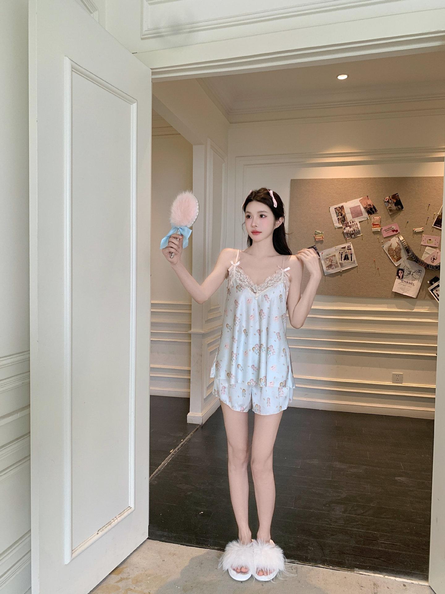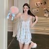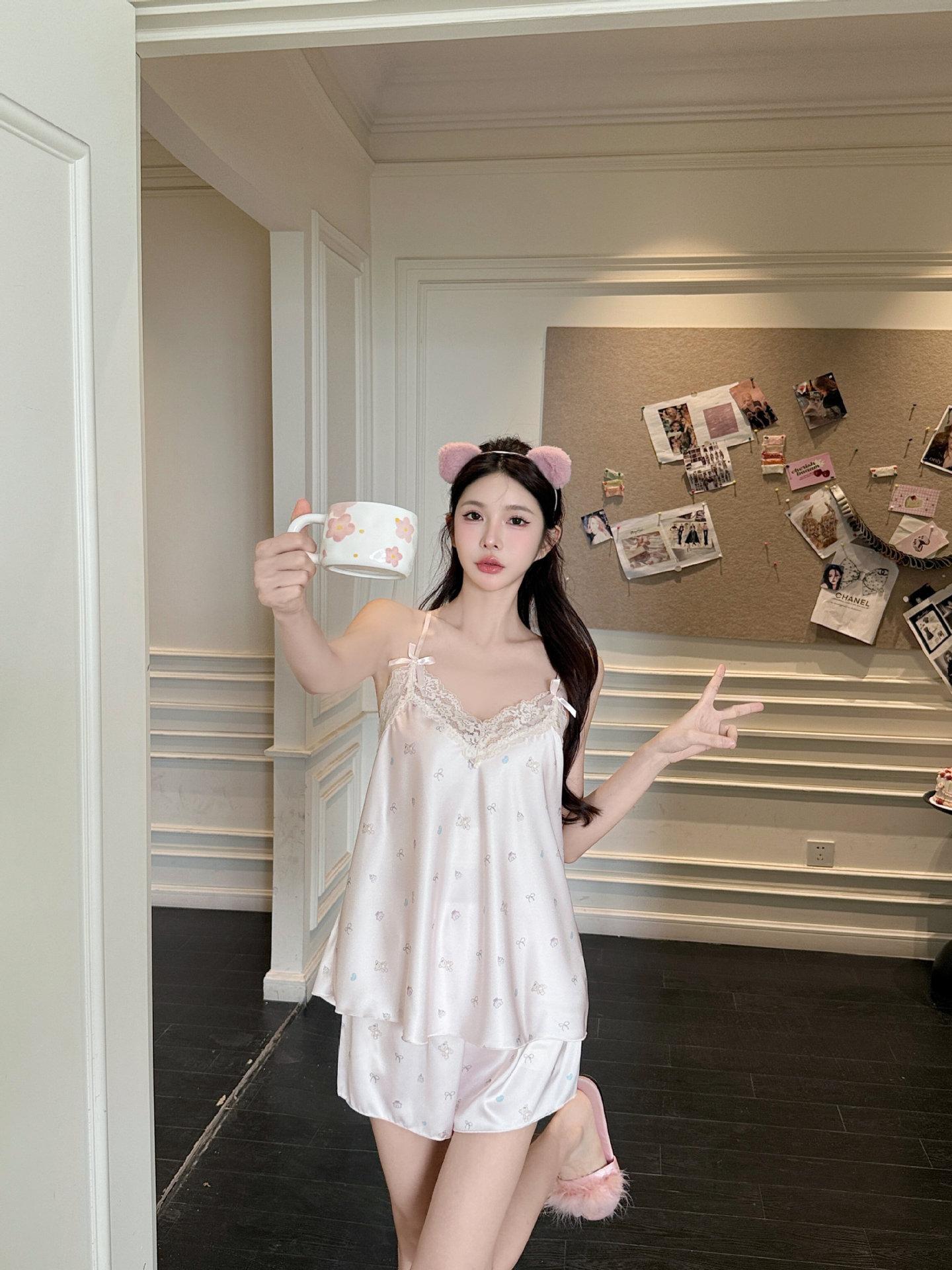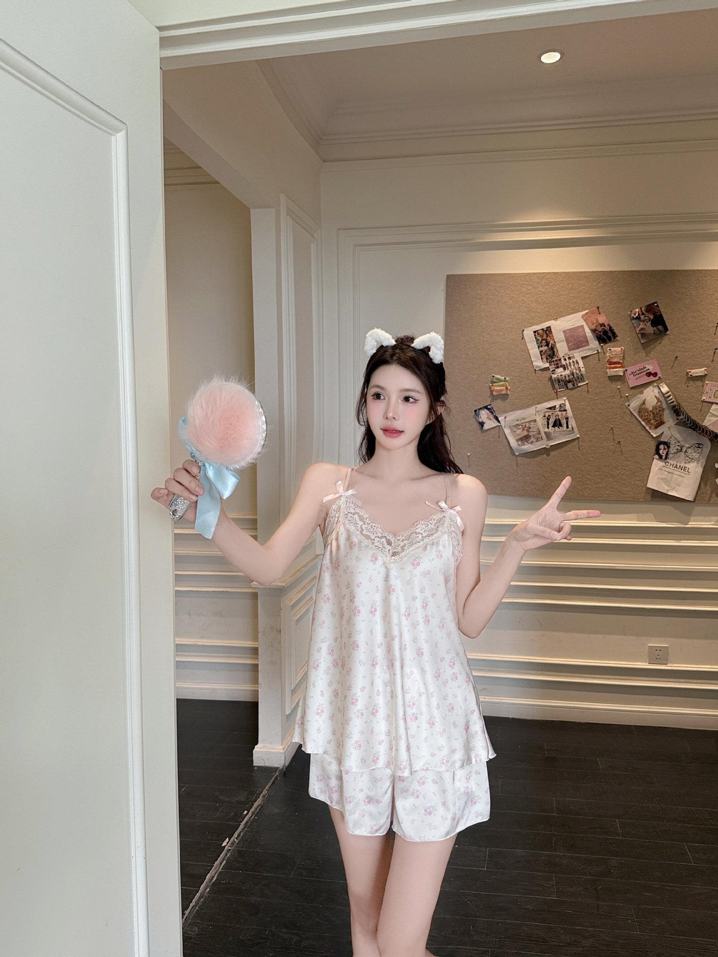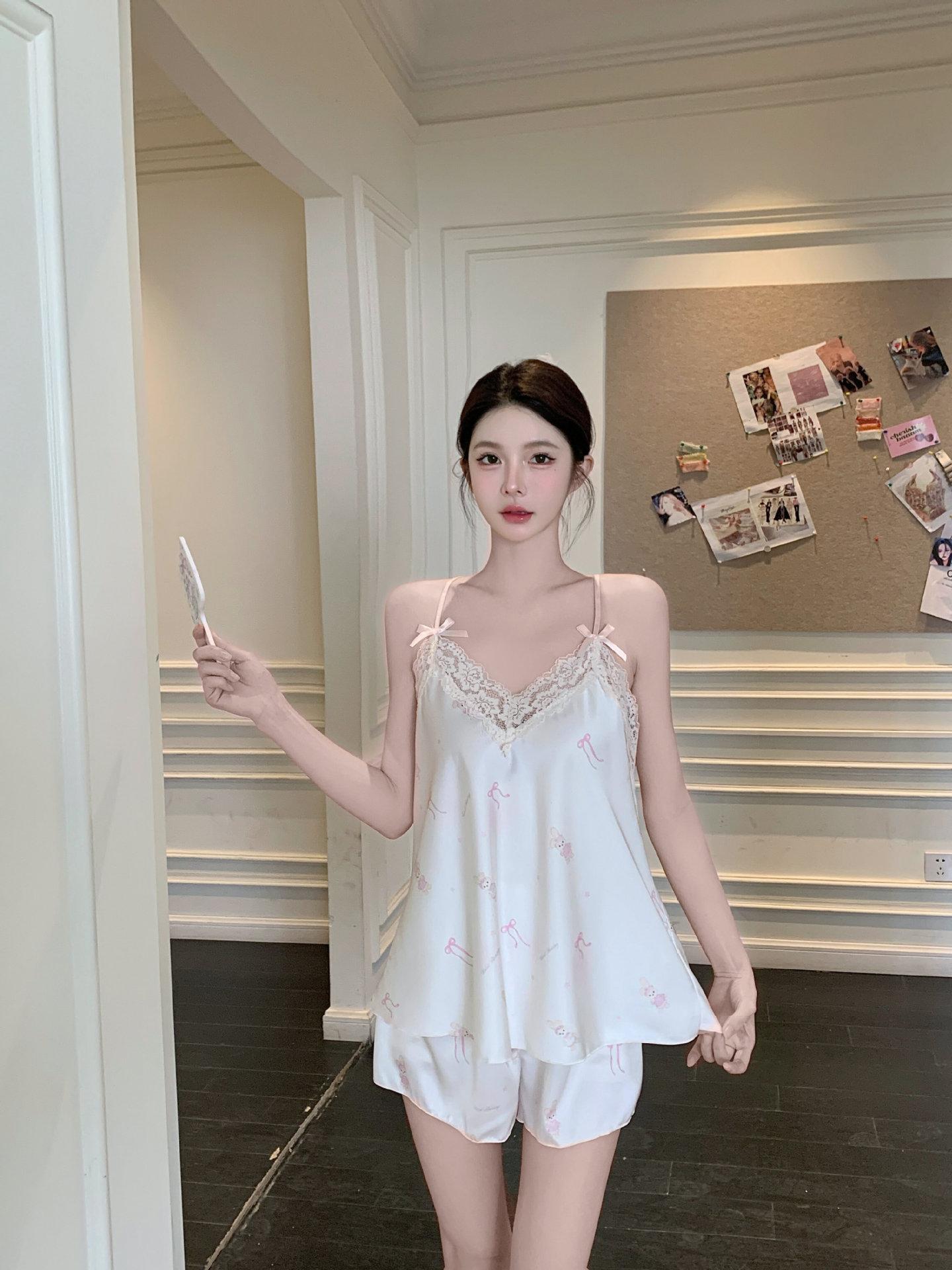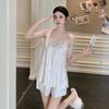 Conjunto de dos piezas de pijama de seda helada para mujer, pantalones cortos con tirantes, ropa de casa cómoda de manga larga para principios de primavera
