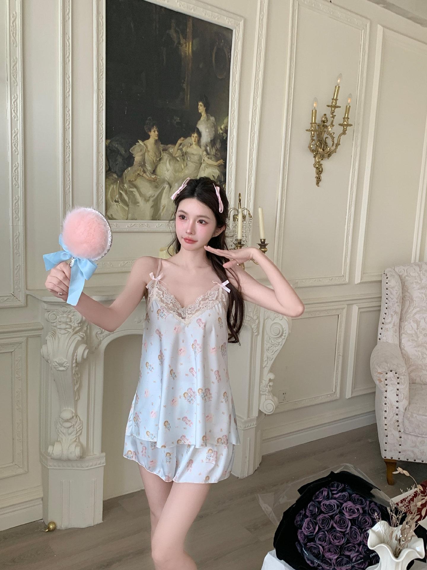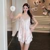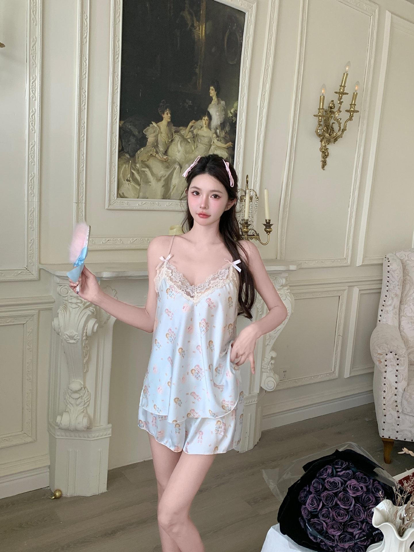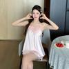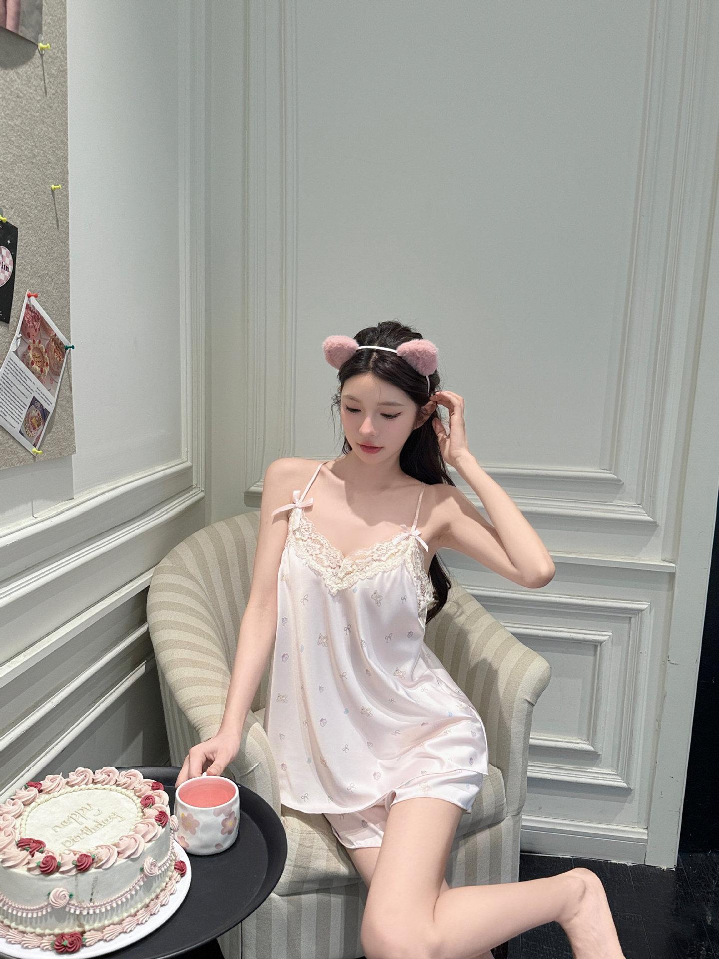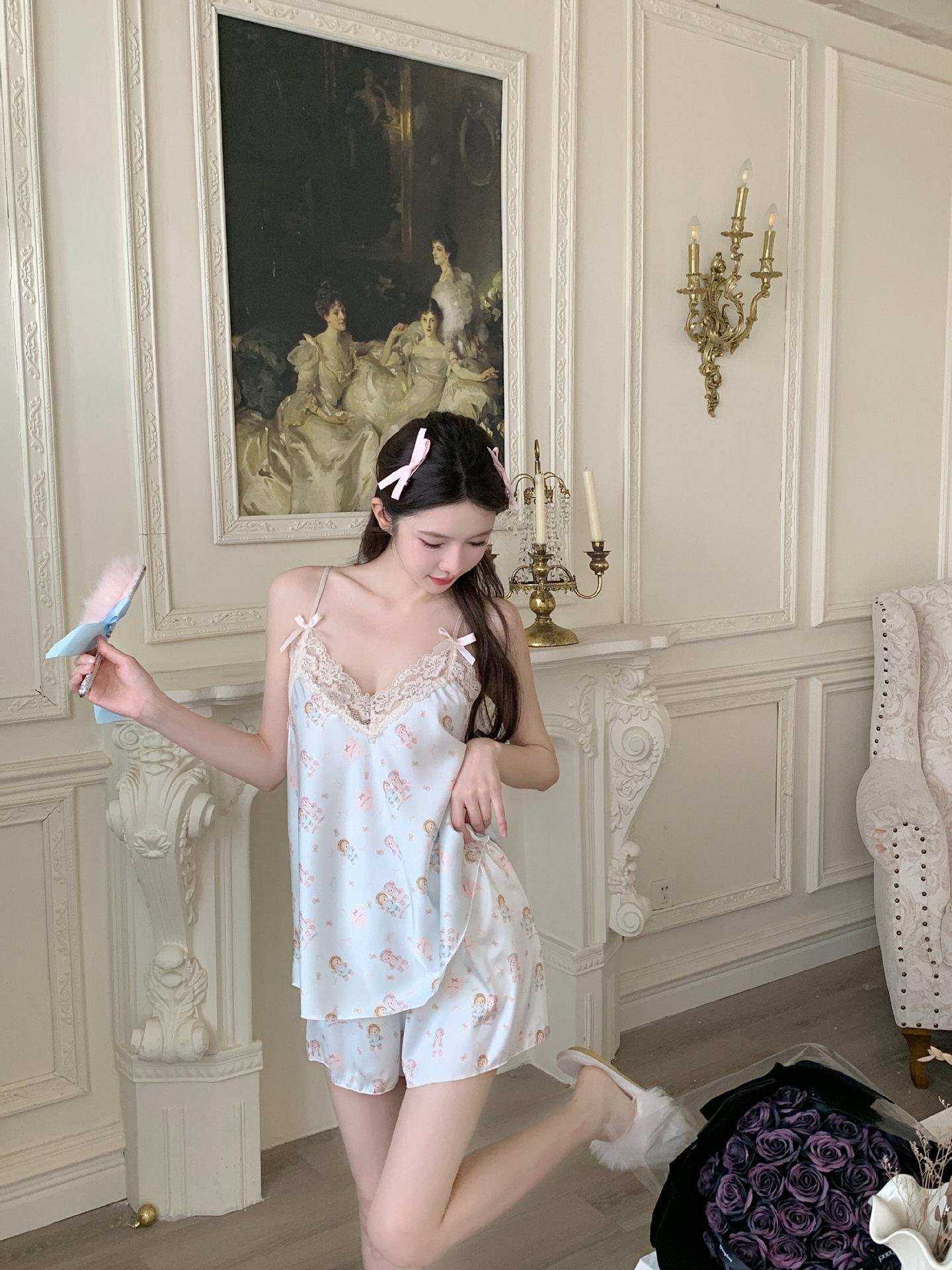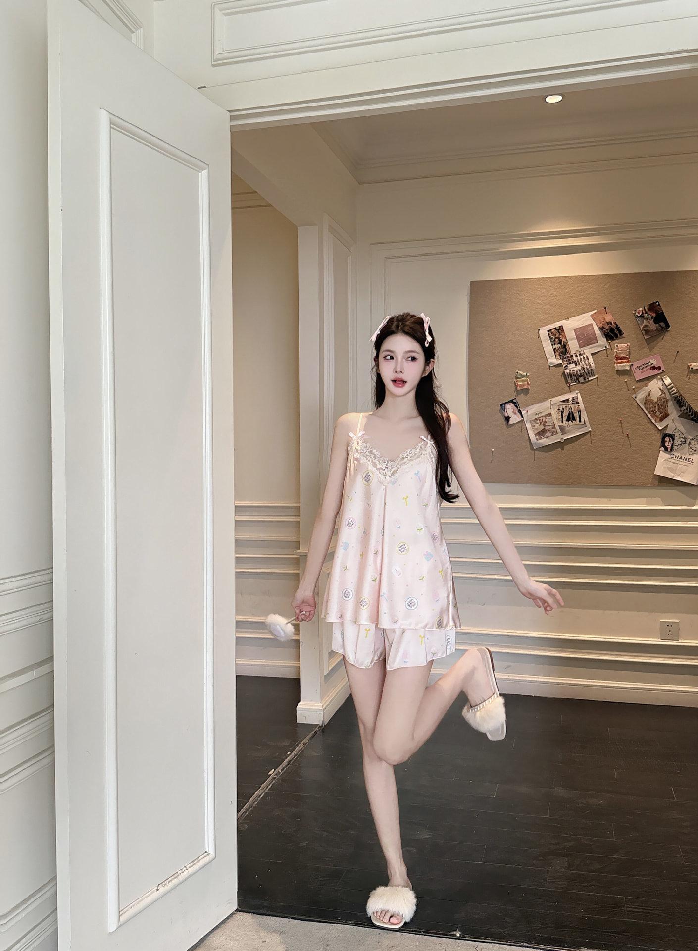 Conjunto de dos piezas de pijama de seda helada para mujer, pantalones cortos con tirantes, ropa de casa cómoda de manga larga para principios de primavera