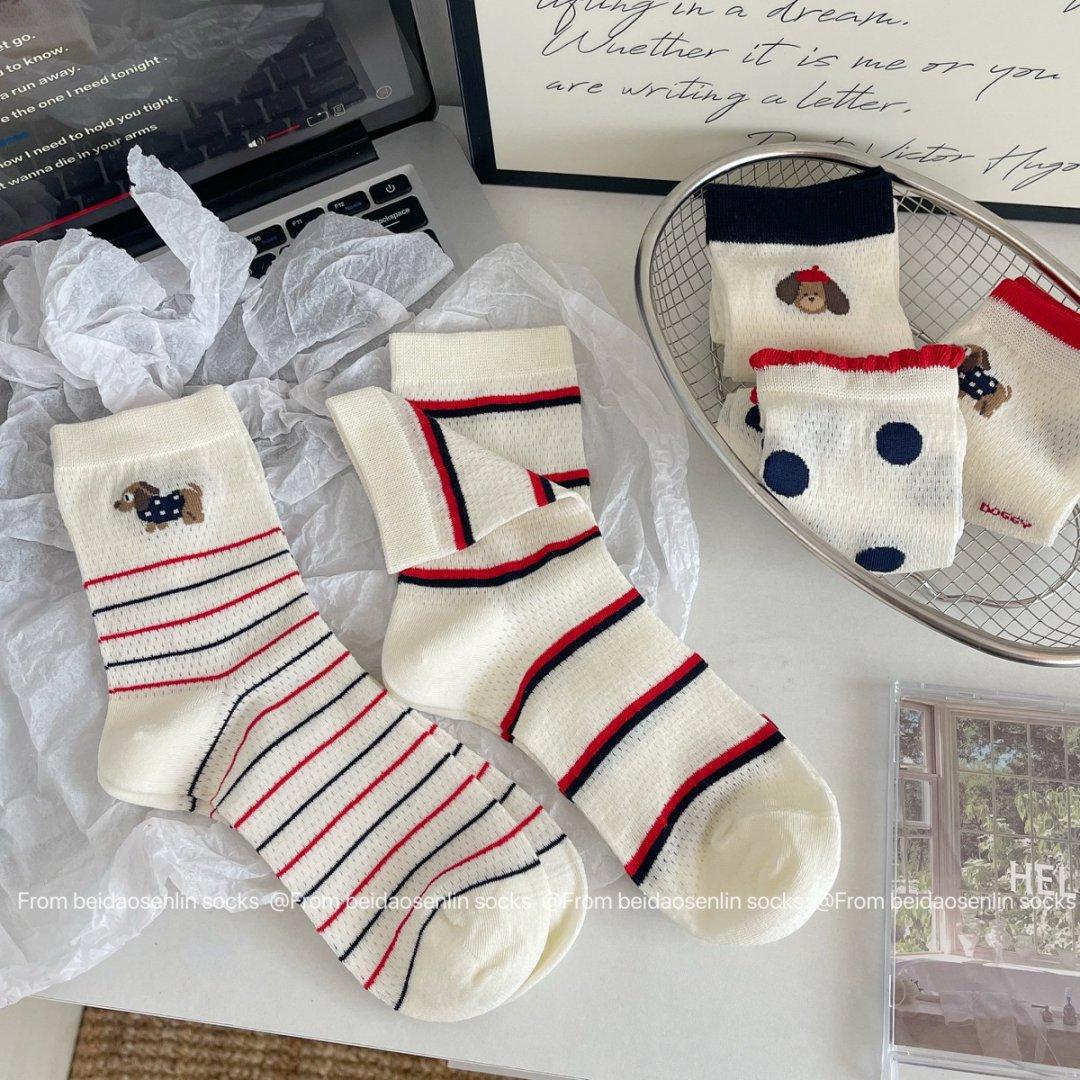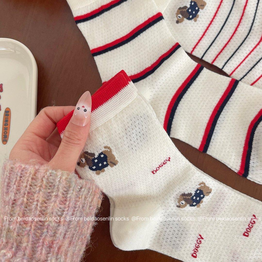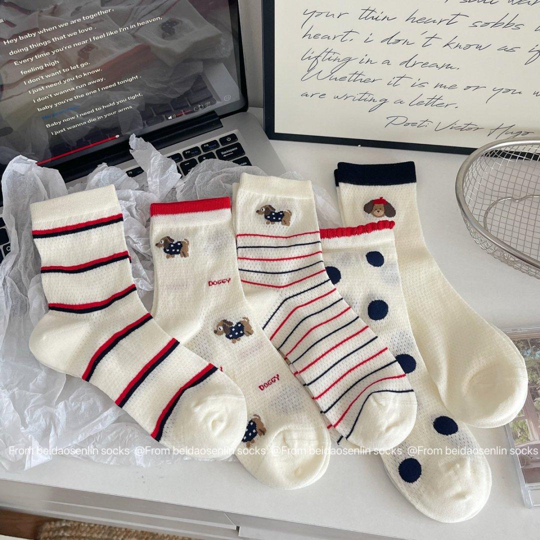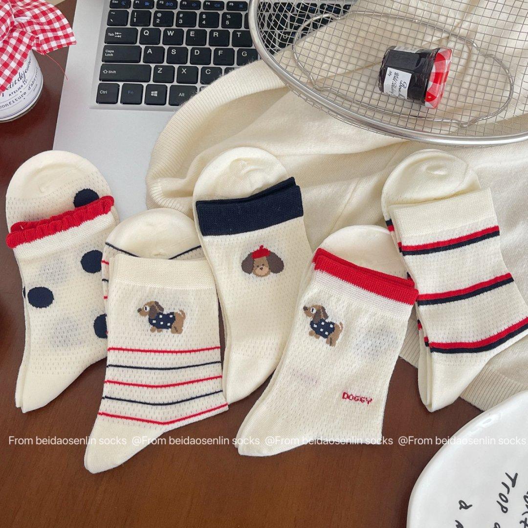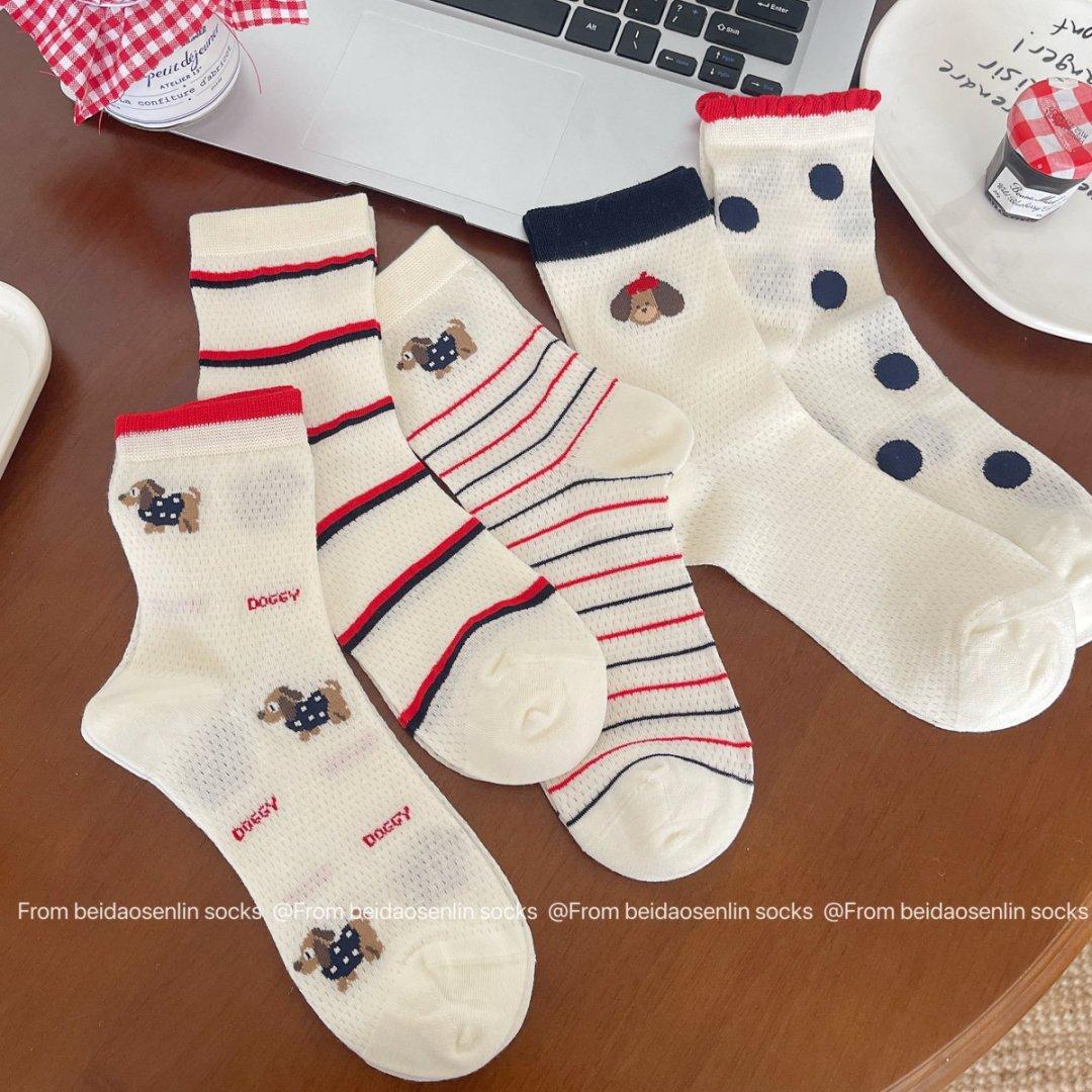 Mekki Calcetines Nuevos para Mujer Calcetines de Malla Rayados de Lunares Calcetines de Dibujos Animados de Perro hasta la Mitad de la Pantorrilla Ligeros y Transpirables Calcetines de Algodón de Moda