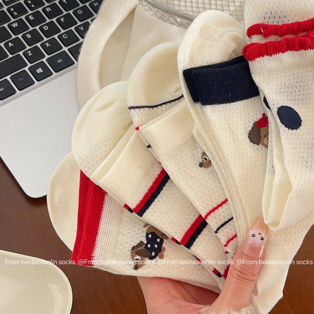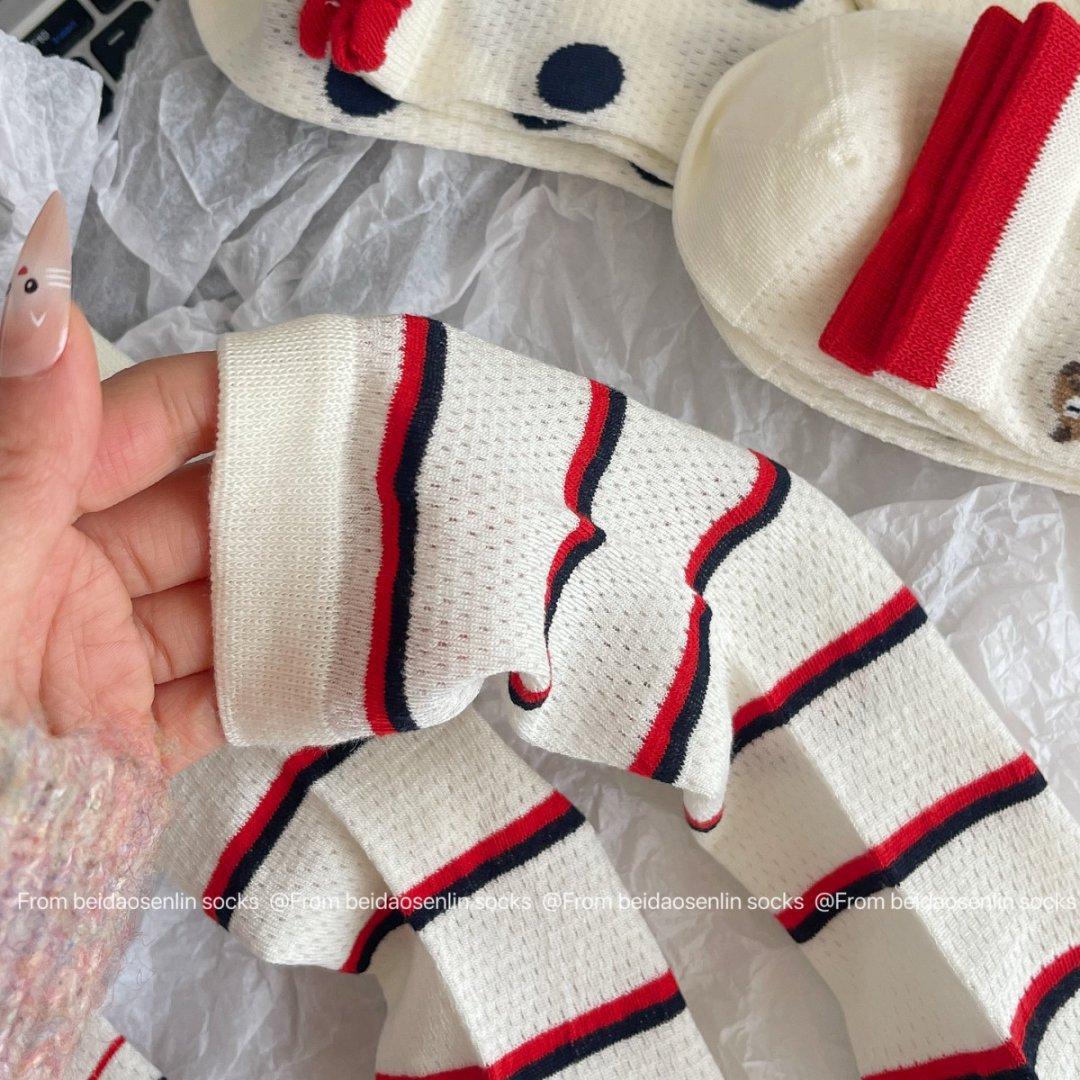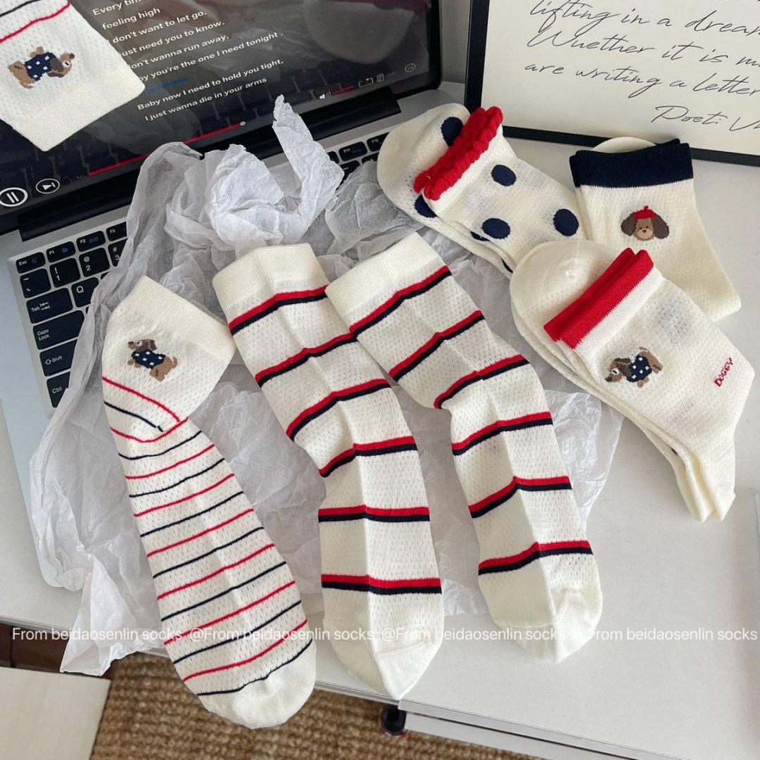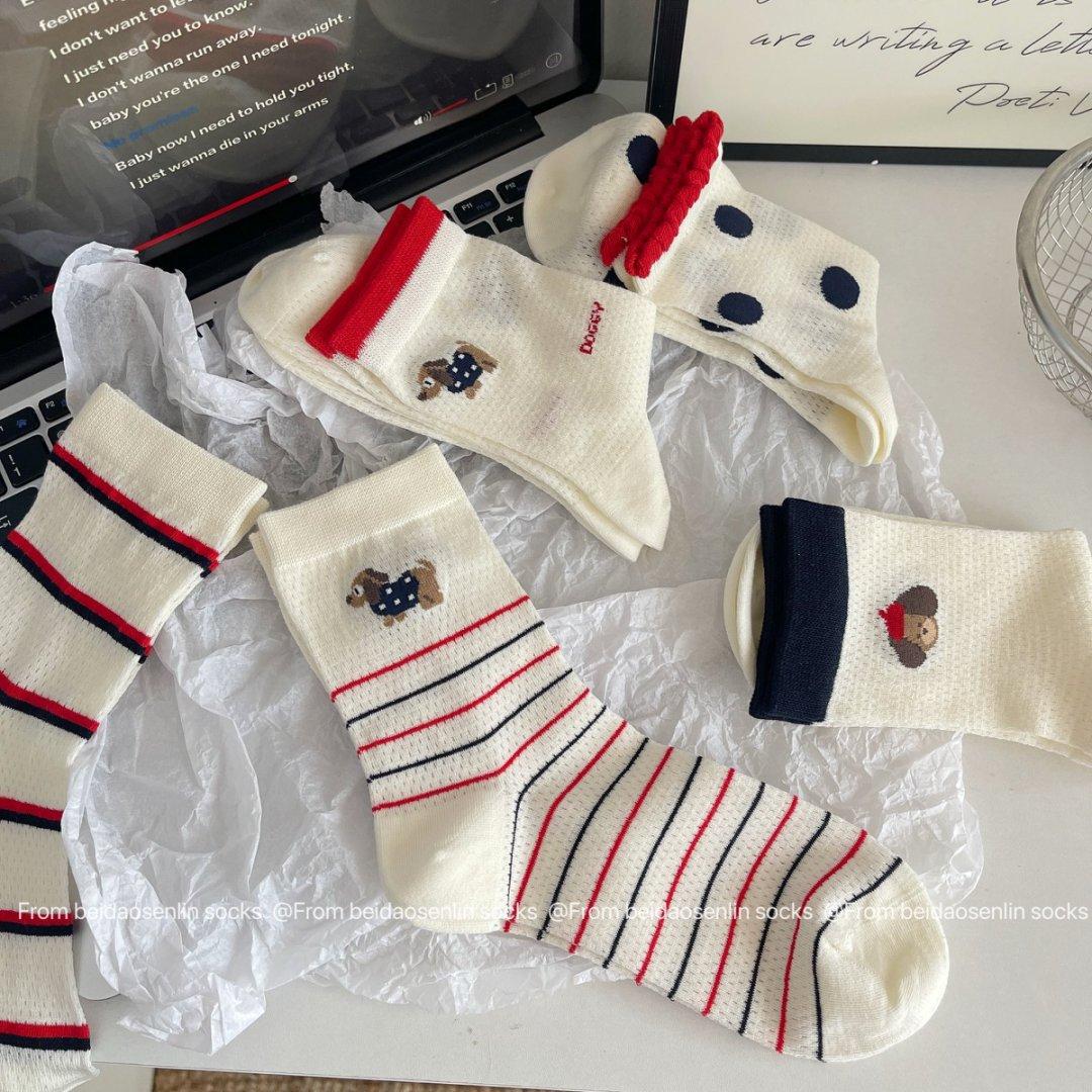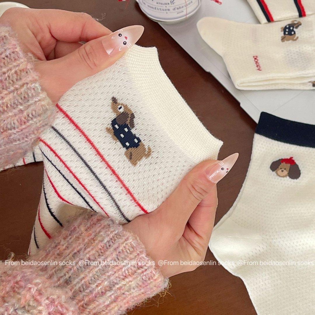 Mekki Calcetines Nuevos para Mujer Calcetines de Malla Rayados de Lunares Calcetines de Dibujos Animados de Perro hasta la Mitad de la Pantorrilla Ligeros y Transpirables Calcetines de Algodón de Moda