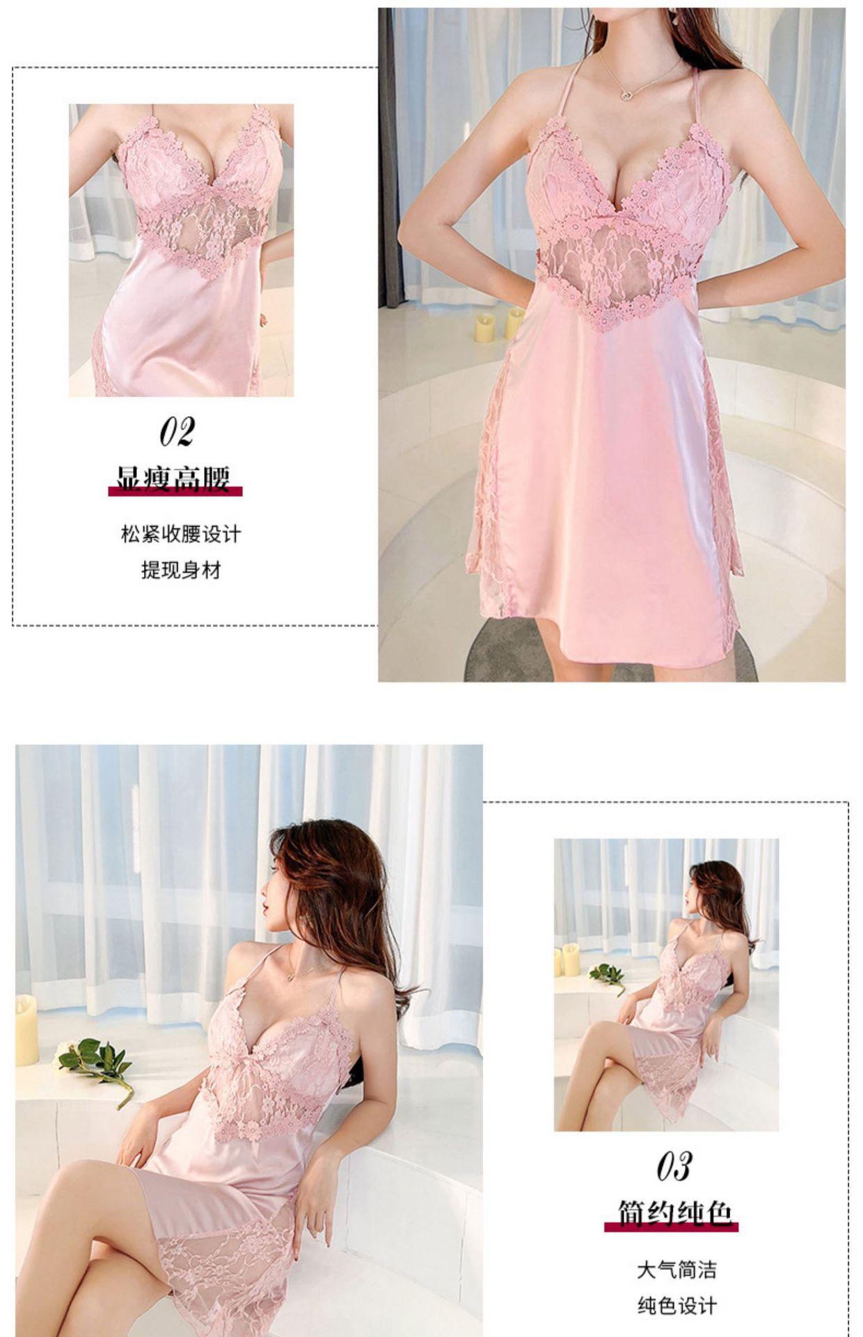 WXLK Satin Silk-Pink Nightgown with Chest Pad