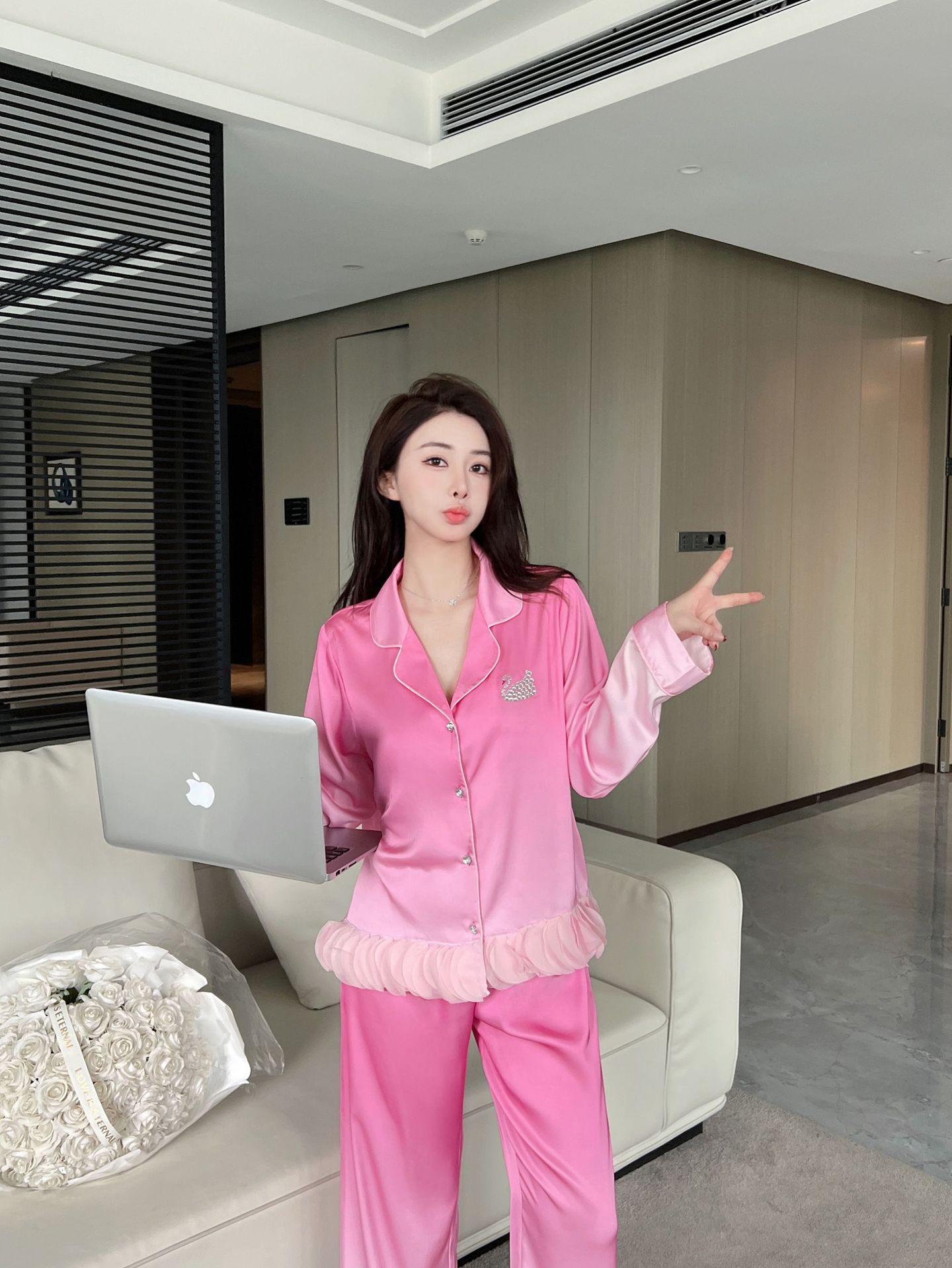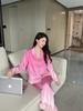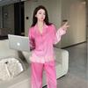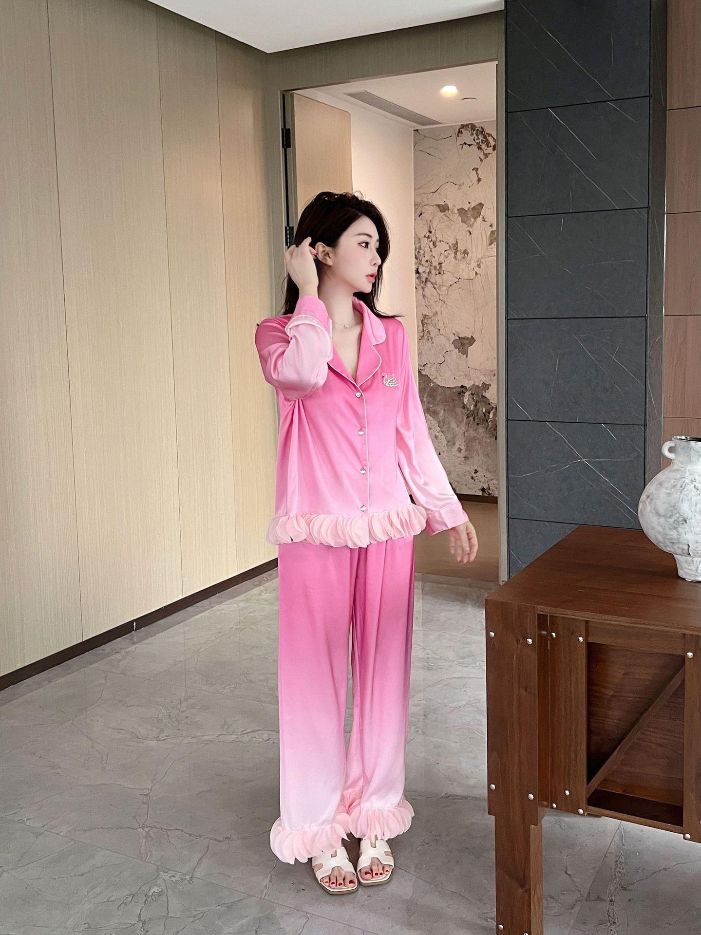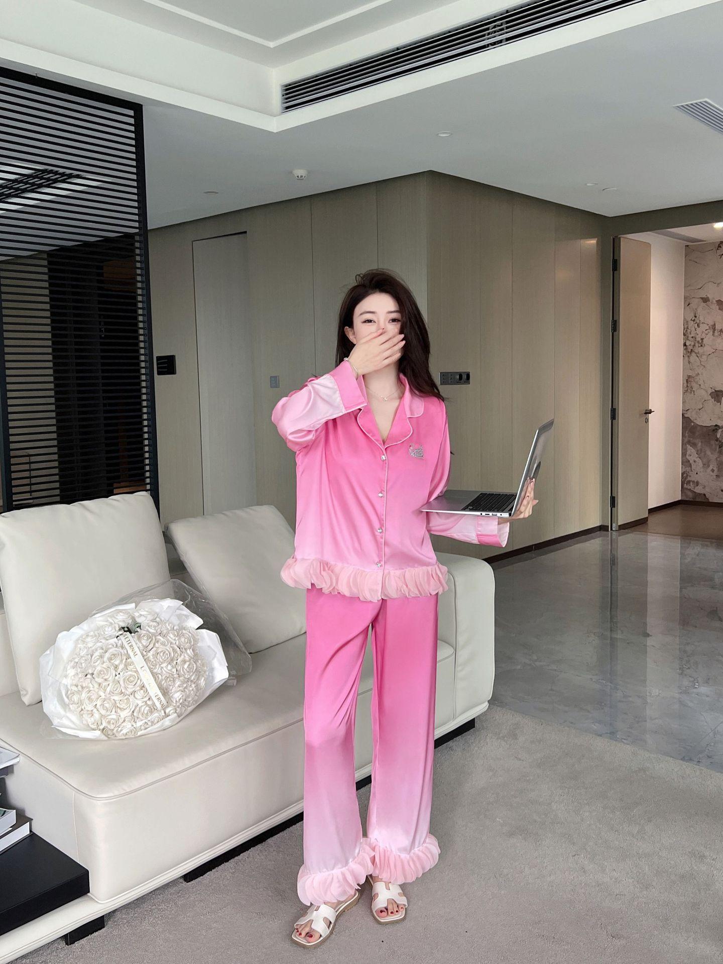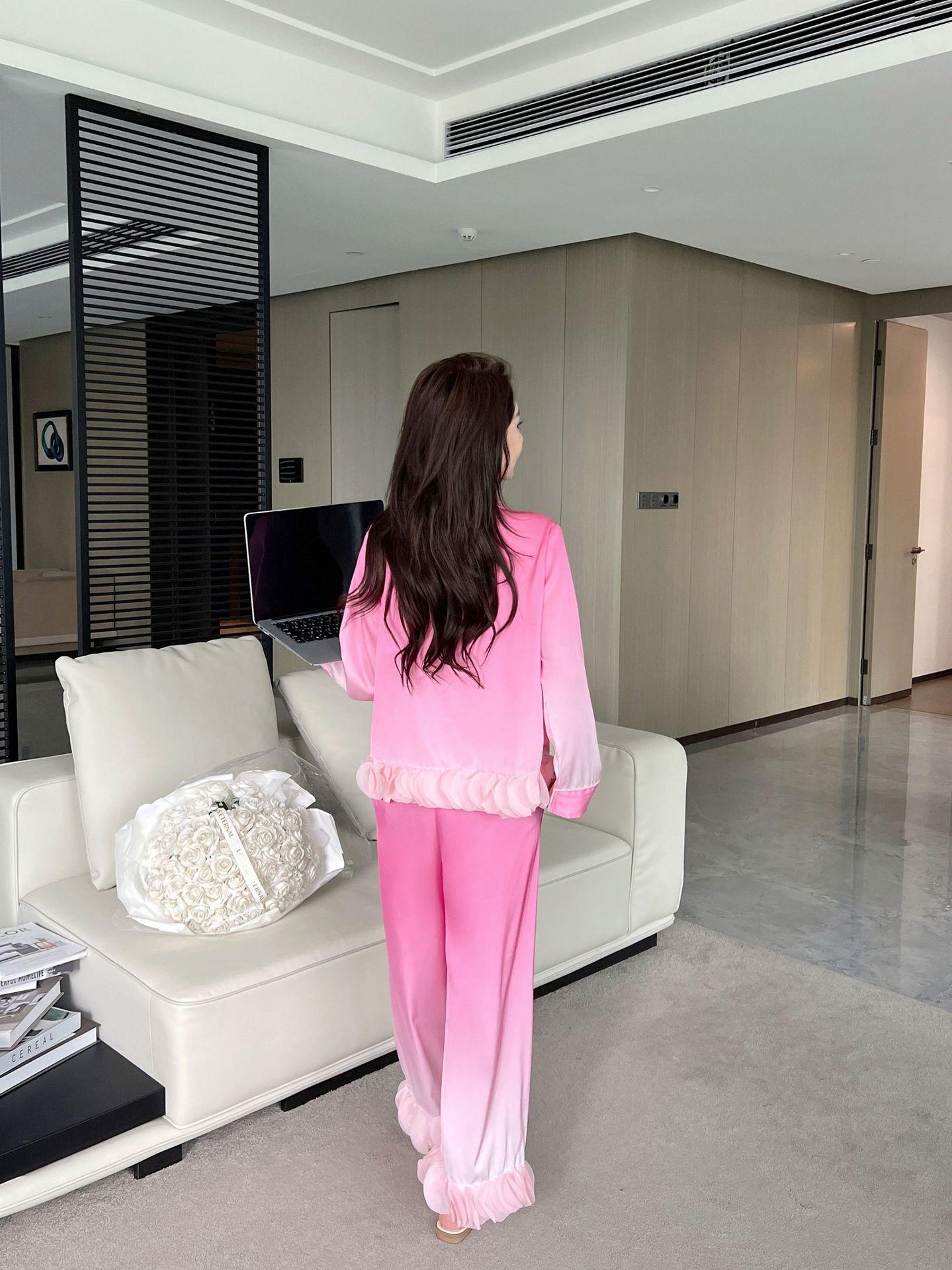 Pijama holgado de seda helada para mujer, cárdigan con degradado y perforación en caliente, pantalones de manga larga, conjunto de dos piezas para el hogar, primavera y otoño de 2025