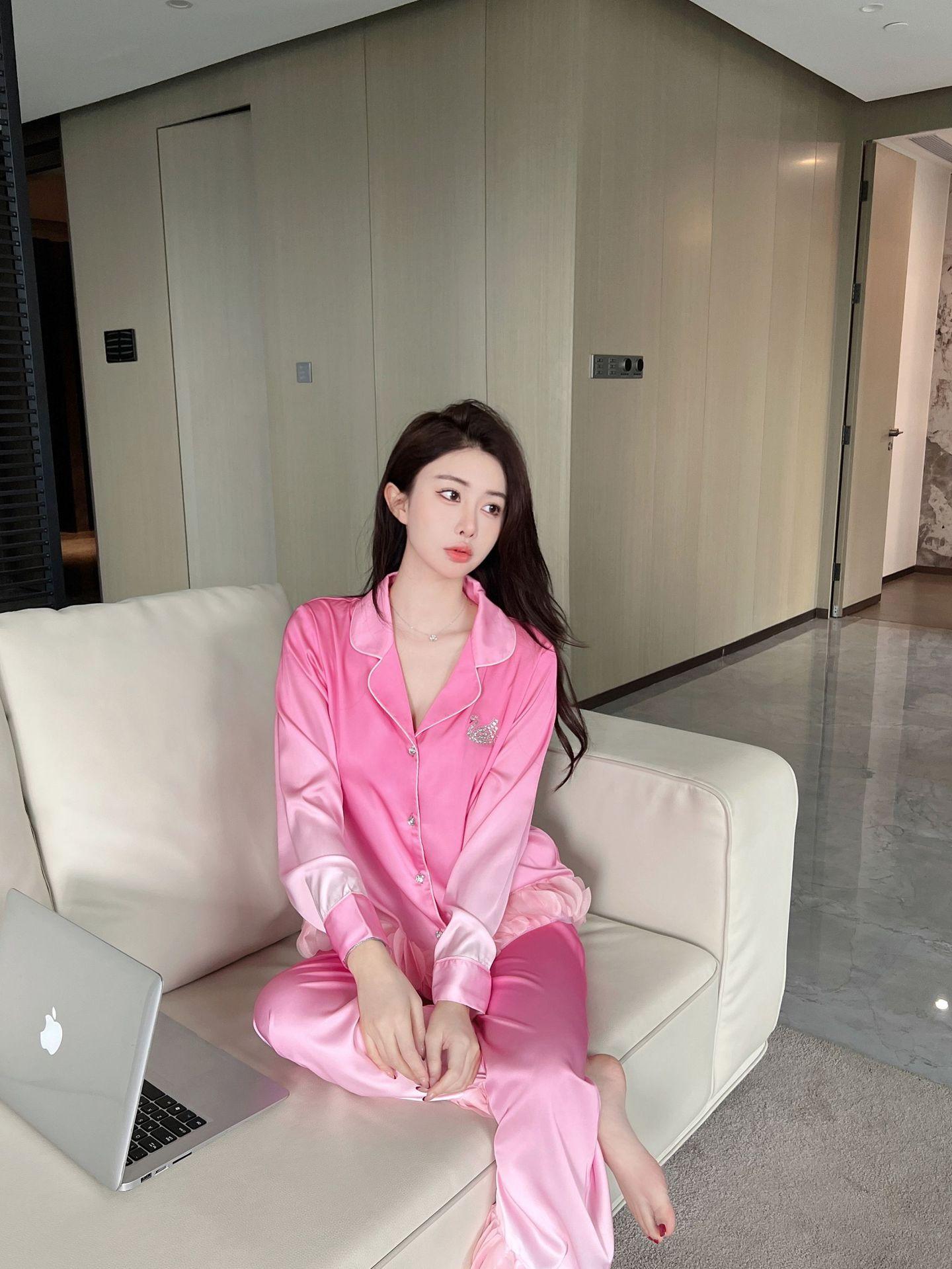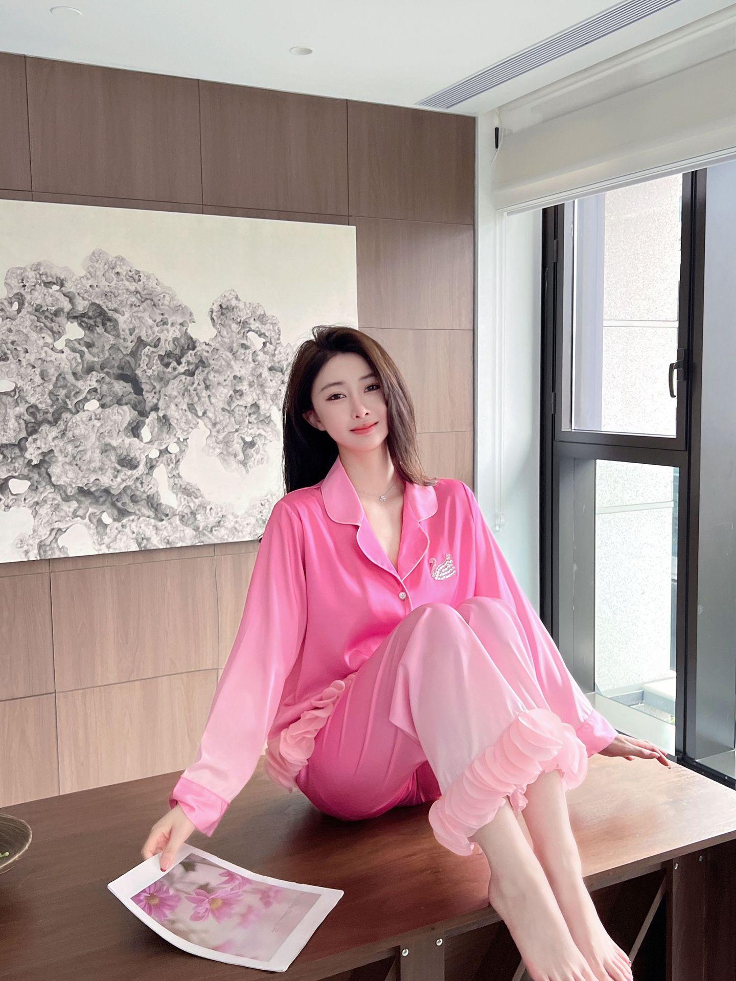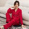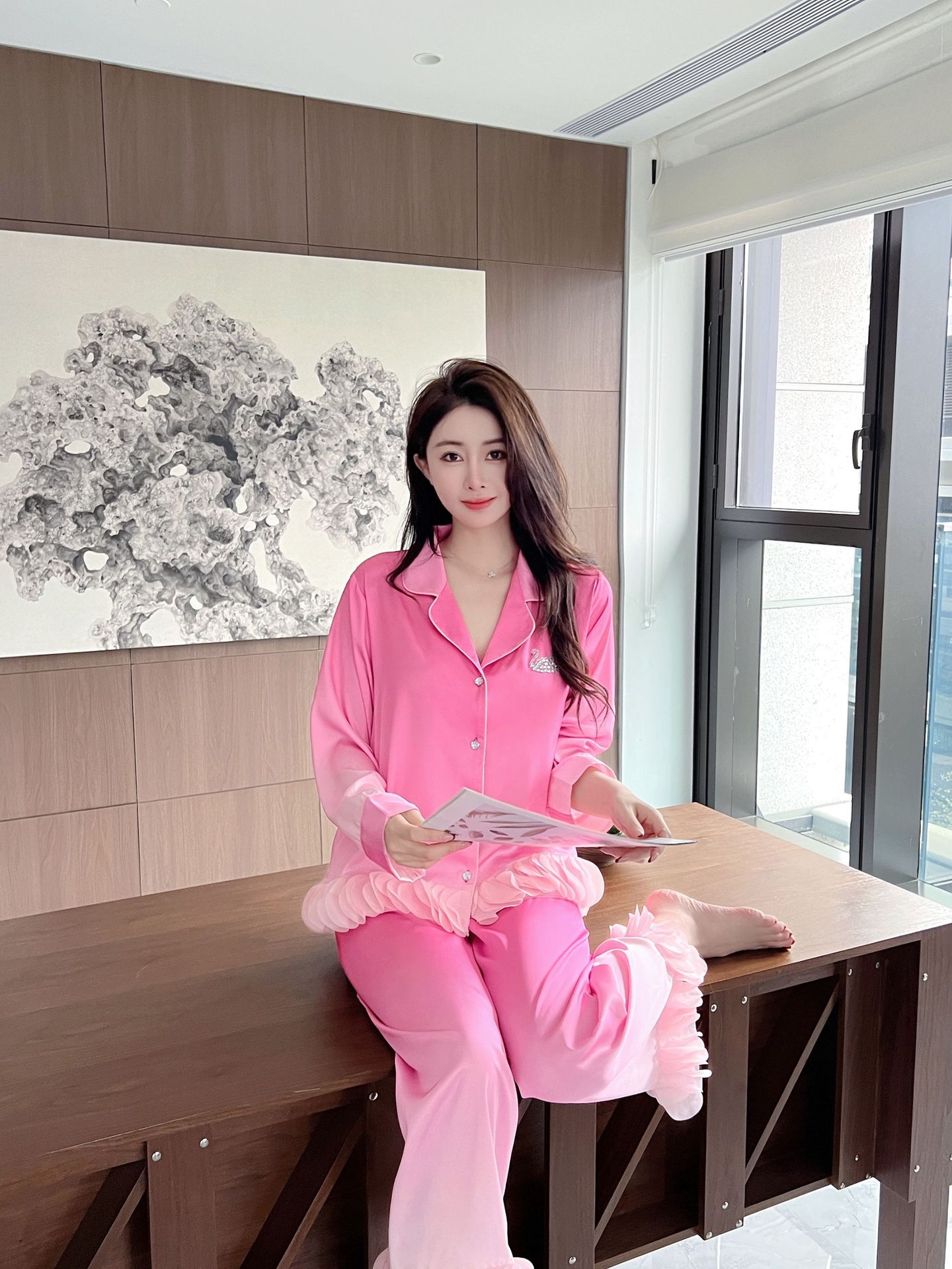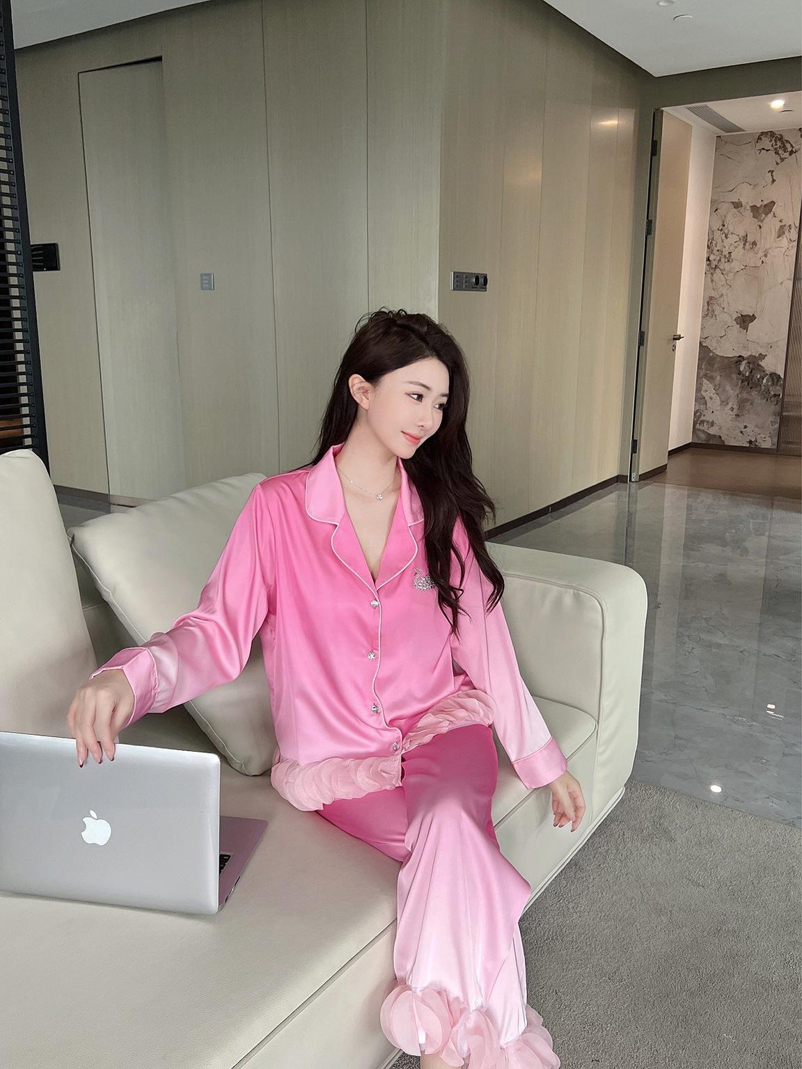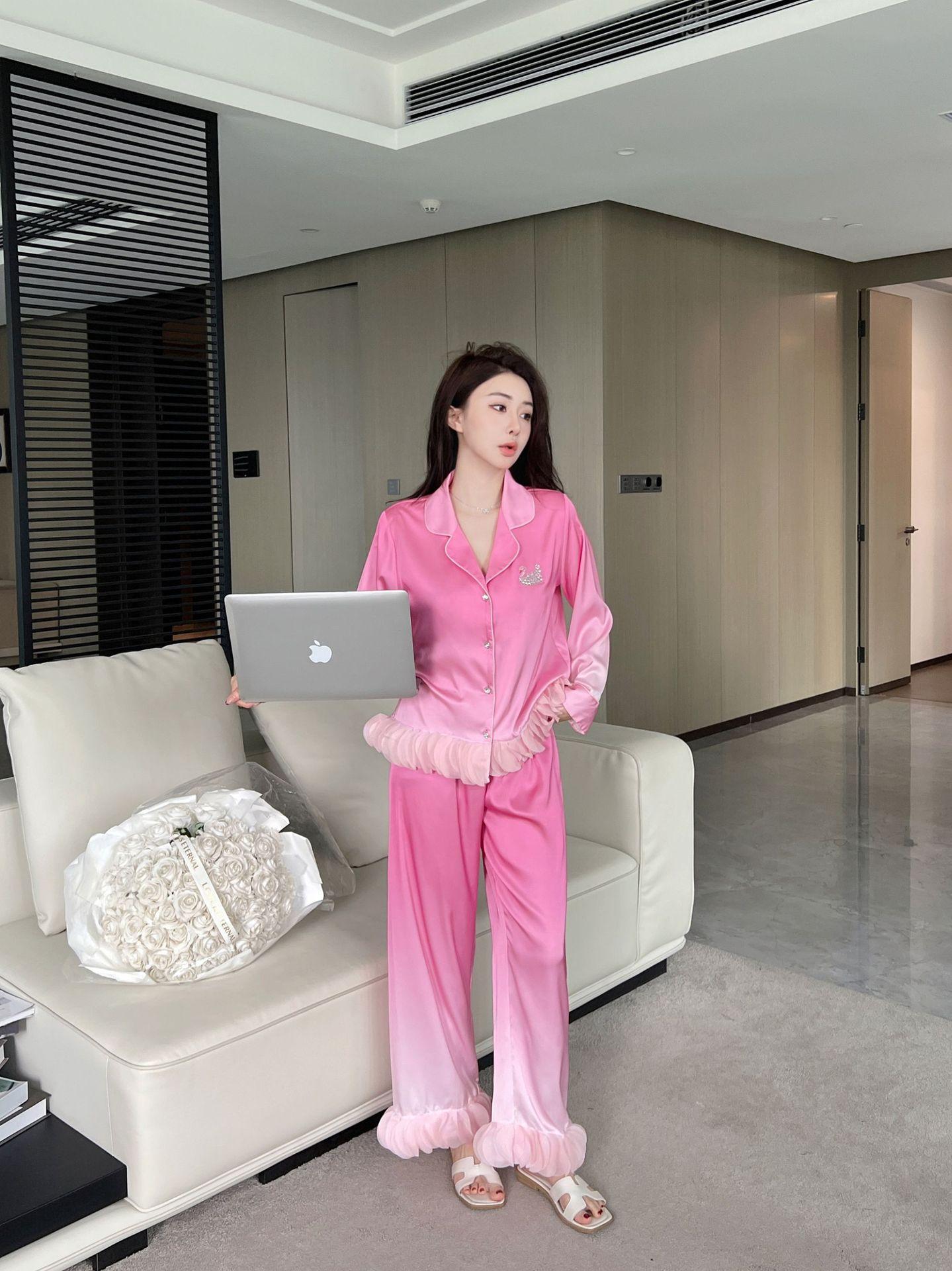 Pijama holgado de seda helada para mujer, cárdigan con degradado y perforación en caliente, pantalones de manga larga, conjunto de dos piezas para el hogar, primavera y otoño de 2025