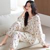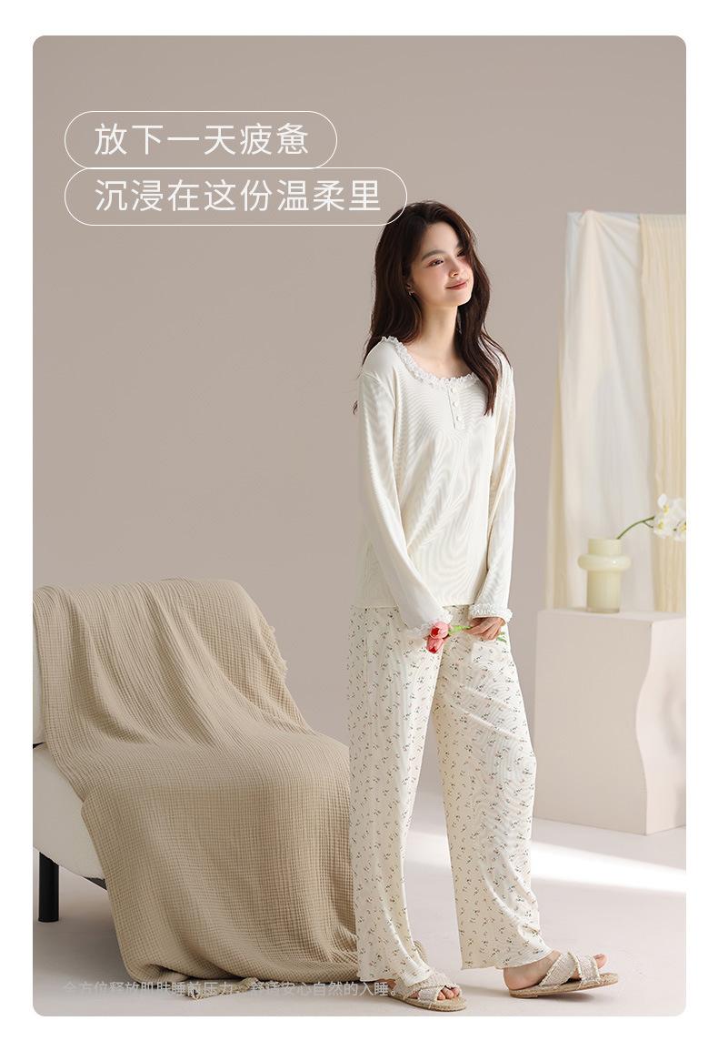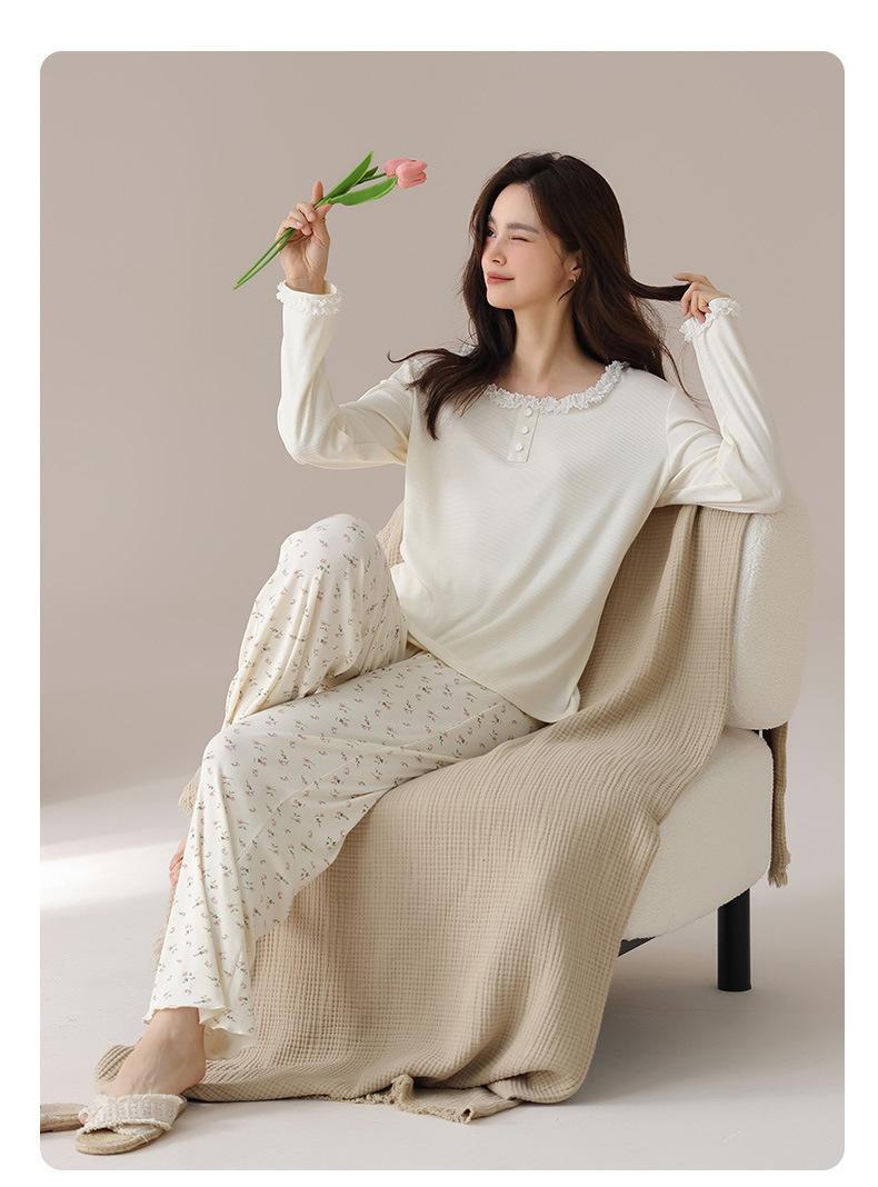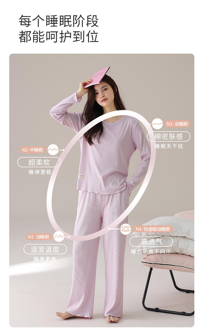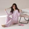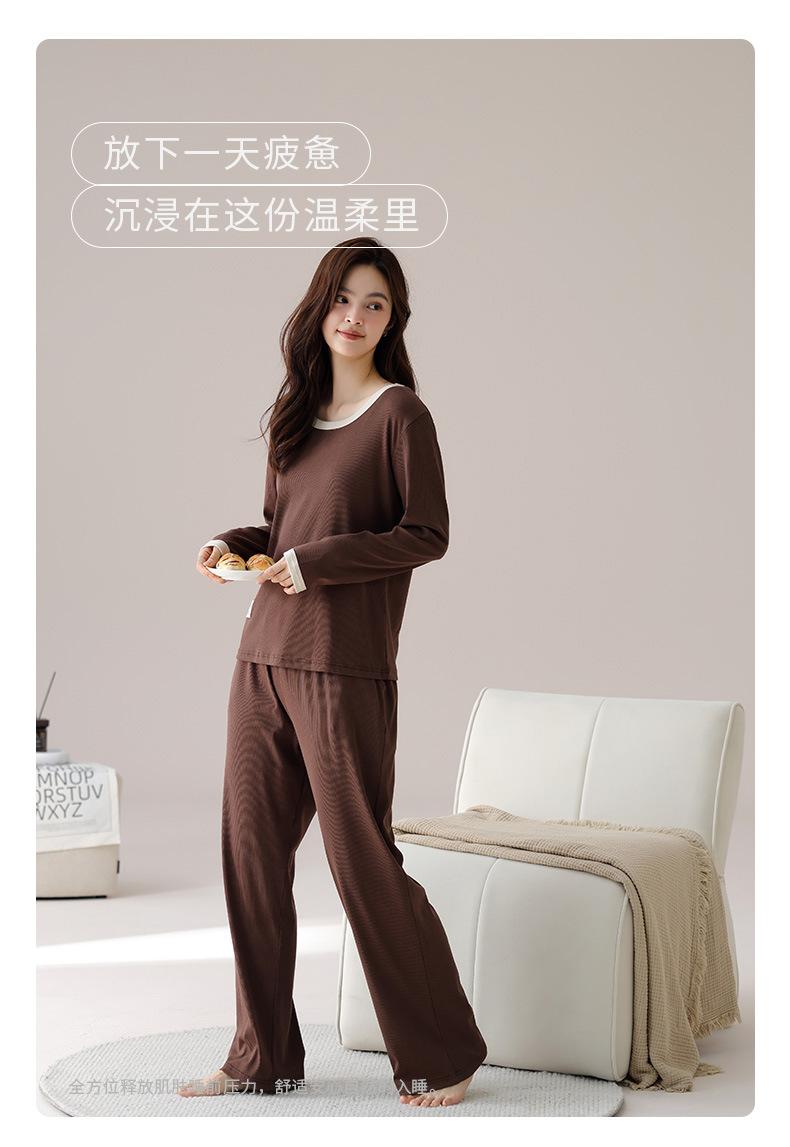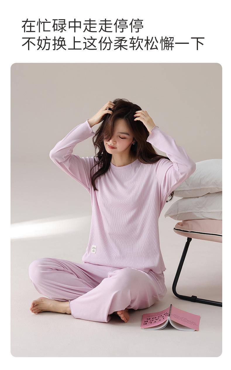 Pijama para Mujer Algodón Puro Primavera y Otoño Algodón Suave Moda Cuello Redondo Manga Larga Pantalón Traje Perezoso de Alta Gama Ropa para el Hogar Mujer