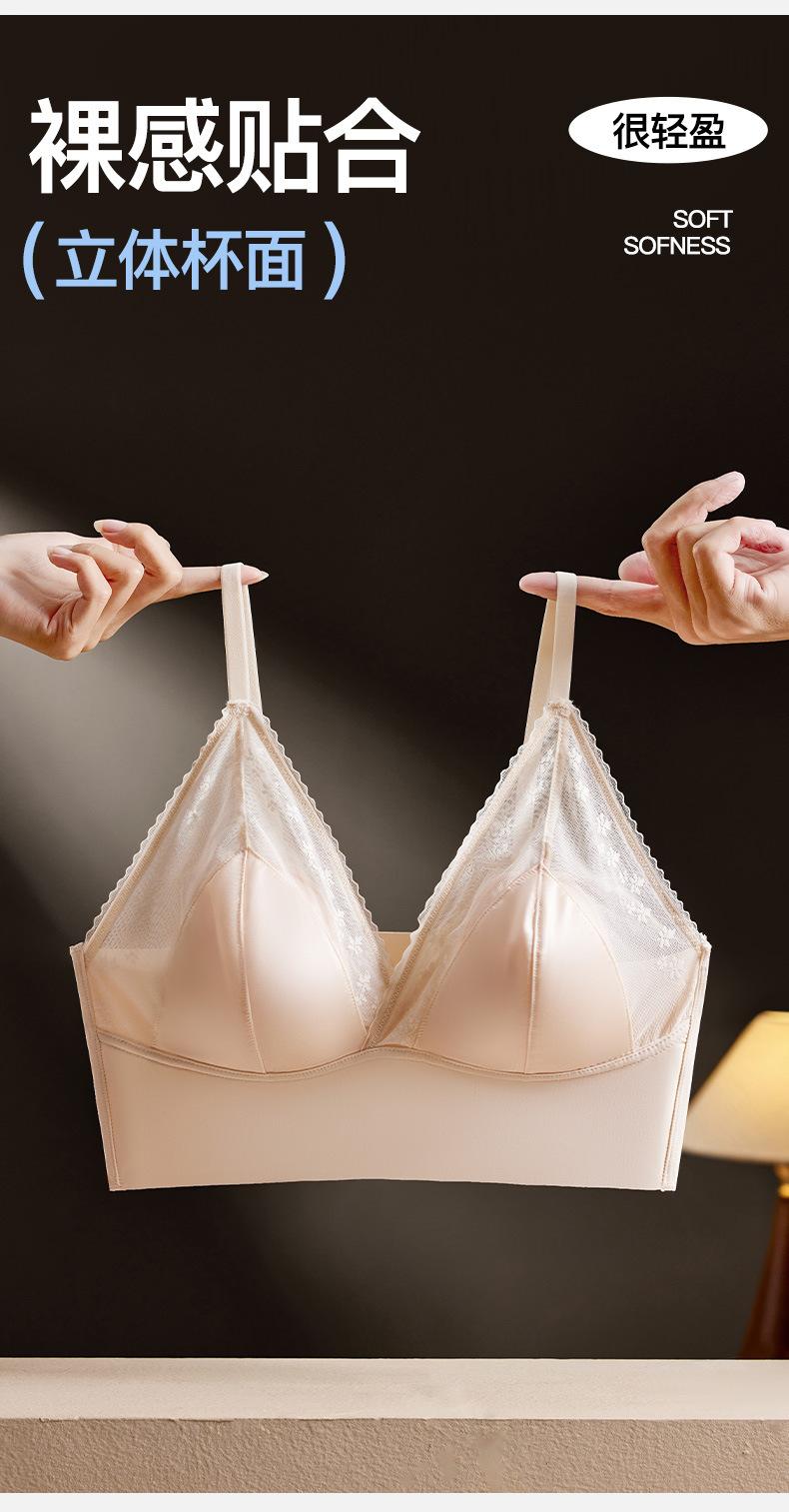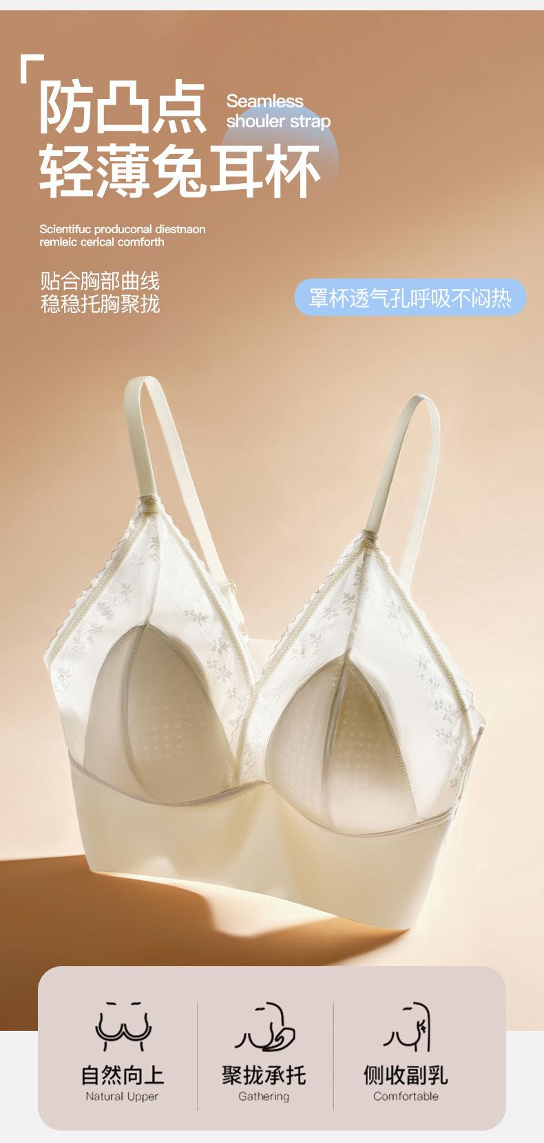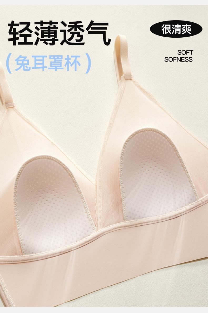 Sujetador Envolvente Sin Costuras de Encaje de Malla Satinada con Almohadilla de Orejas de Conejo Fijas, Tirantes, Espalda Hermosa, Transpirable, Desnudo, Elegante