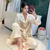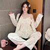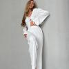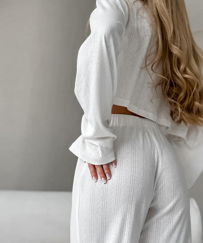 2025 Europa y Estados Unidos transfronterizo primavera blanco traje de pijama de punto jacquard calado cárdigan manga larga pantalones ropa de casa para mujer