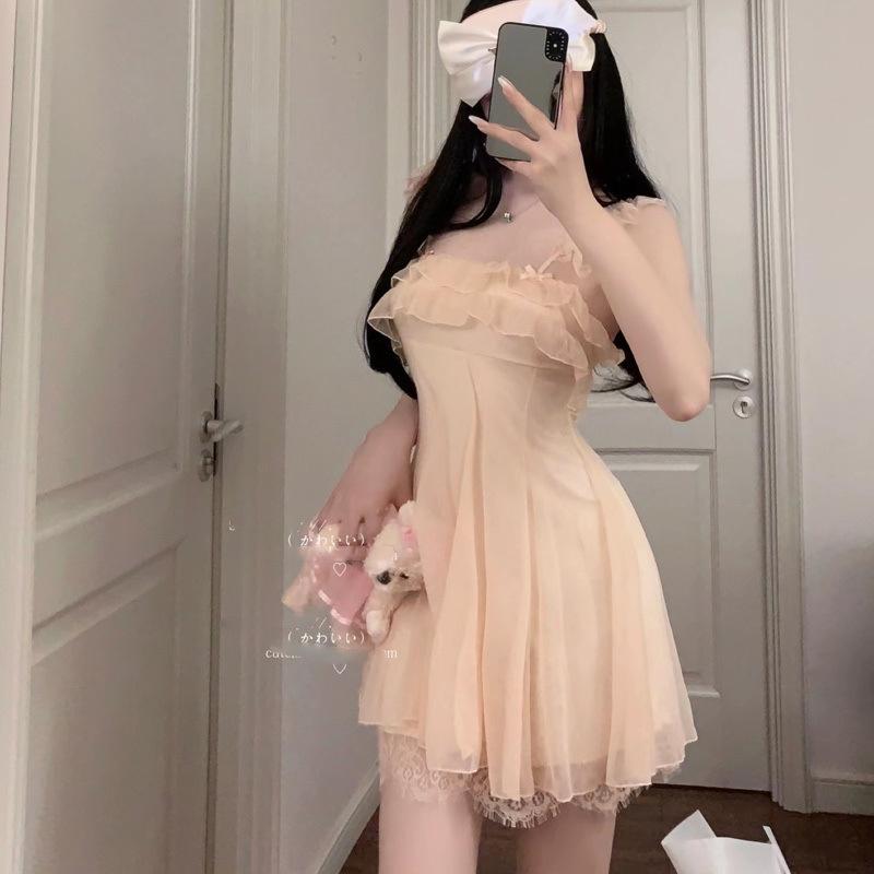 Nuevo Encaje de Verano para Mujer Estilo Princesa de Encaje Francés Hombro Descubierto Popular en Internet Ropa para el Hogar con Almohadilla para el Pecho