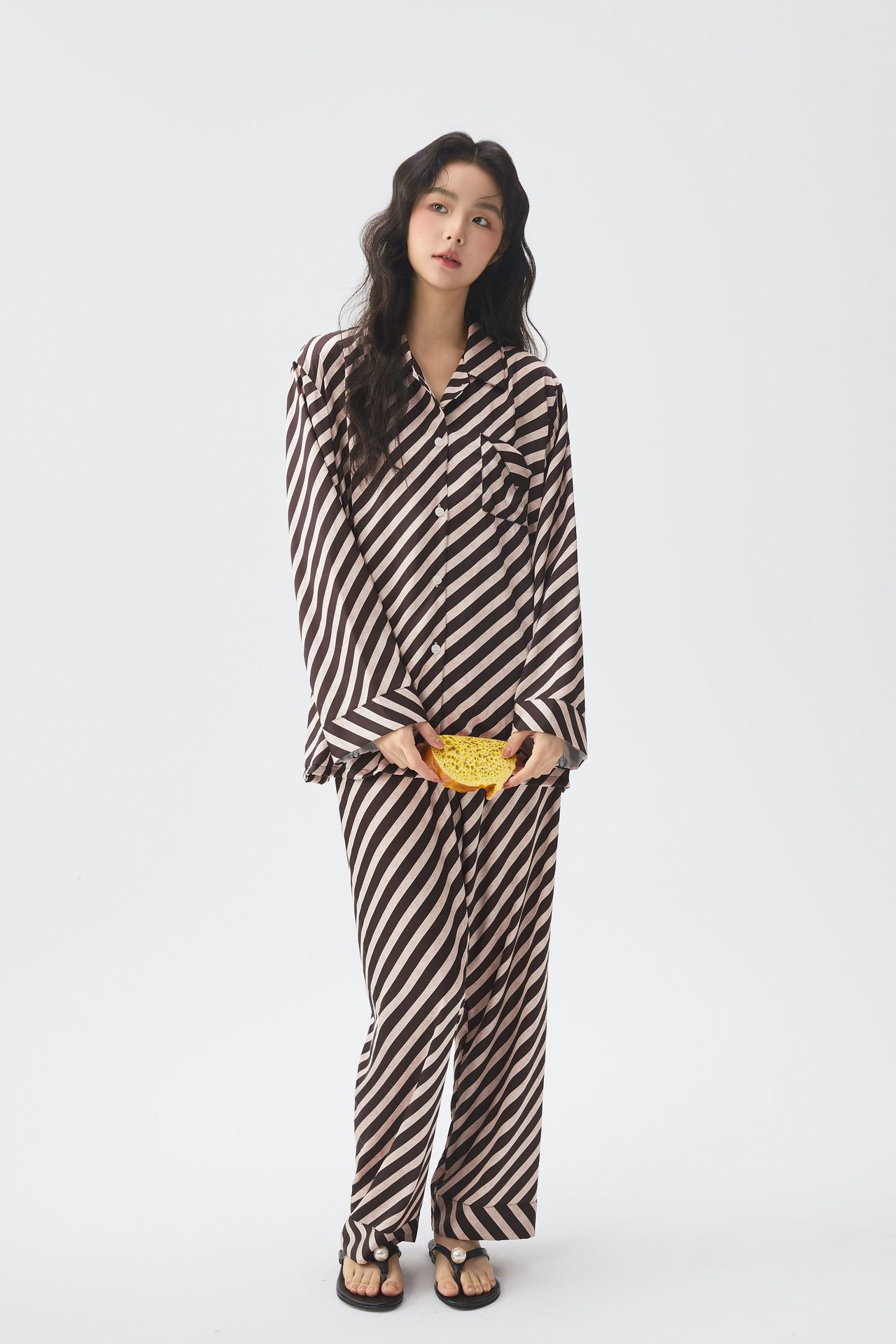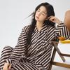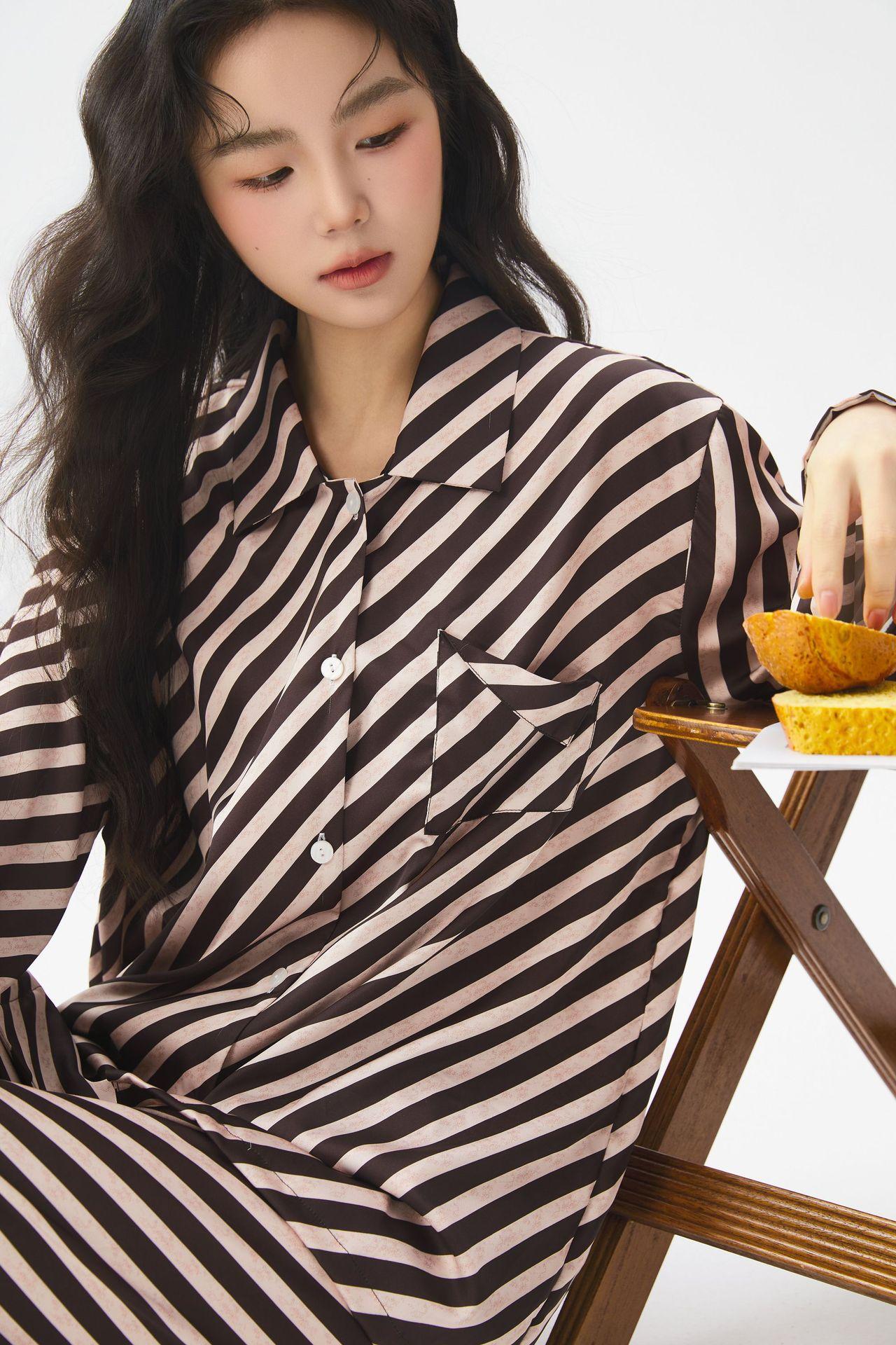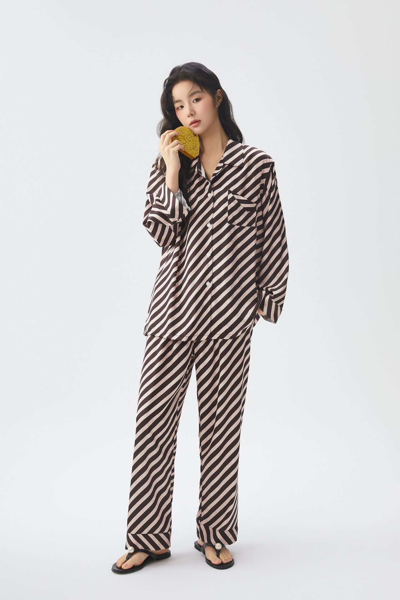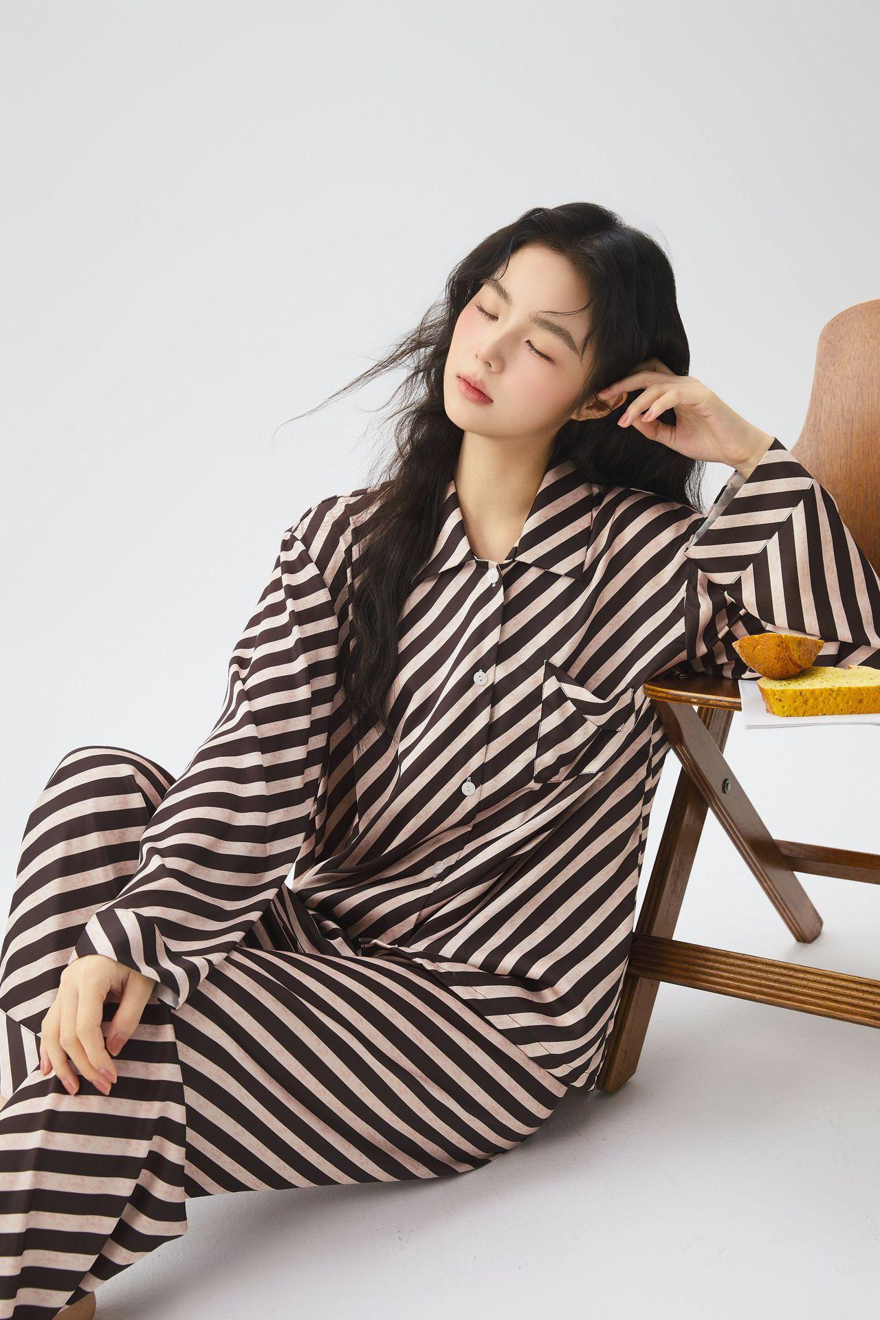 Pijama para Mujer Sencillo de Raya Oblicua Café de Alta Gama Seda de Hielo Seda Principios de Primavera Cómodo de Manga Larga Traje de Ropa para Casa