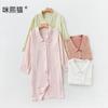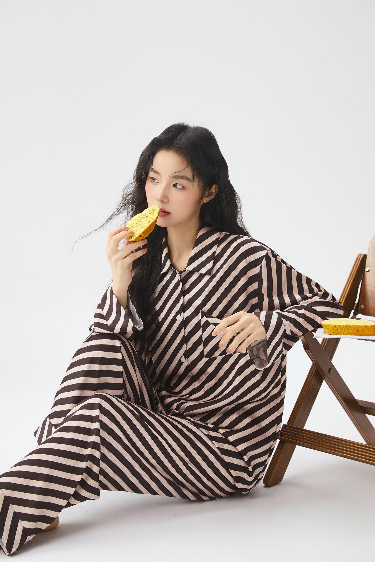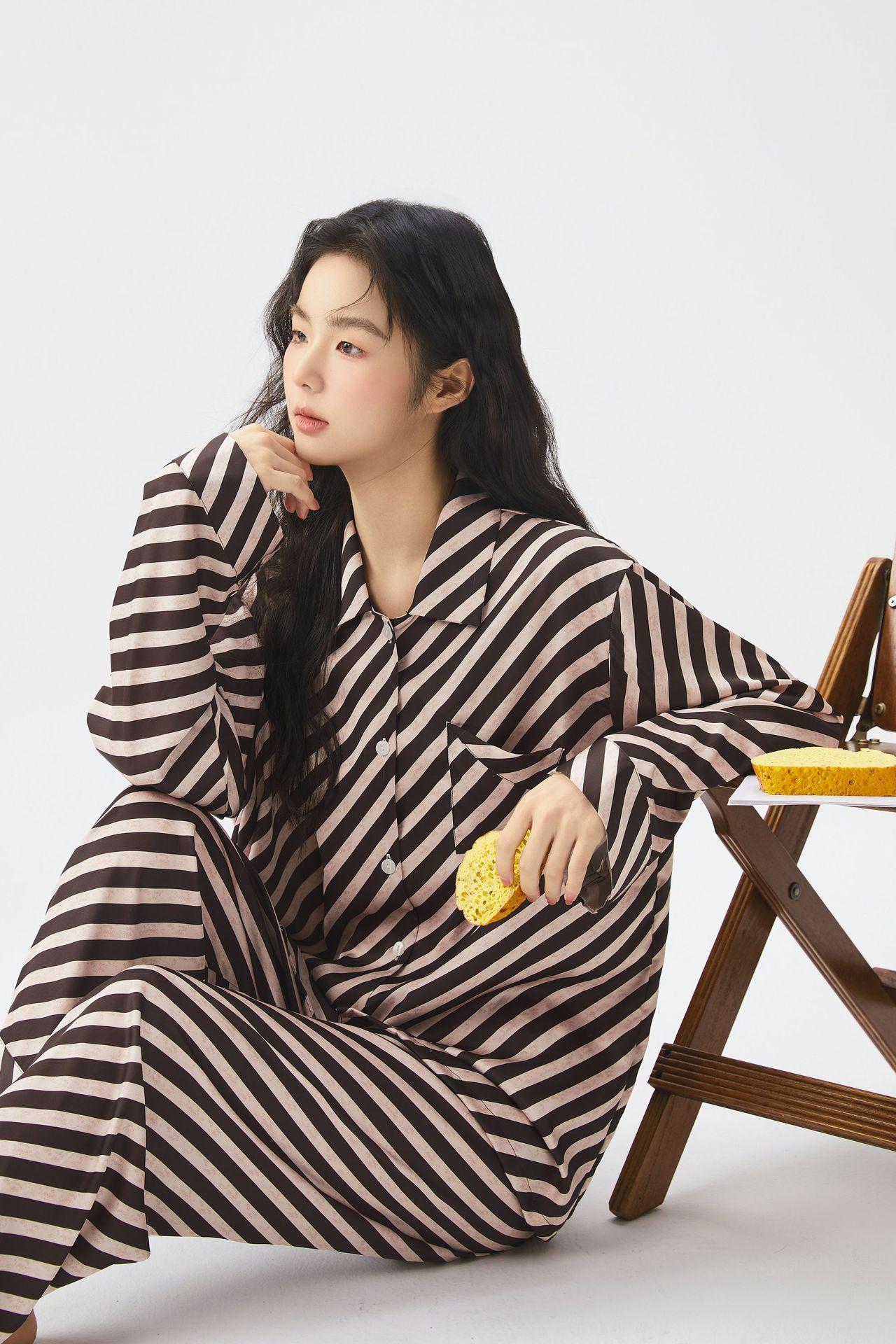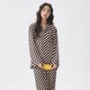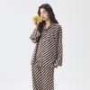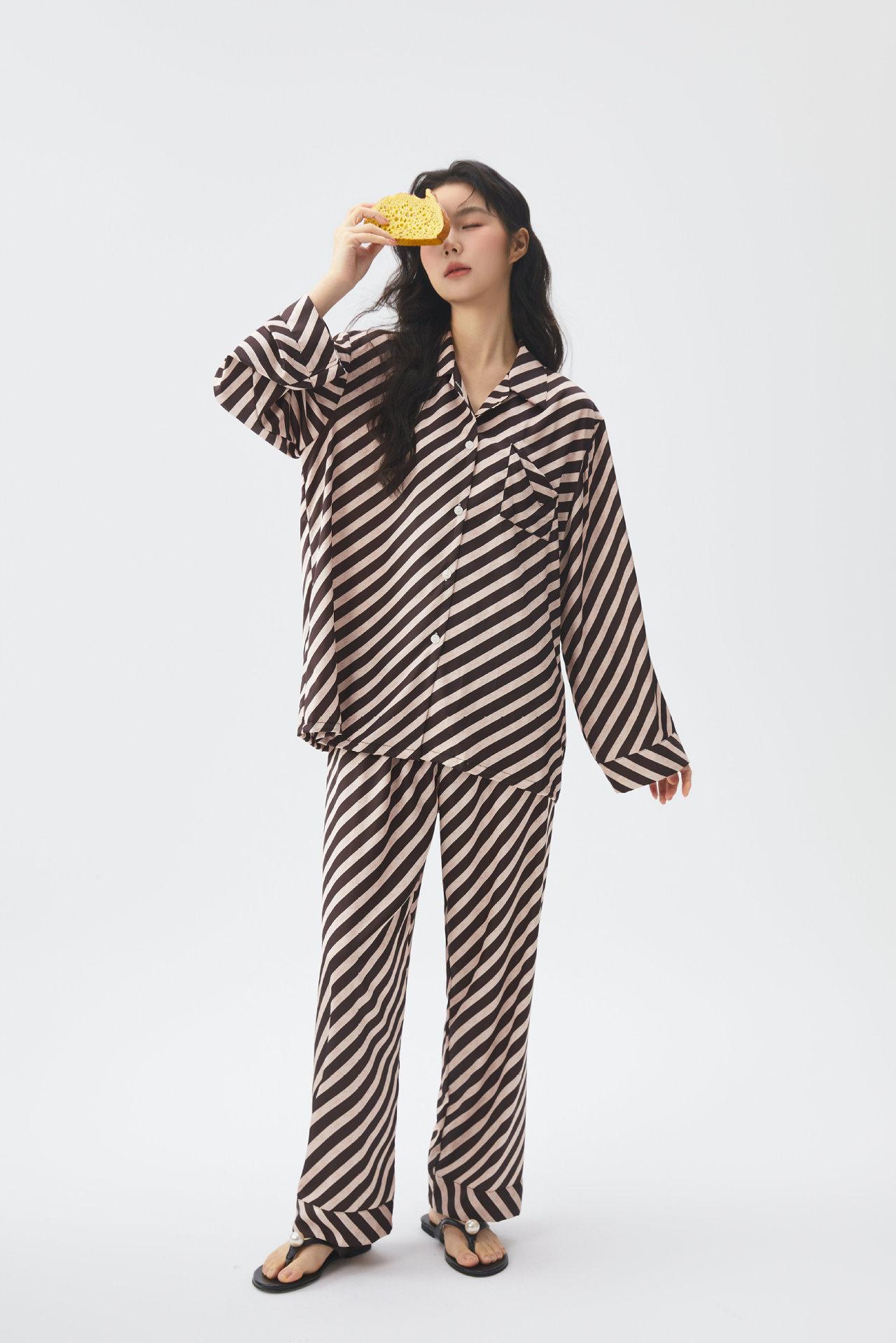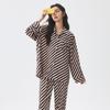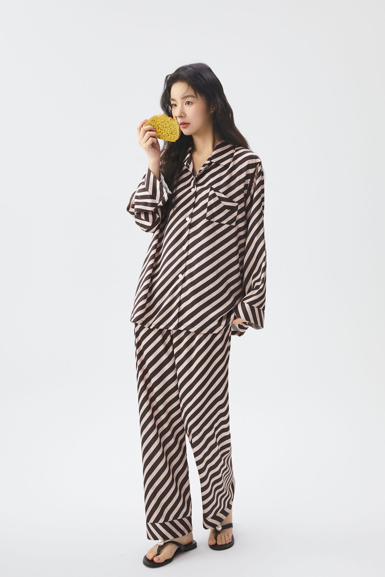 Pijama para Mujer Sencillo de Raya Oblicua Café de Alta Gama Seda de Hielo Seda Principios de Primavera Cómodo de Manga Larga Traje de Ropa para Casa