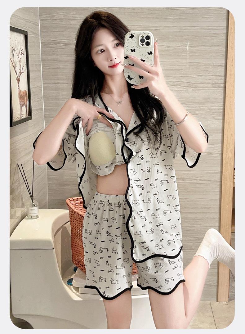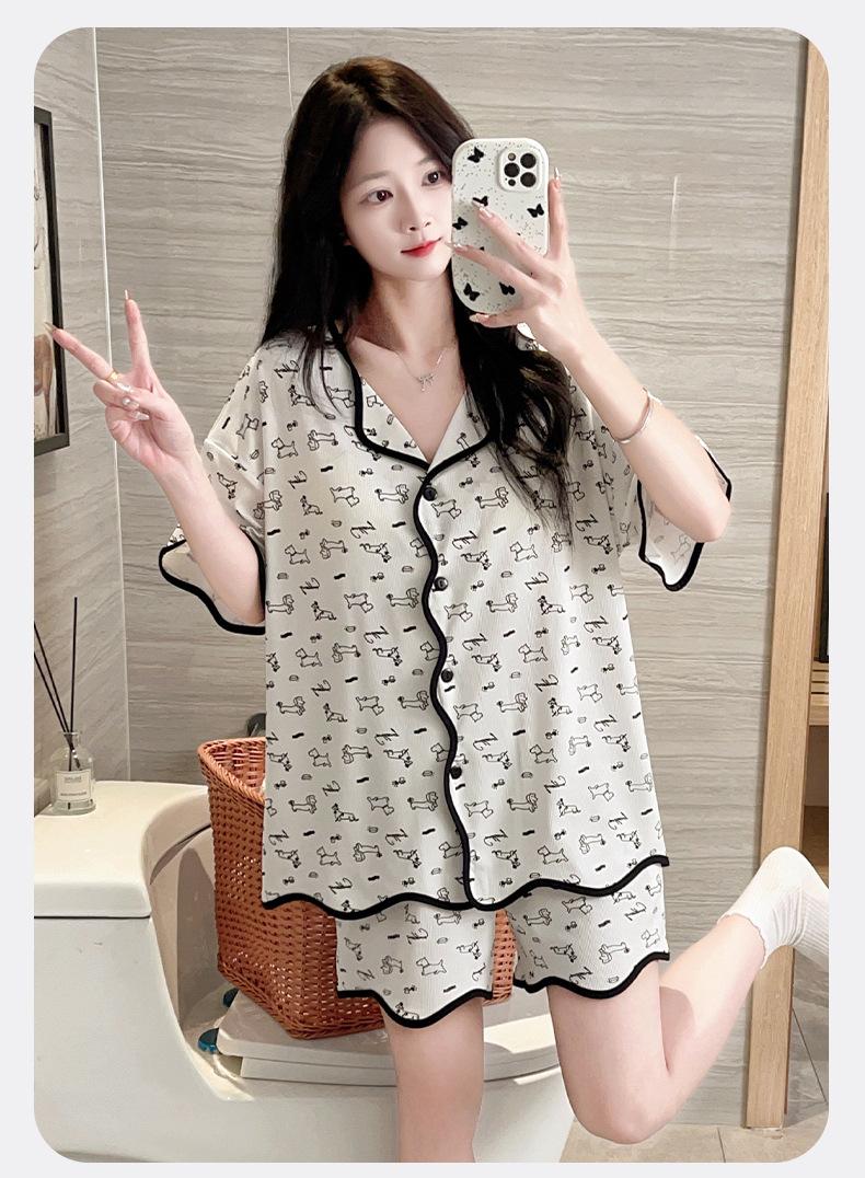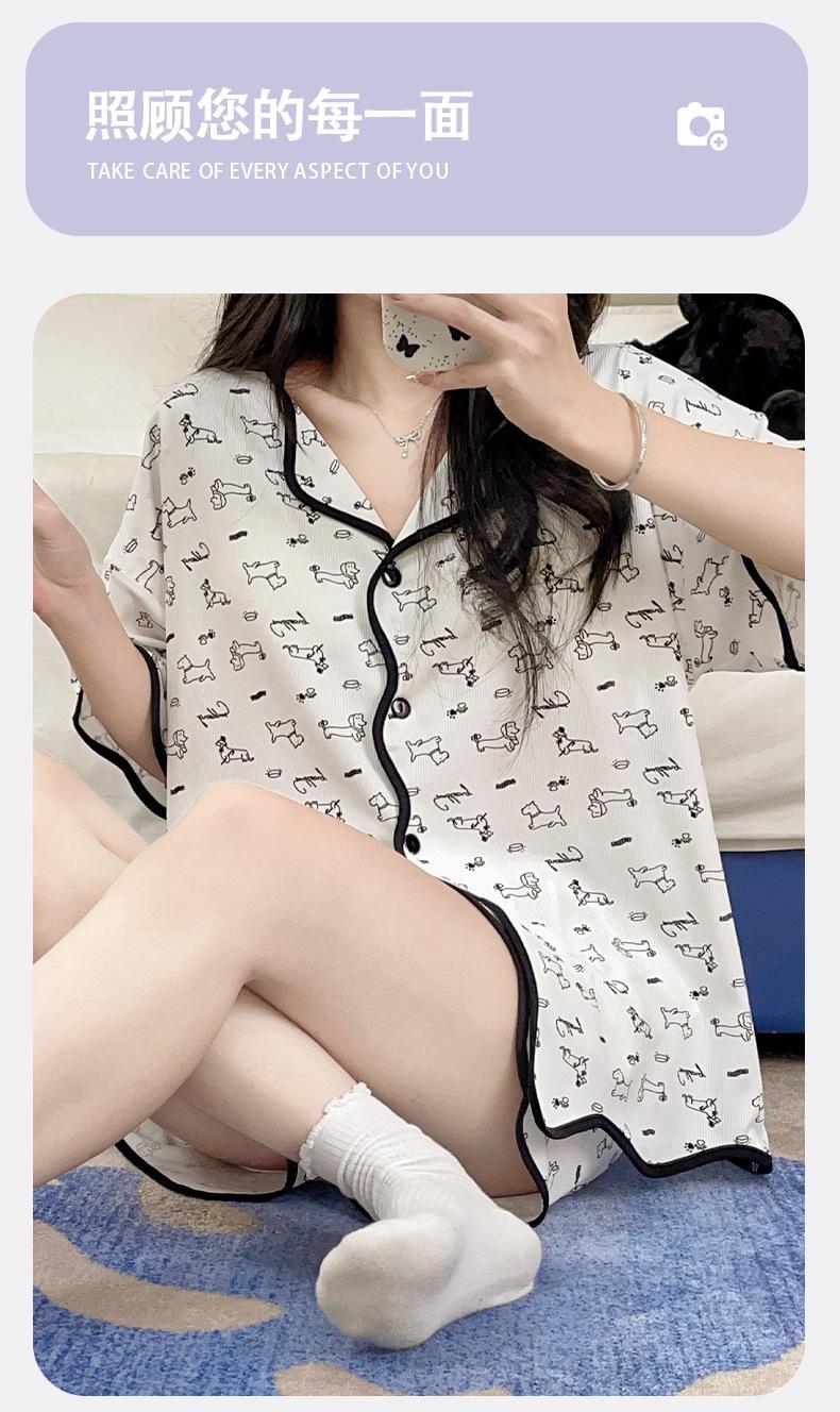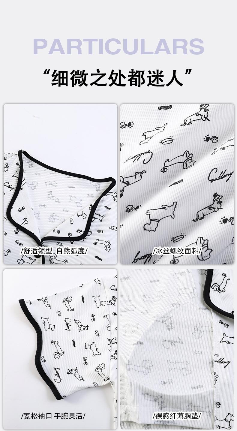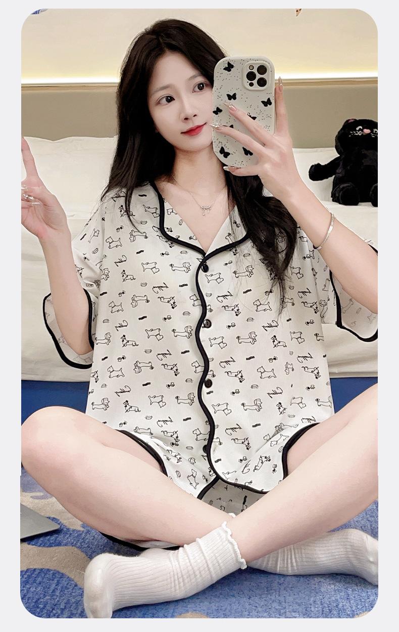 Pijama de una pieza con almohadilla para el pecho para mujer, pantalones cortos de verano de manga corta, cárdigan con bonitos dibujos de cachorros, ropa de verano para el hogar.