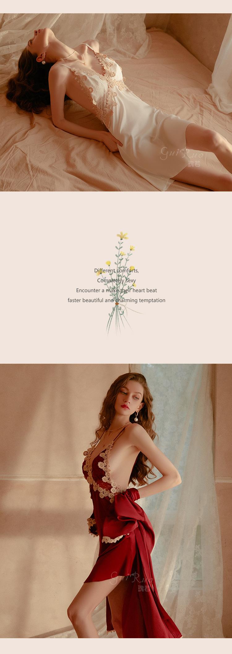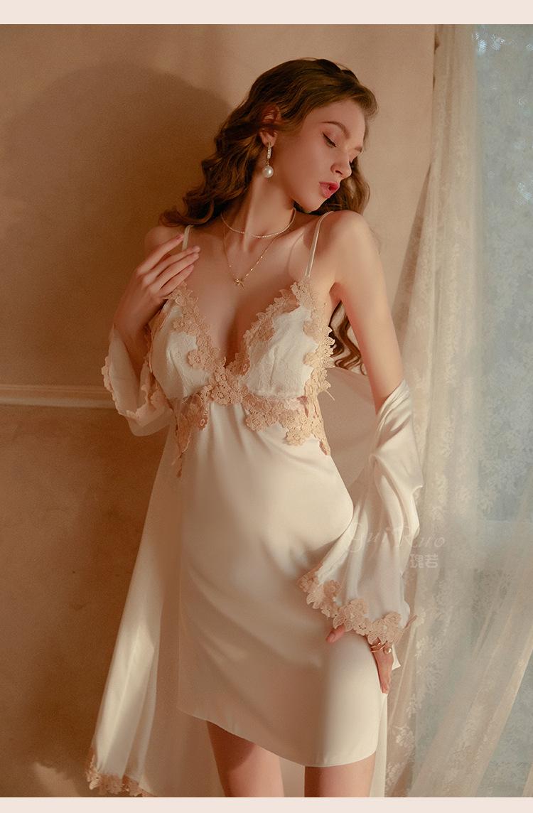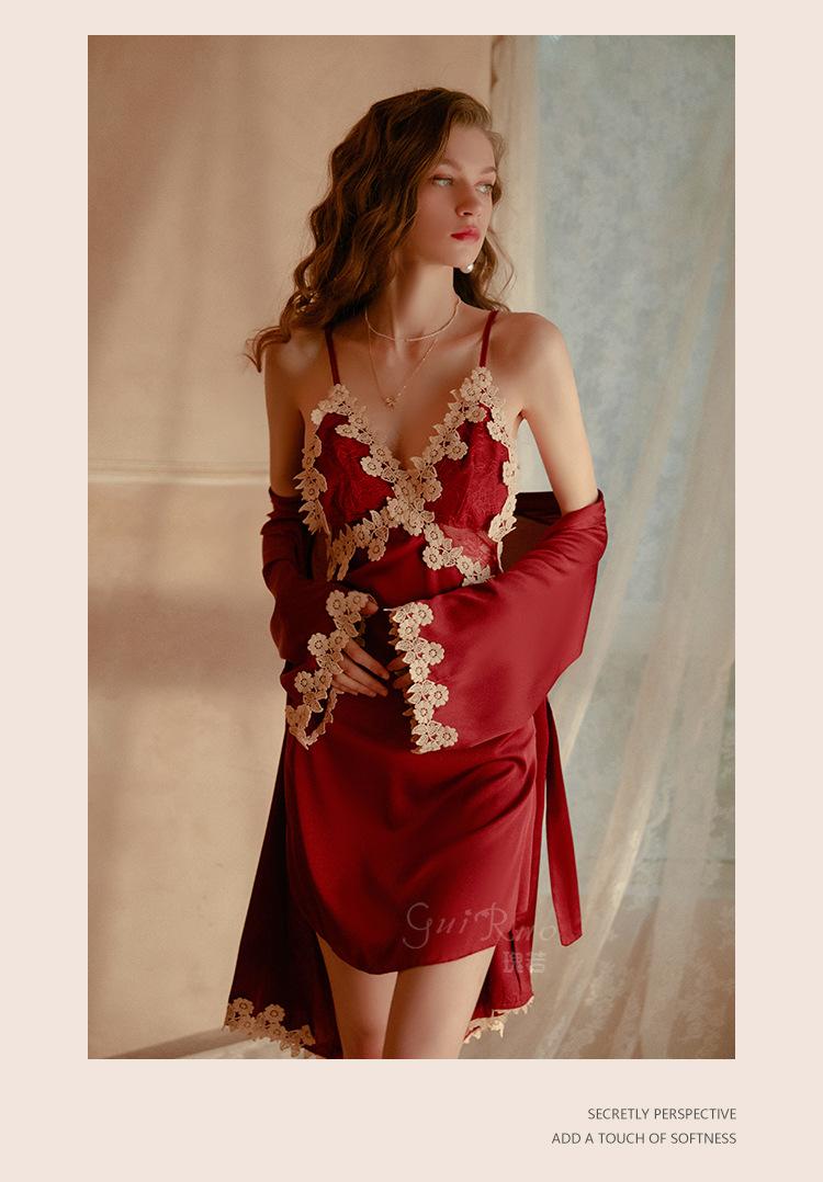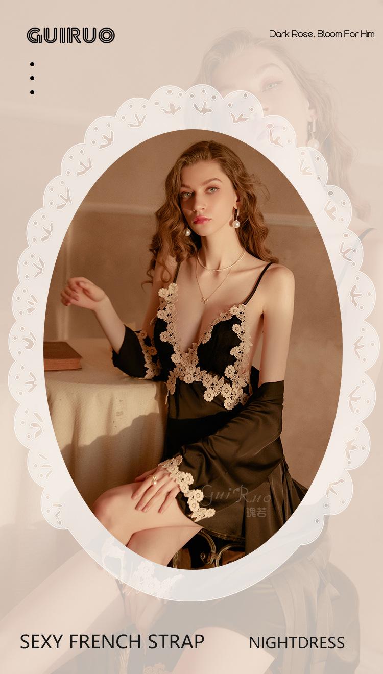 Guiruo - Camisón de manga larga con encaje y satén sedoso para mujer, cómodo, tipo cárdigan, para el hogar, 1203