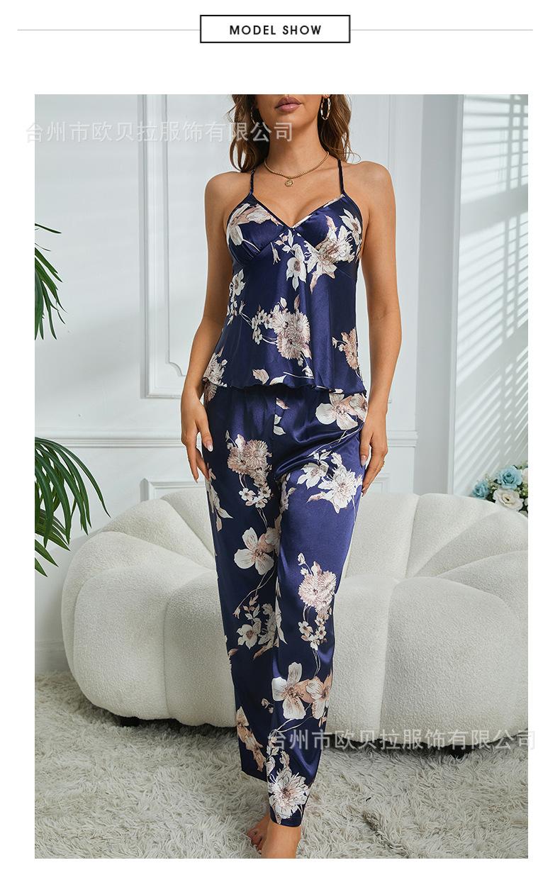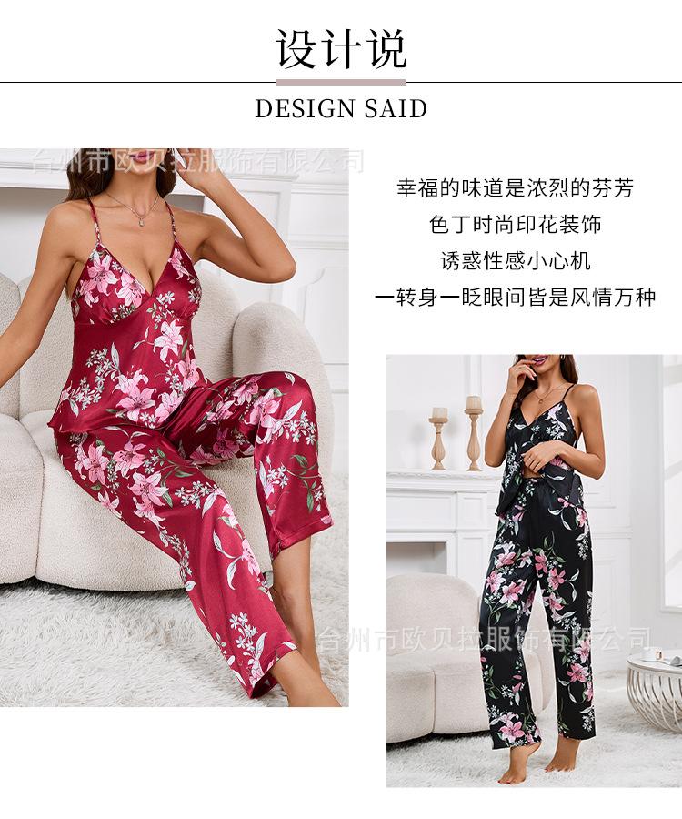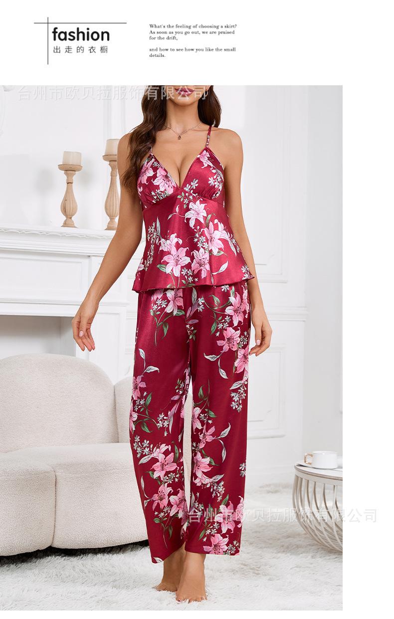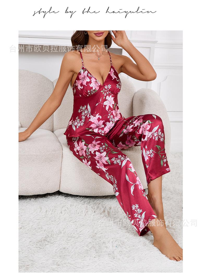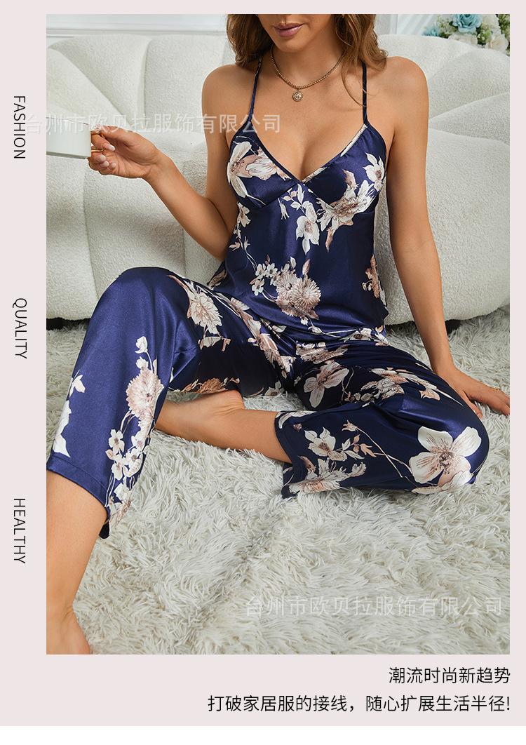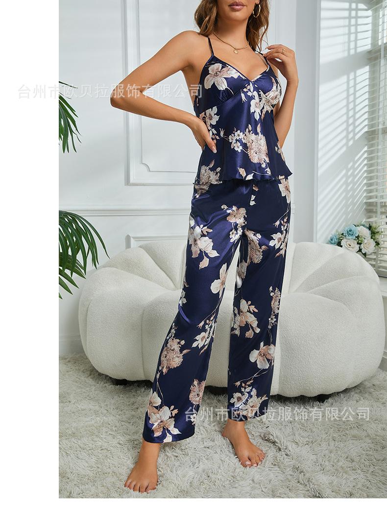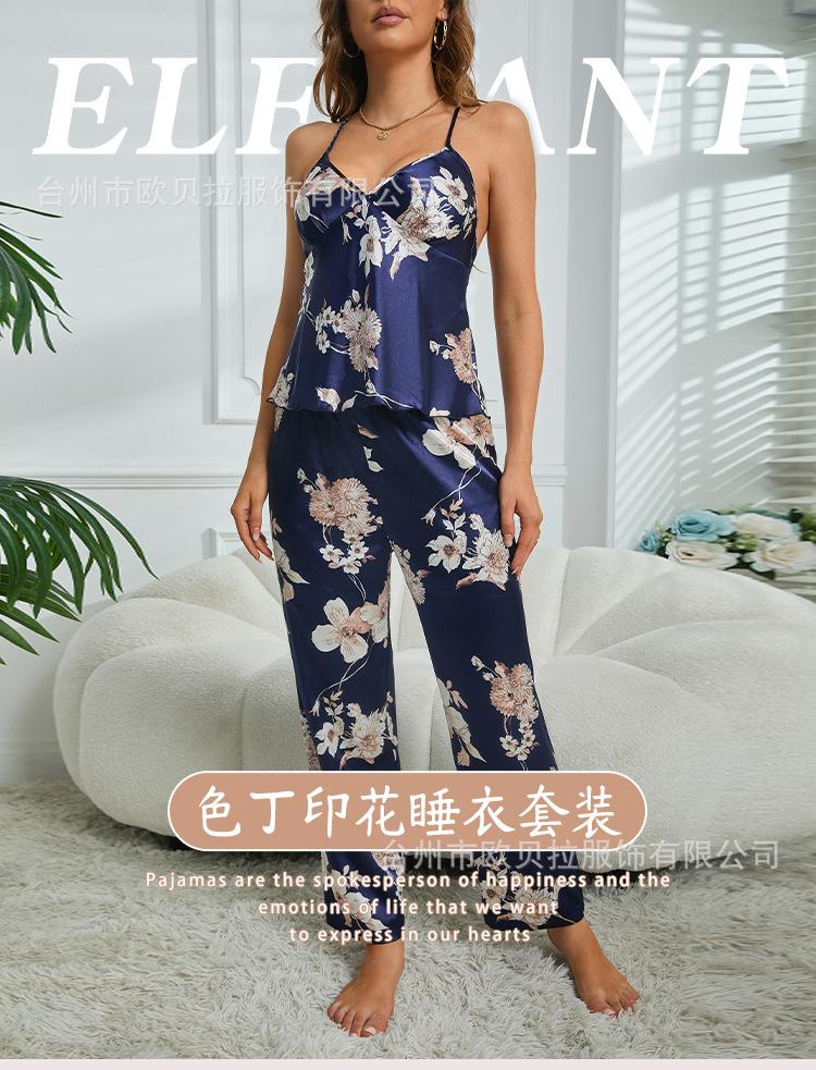 Pantalones de tirantes con estampado de seda de hielo de Amazon para primavera y verano, pijamas sexys de comercio exterior europeo y americano transfronterizos para mujeres TEMU Explosions