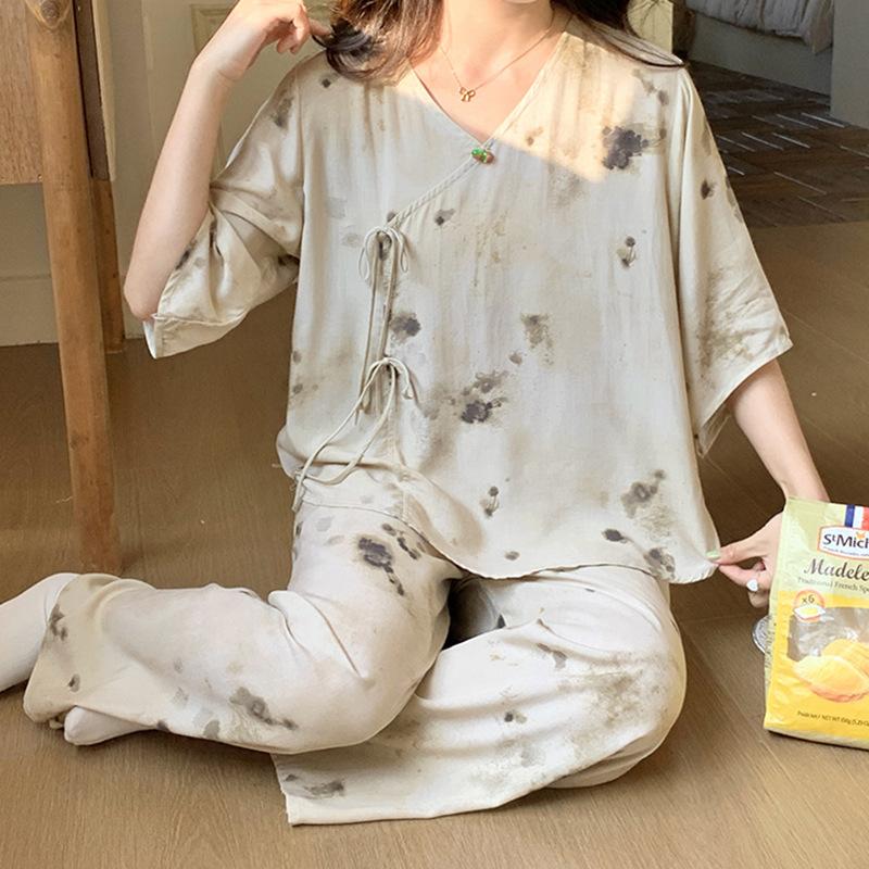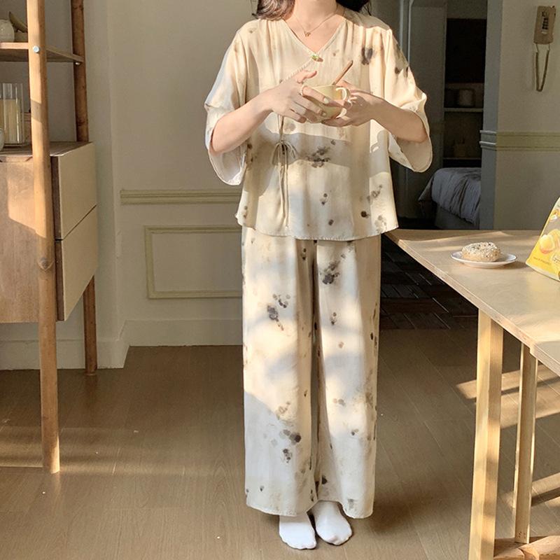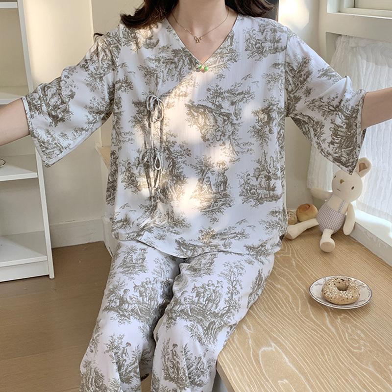 Nuevos pijamas estampados chinos para mujer, primavera, verano y otoño, nuevos pantalones de algodón y seda de manga media, ropa para el hogar Guofeng, traje de calidad