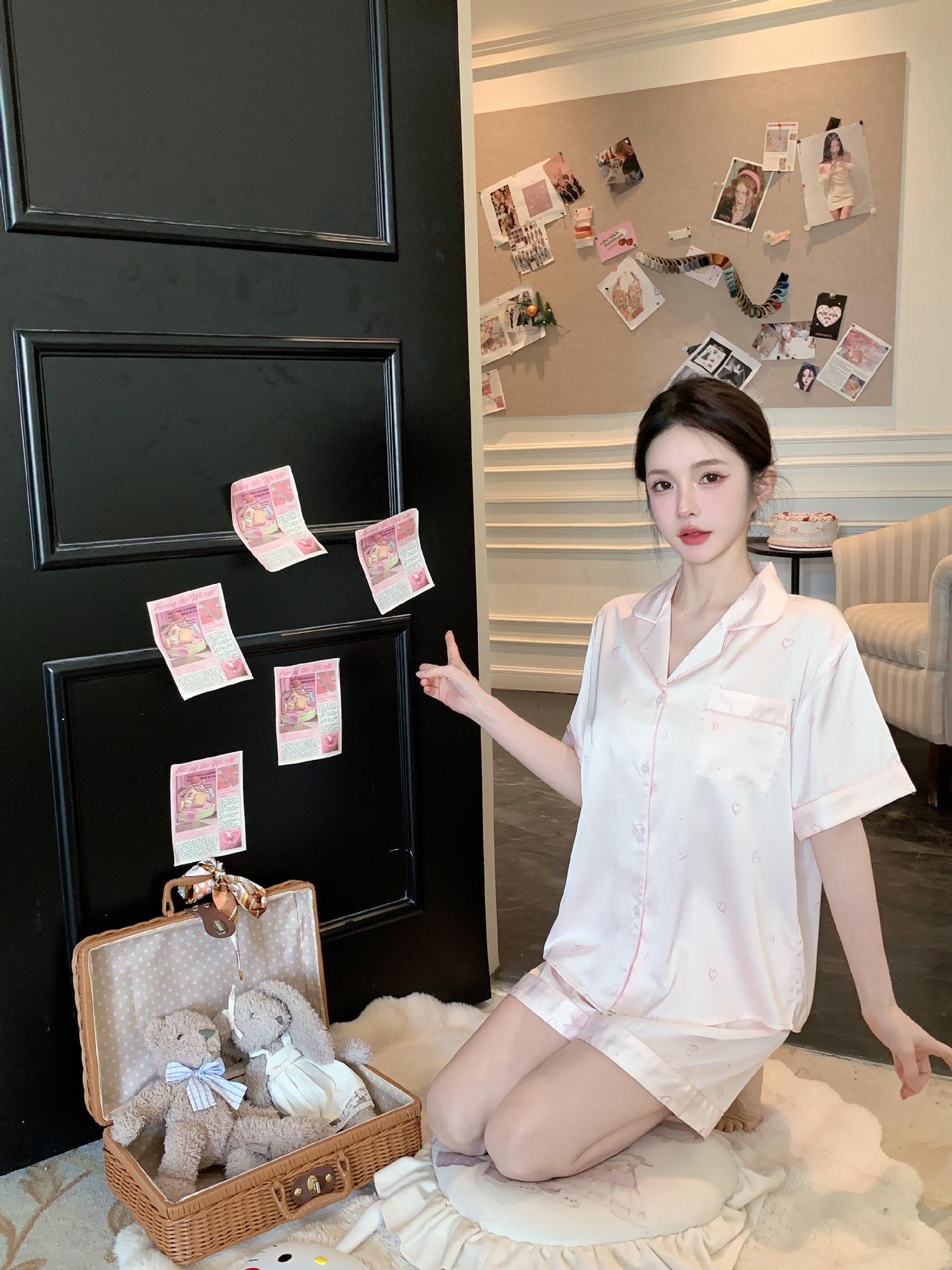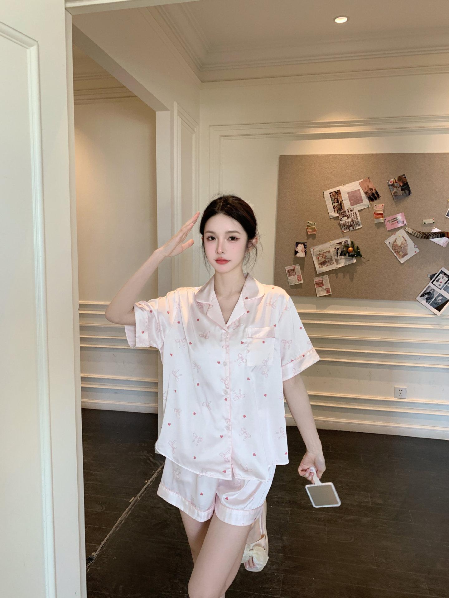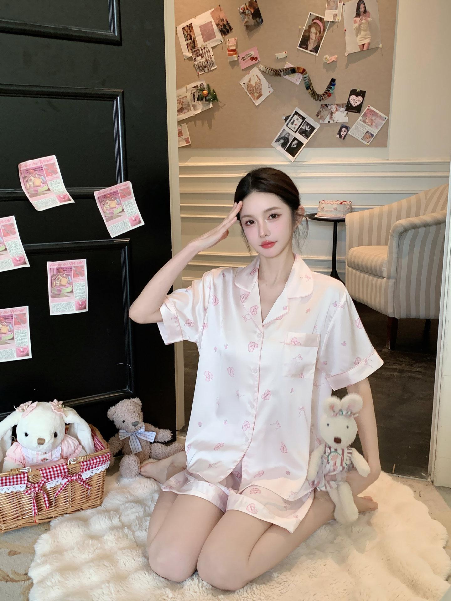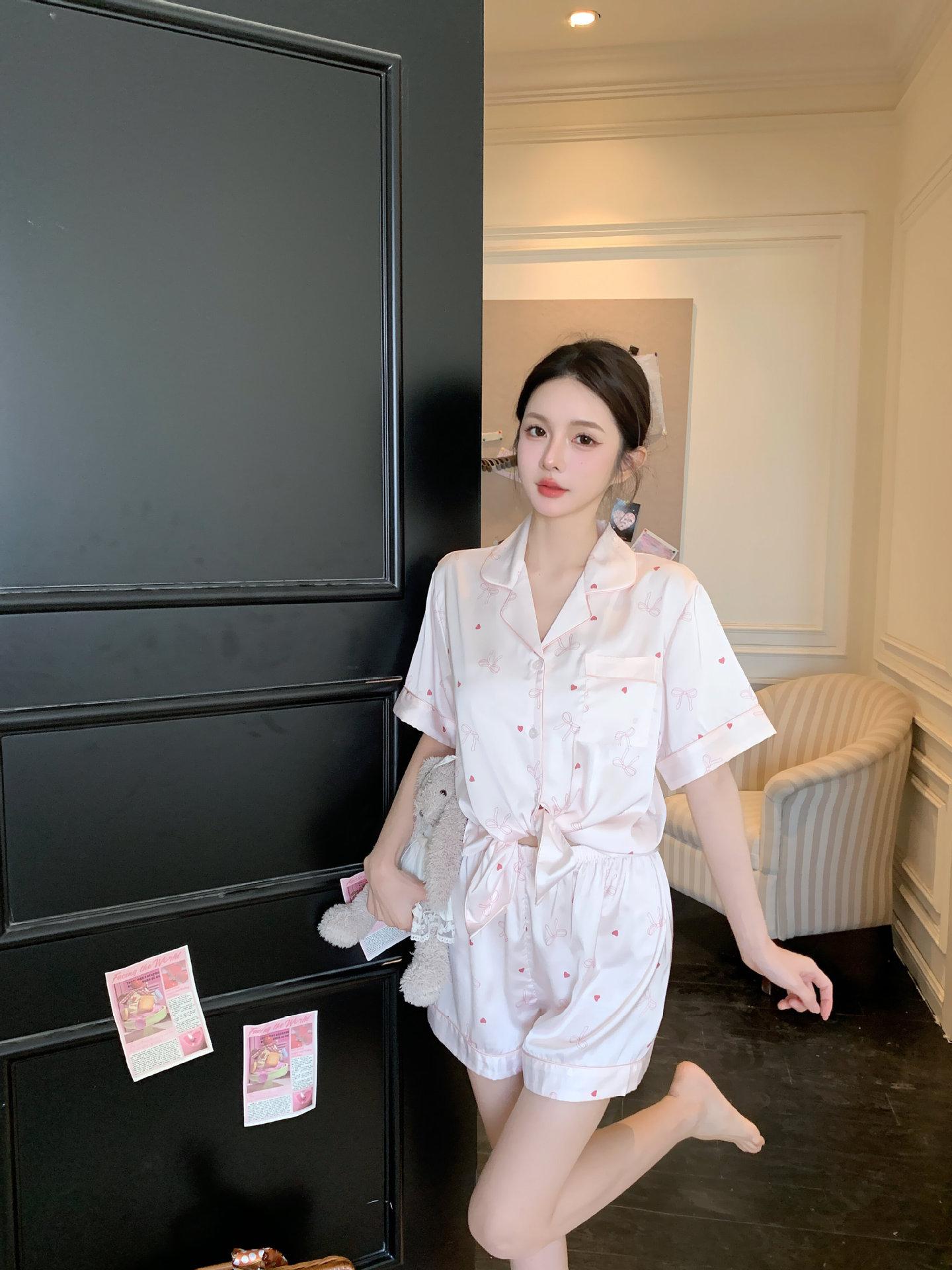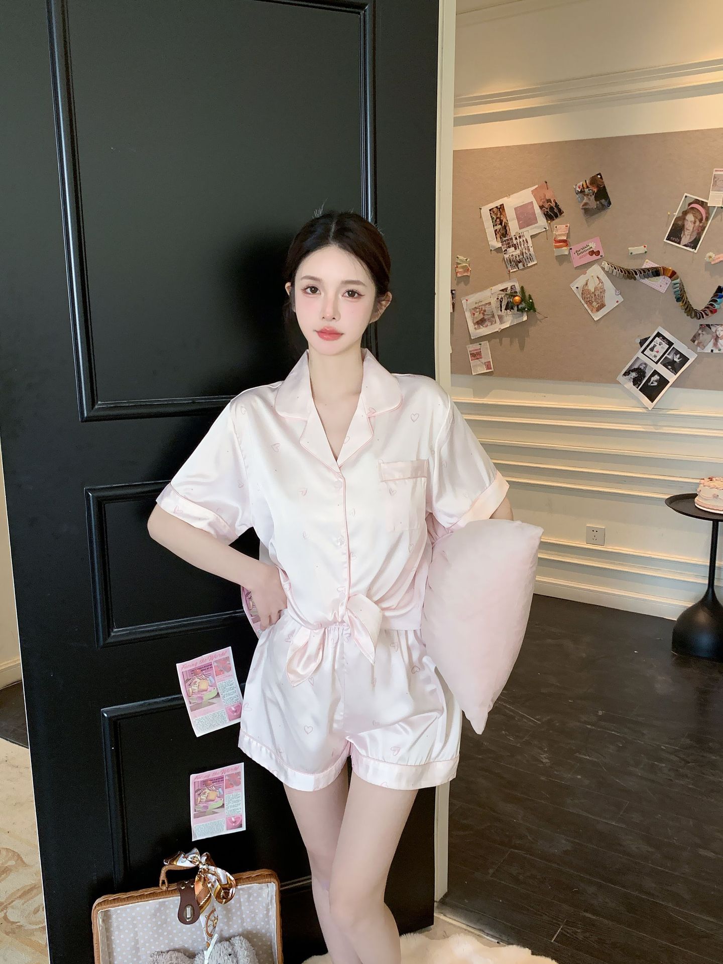 Pijama corto doble con lazo de corazón rosa para mujer, bonito y dulce, de seda helada, ropa cómoda para el hogar de principios de primavera.