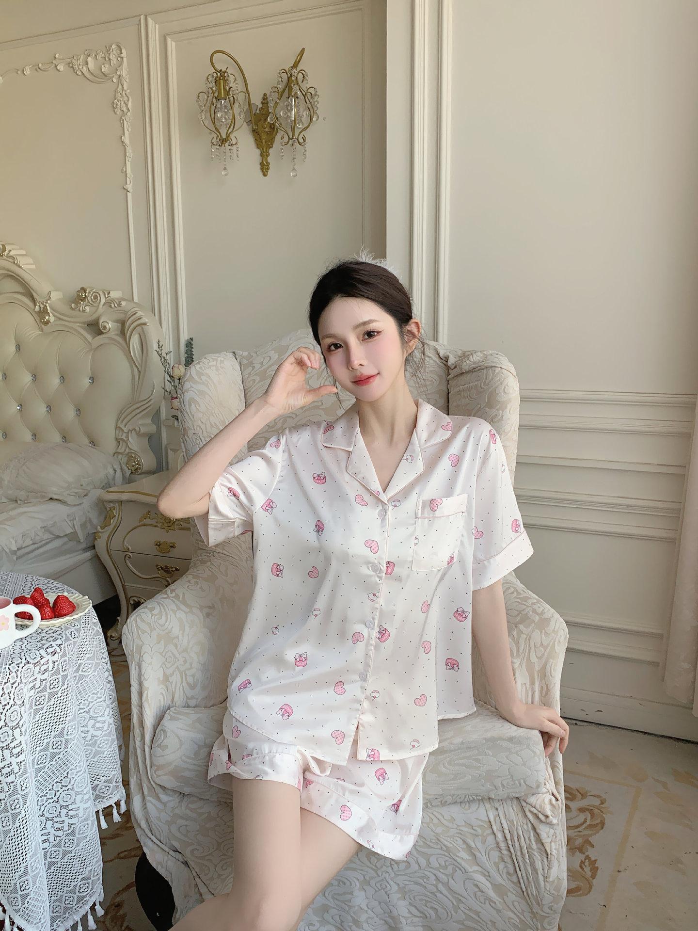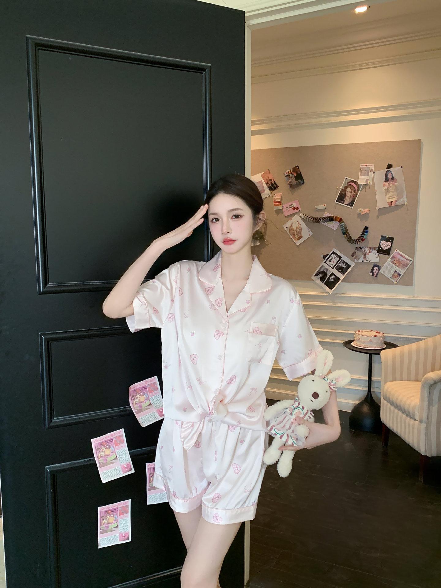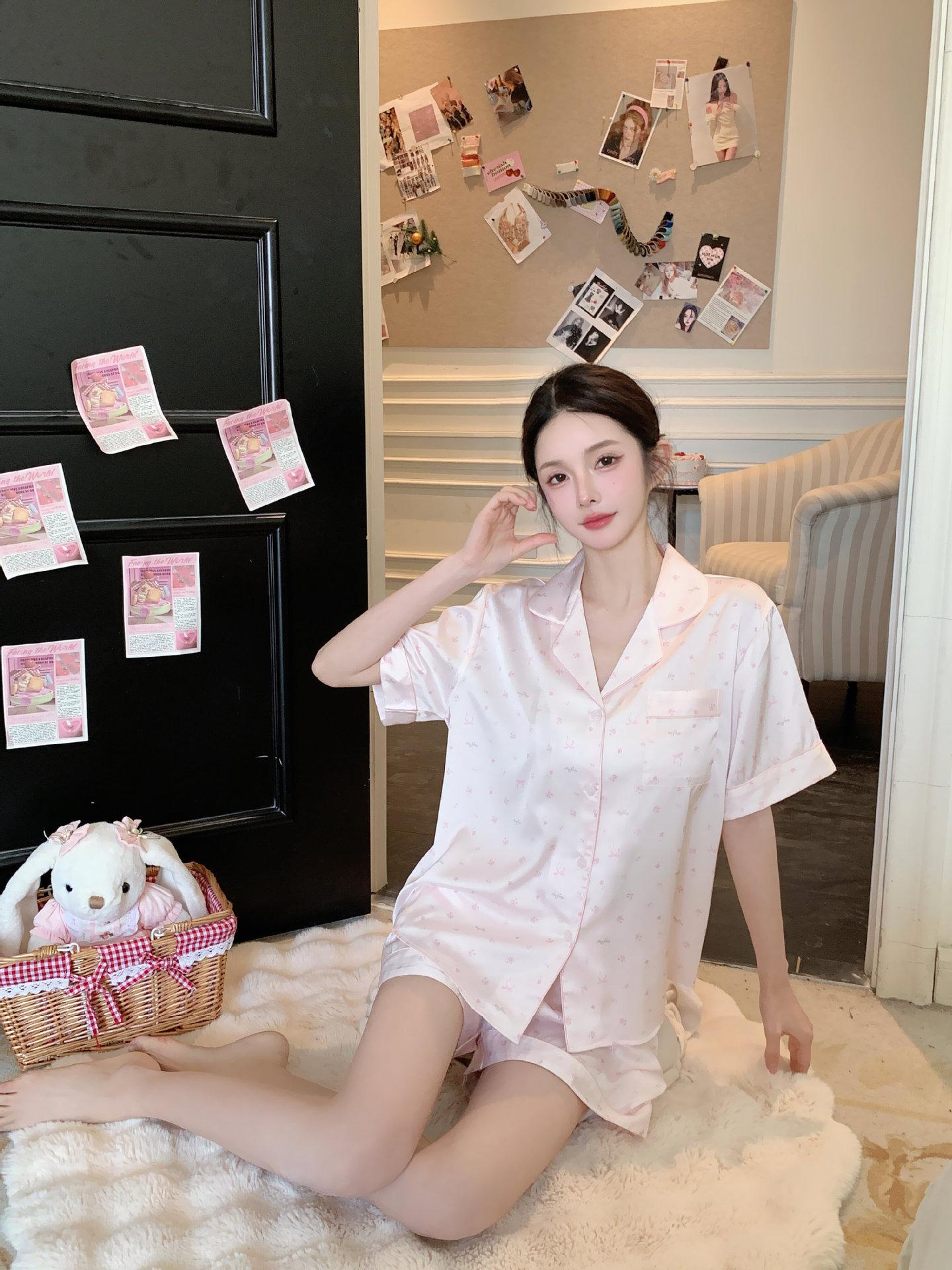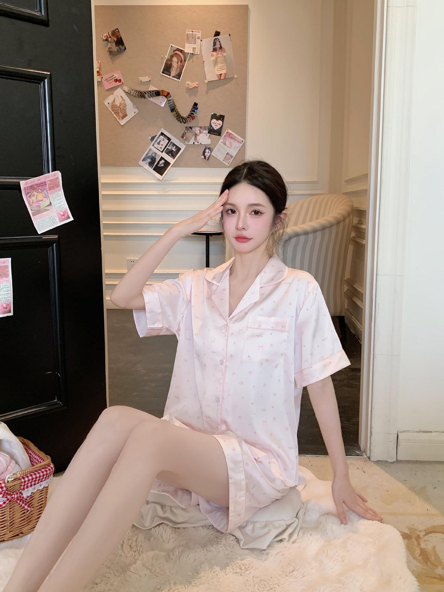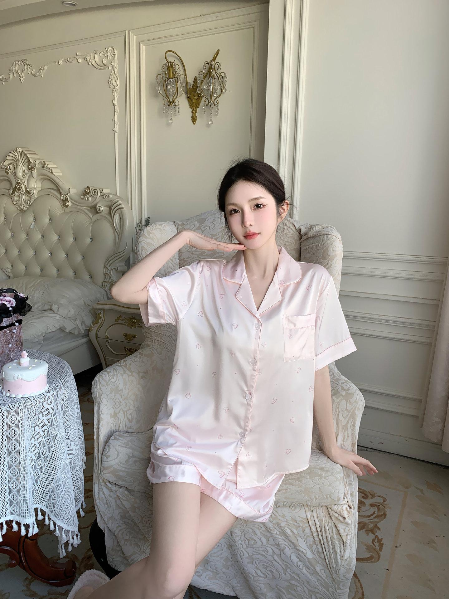 Pijama corto doble con lazo de corazón rosa para mujer, bonito y dulce, de seda helada, ropa cómoda para el hogar de principios de primavera.