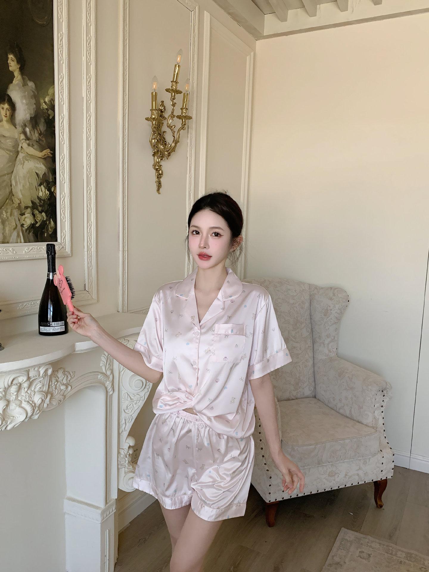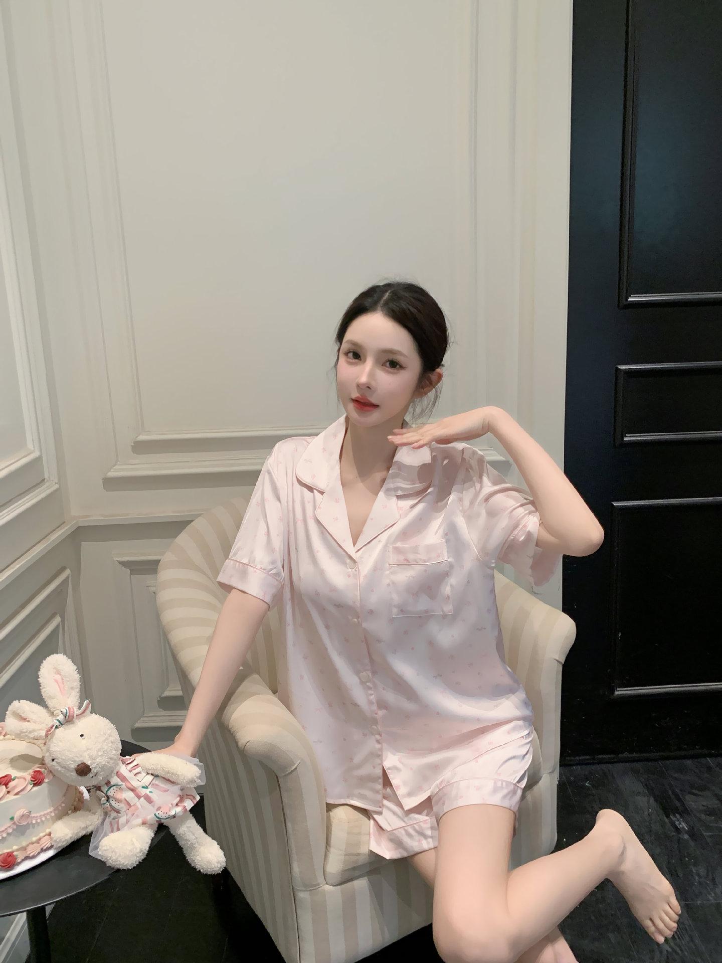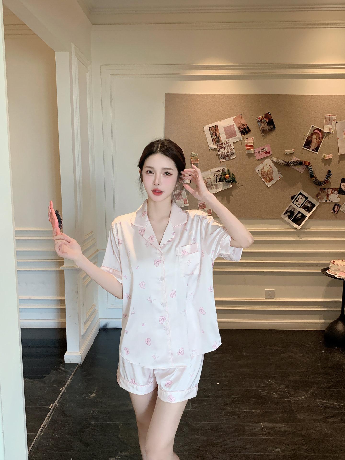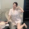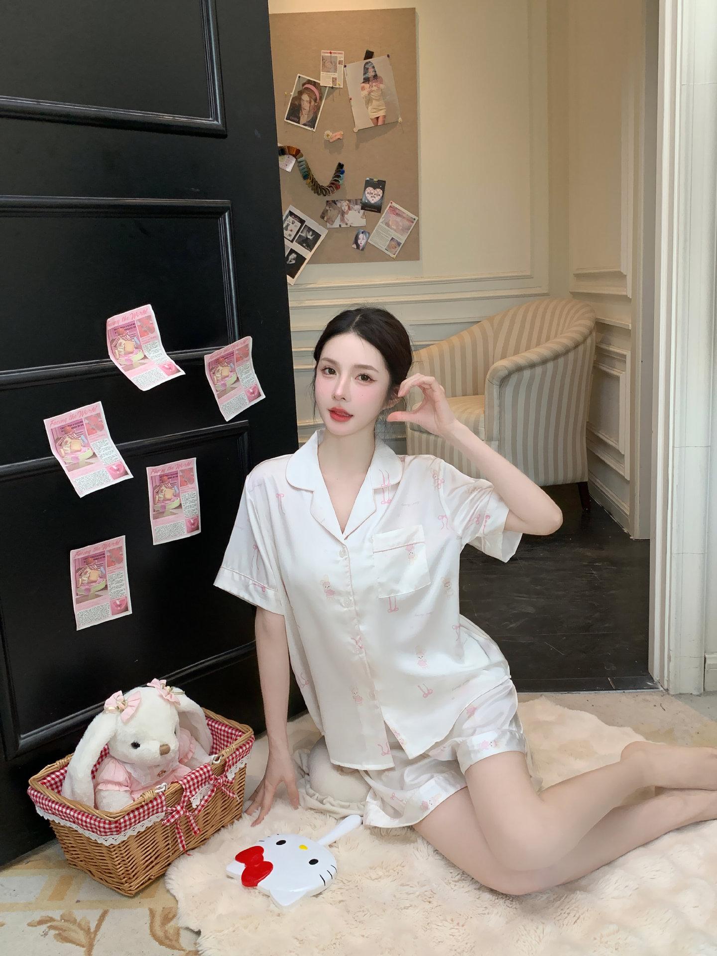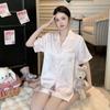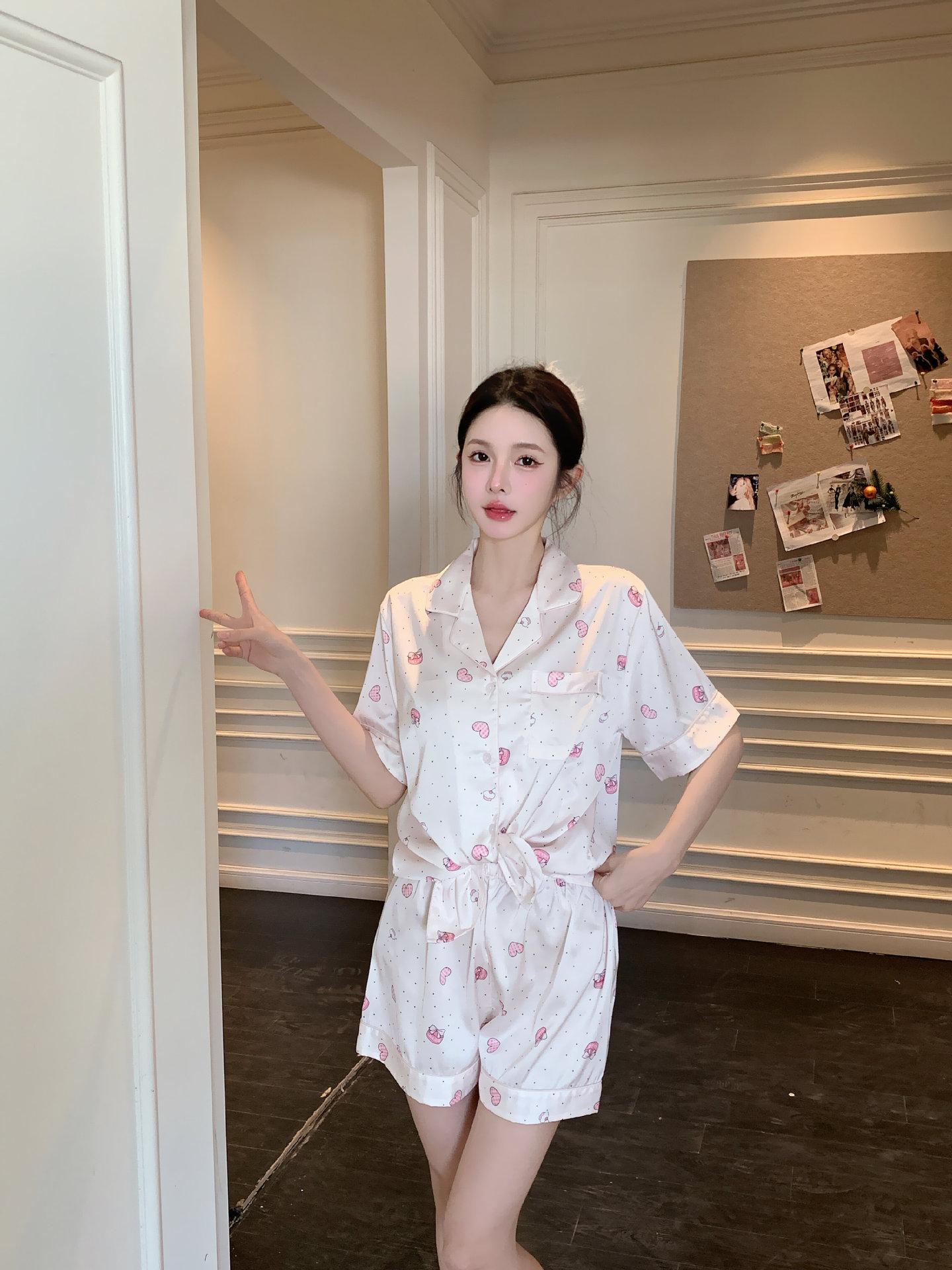Pijama corto doble con lazo de corazón rosa para mujer, bonito y dulce, de seda helada, ropa cómoda para el hogar de principios de primavera.