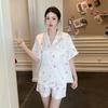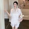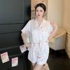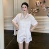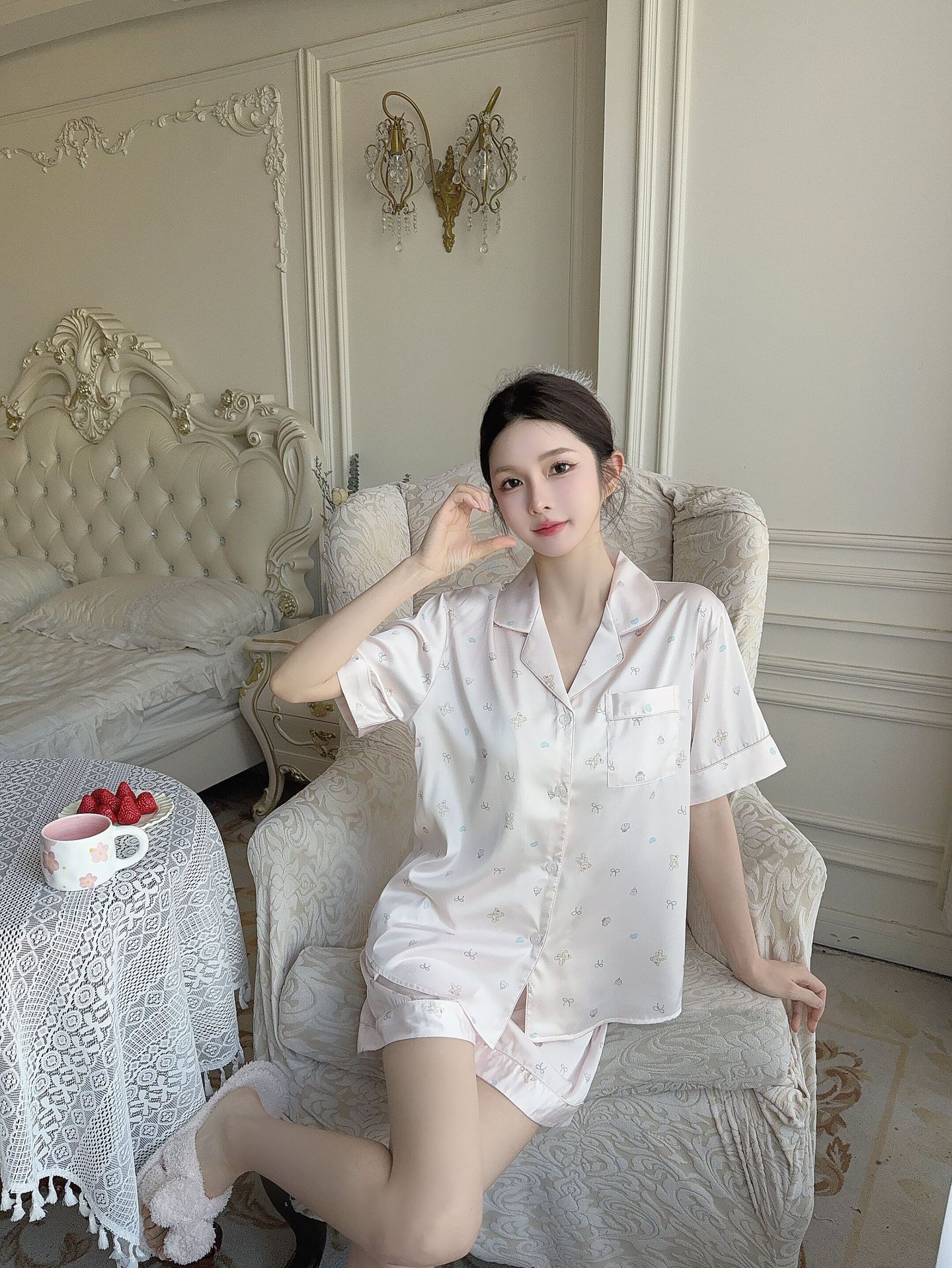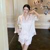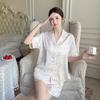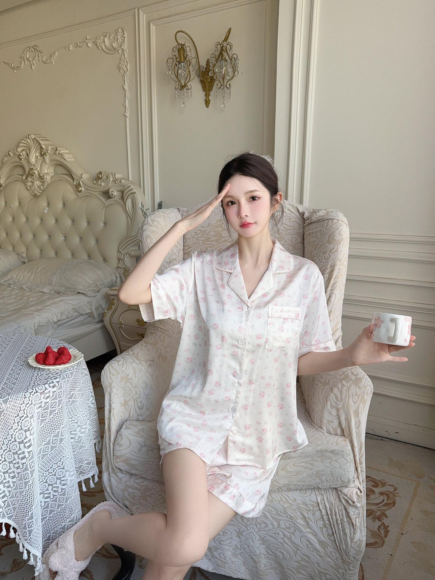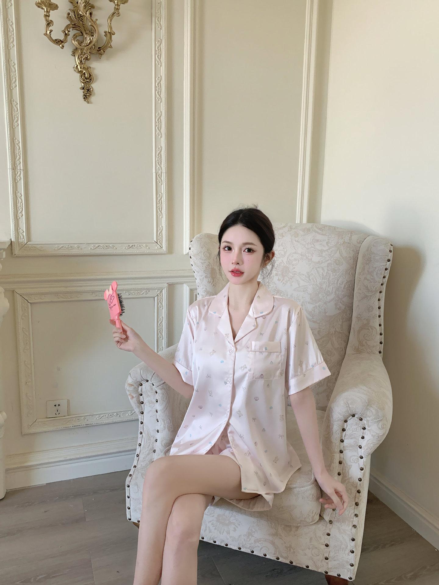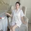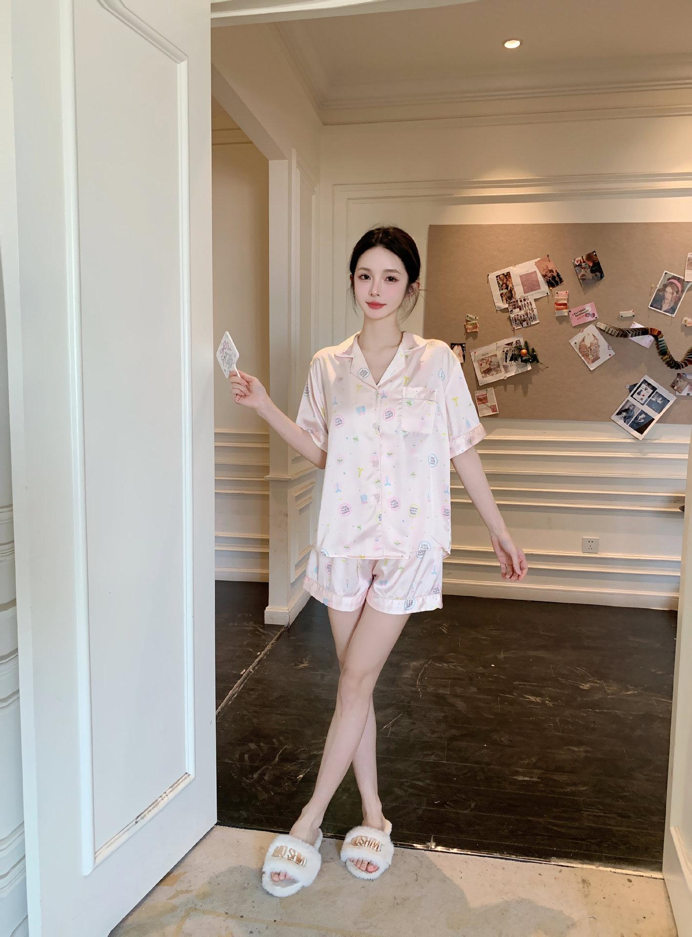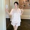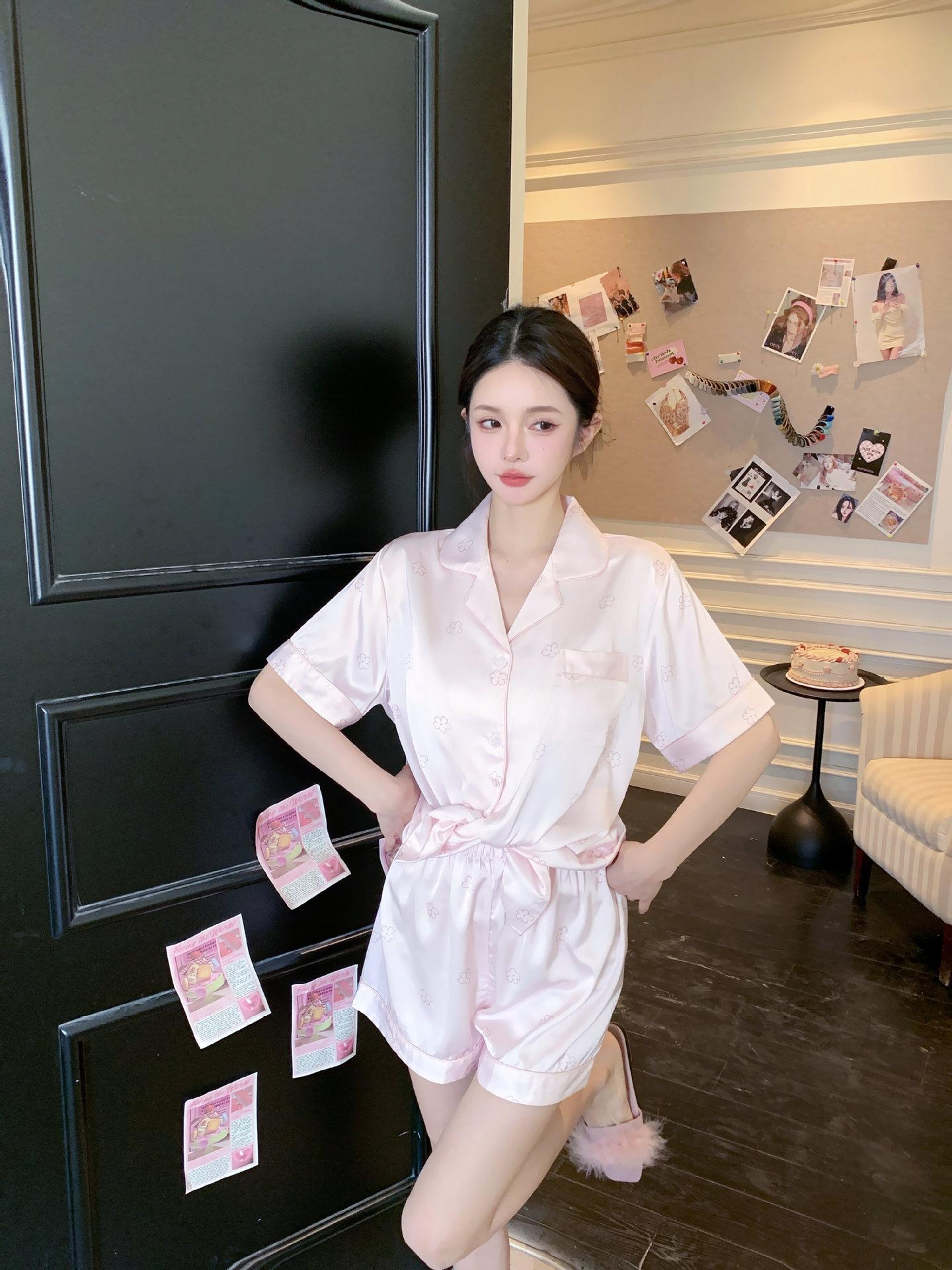 Pijama corto doble con lazo de corazón rosa para mujer, bonito y dulce, de seda helada, ropa cómoda para el hogar de principios de primavera.