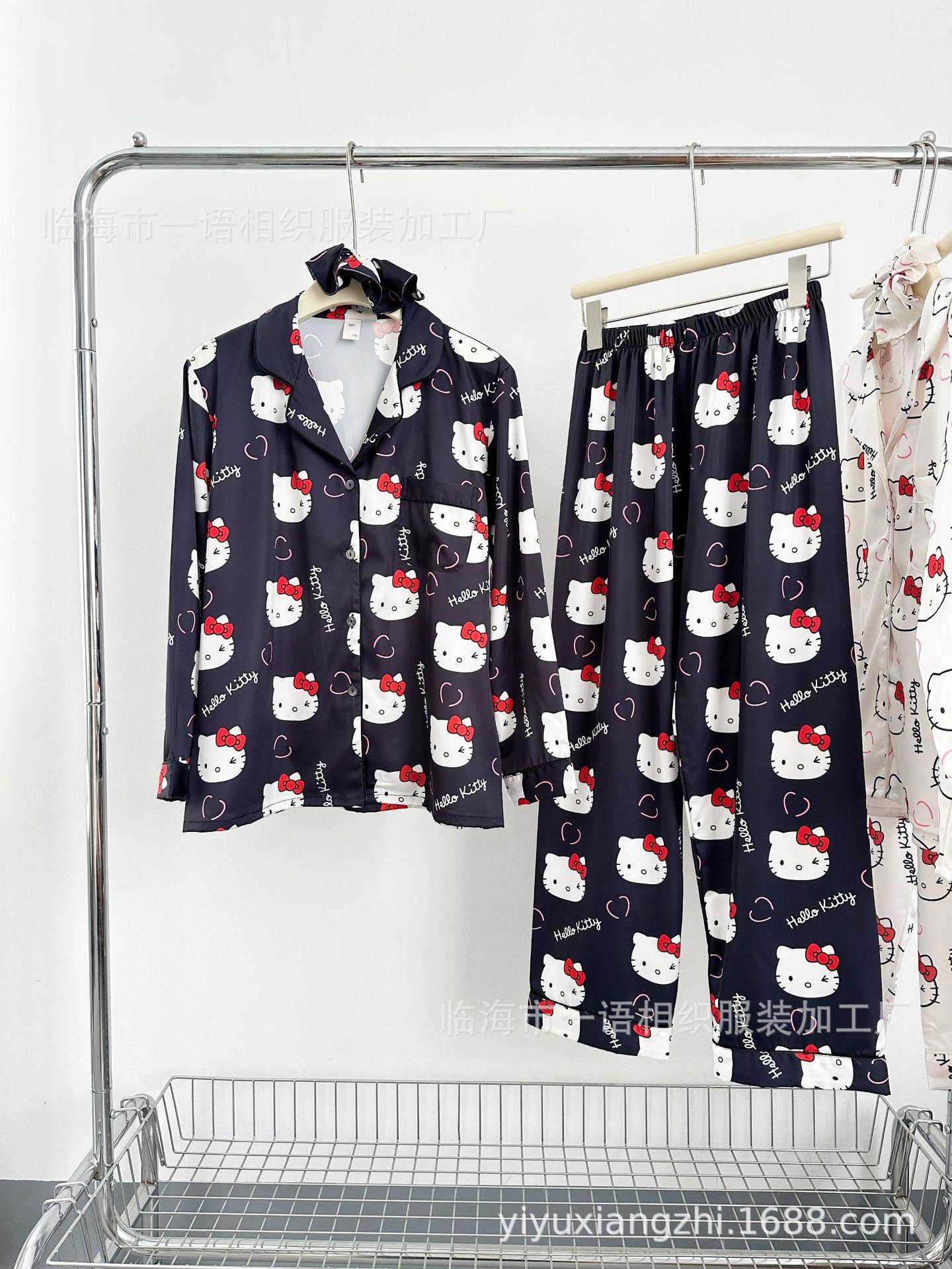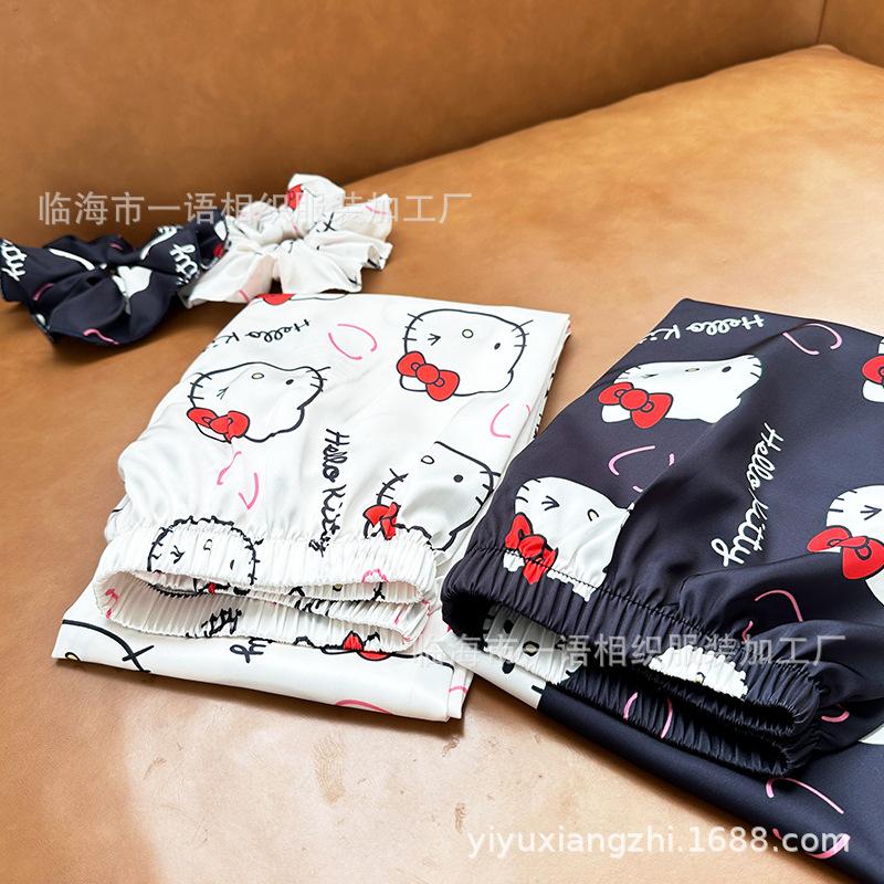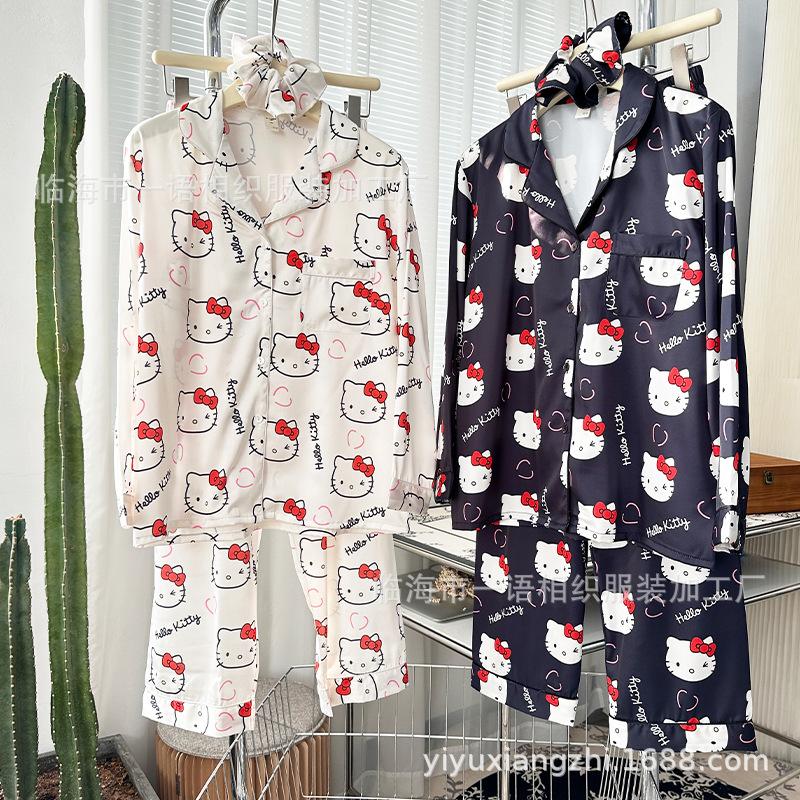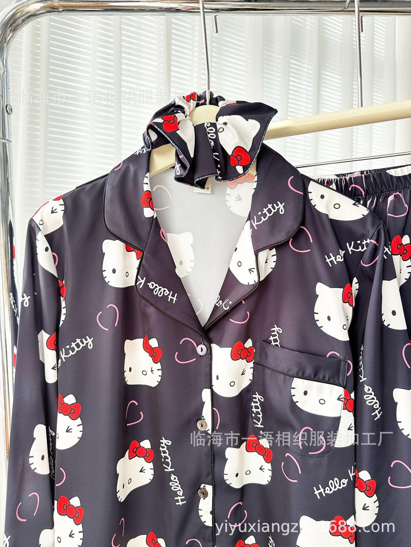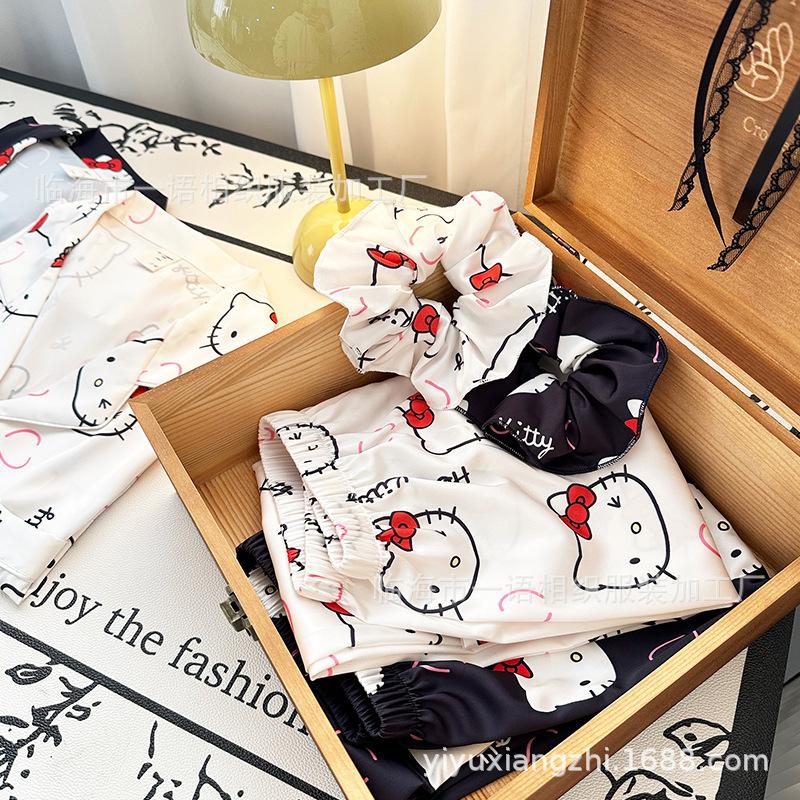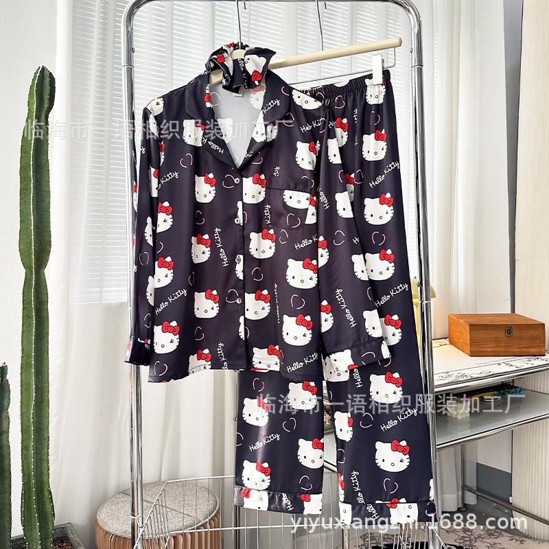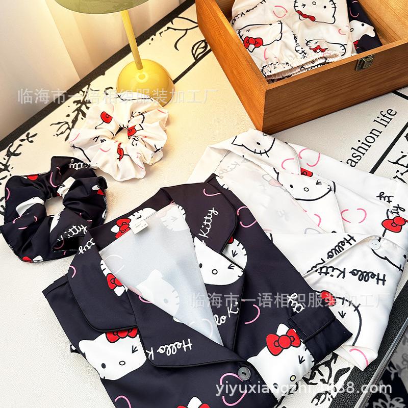 Primavera Nuevo Pijama Negro de Dibujos Animados de Seda de Hielo para Mujer Estilo Francés Casual y Cómodo Conjunto de Ropa para Casa de Niñas con Lazo para el Cabello