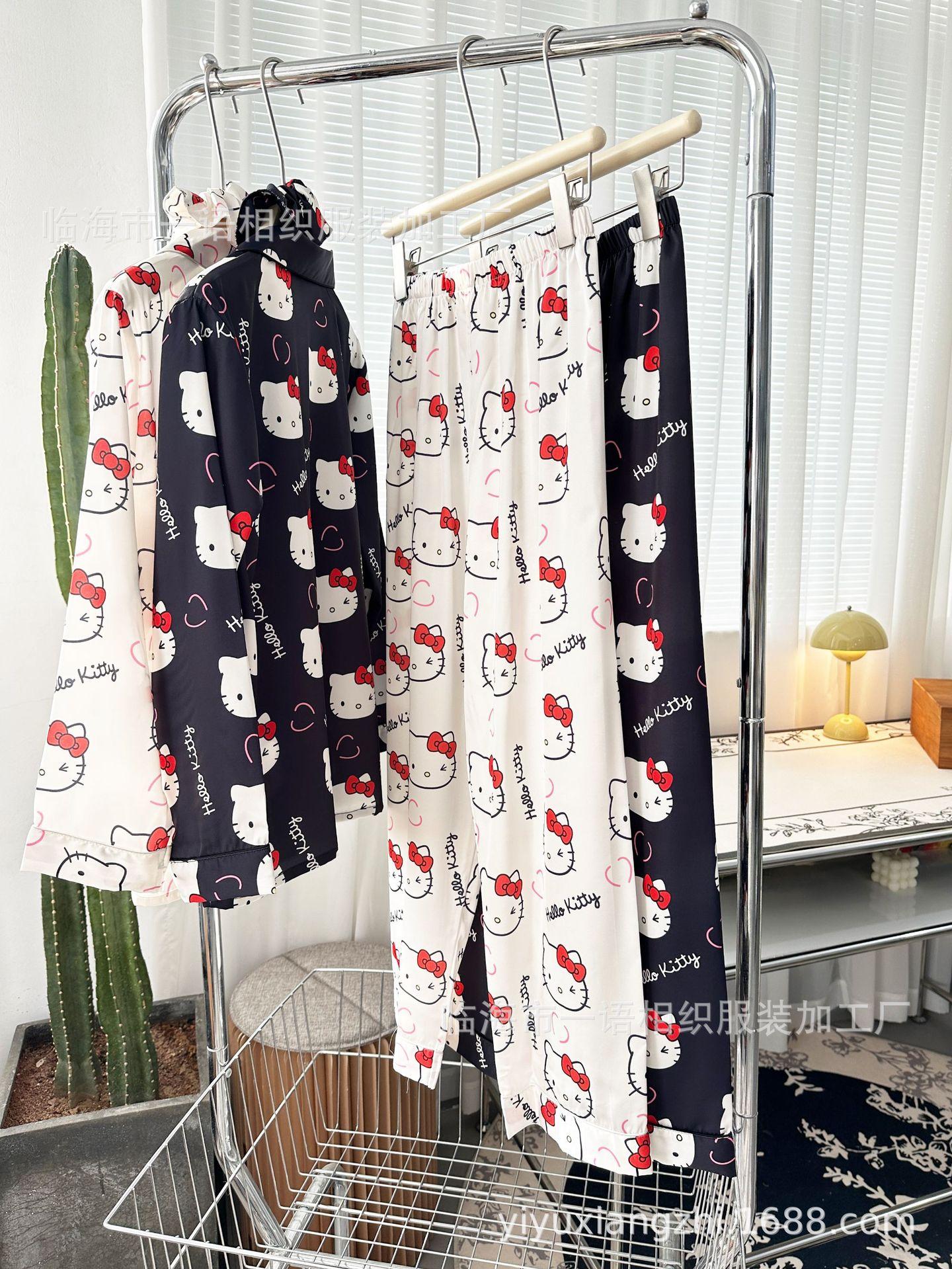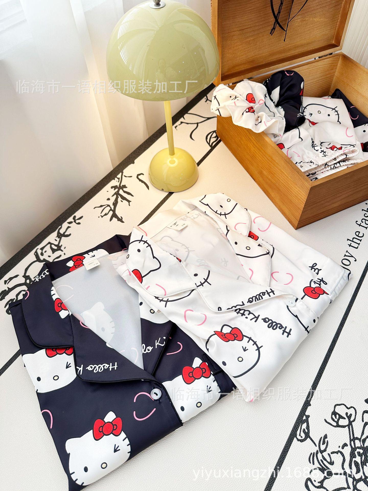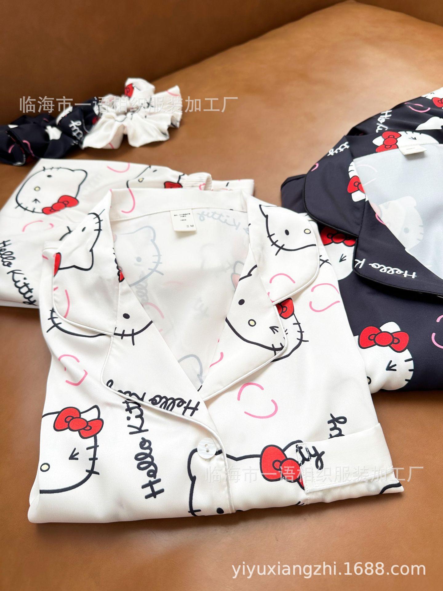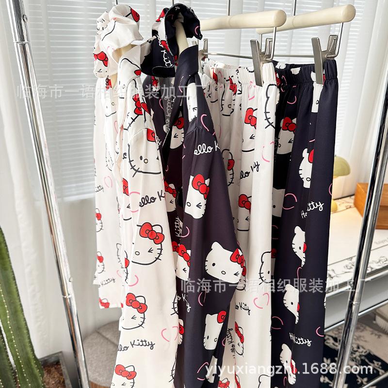 Primavera Nuevo Pijama Negro de Dibujos Animados de Seda de Hielo para Mujer Estilo Francés Casual y Cómodo Conjunto de Ropa para Casa de Niñas con Lazo para el Cabello