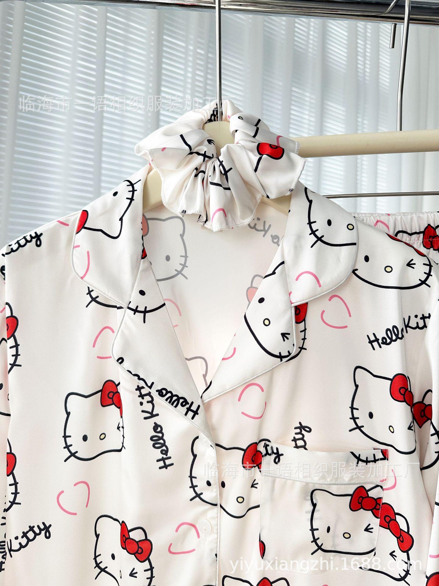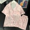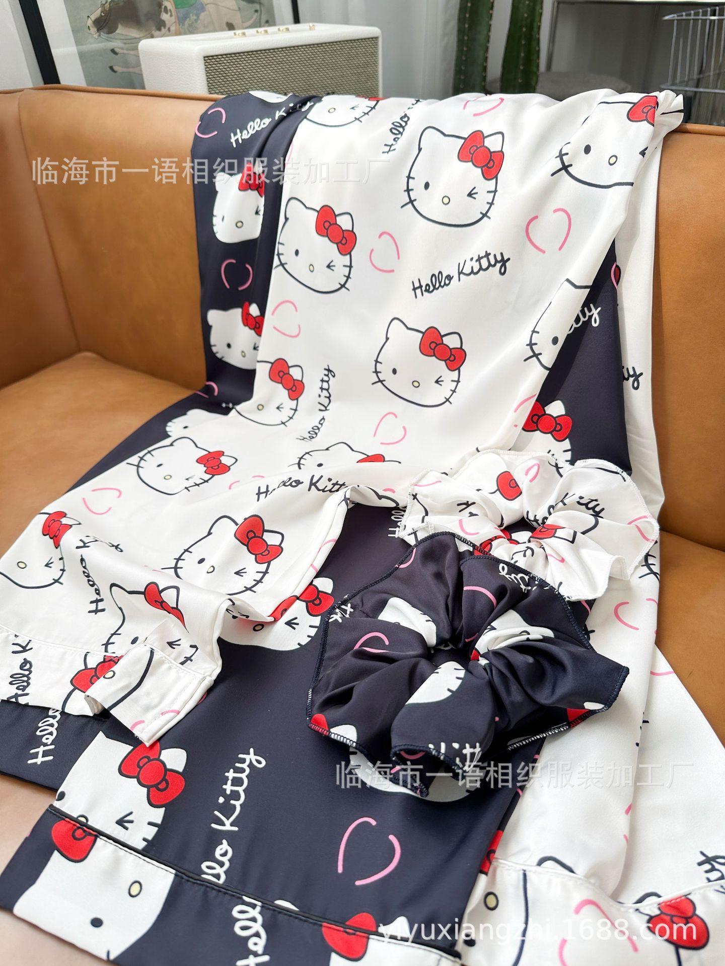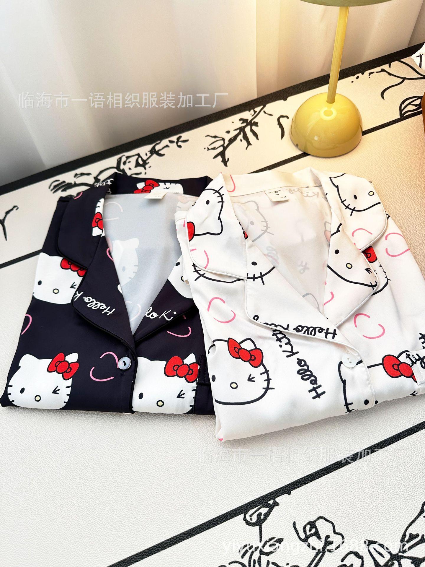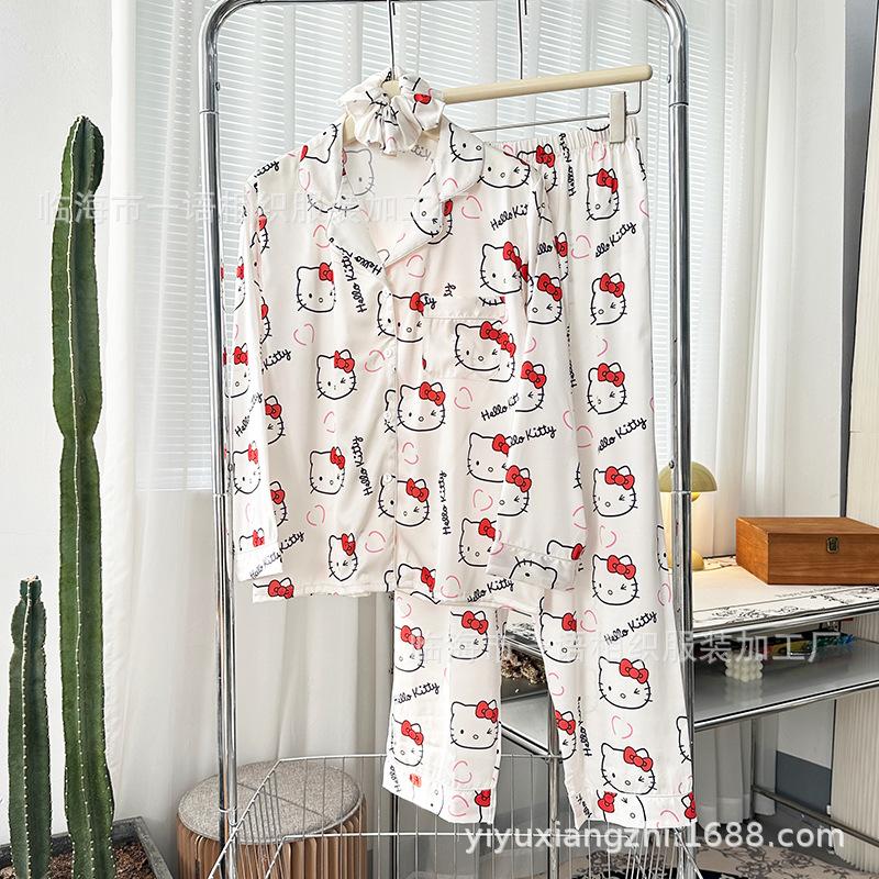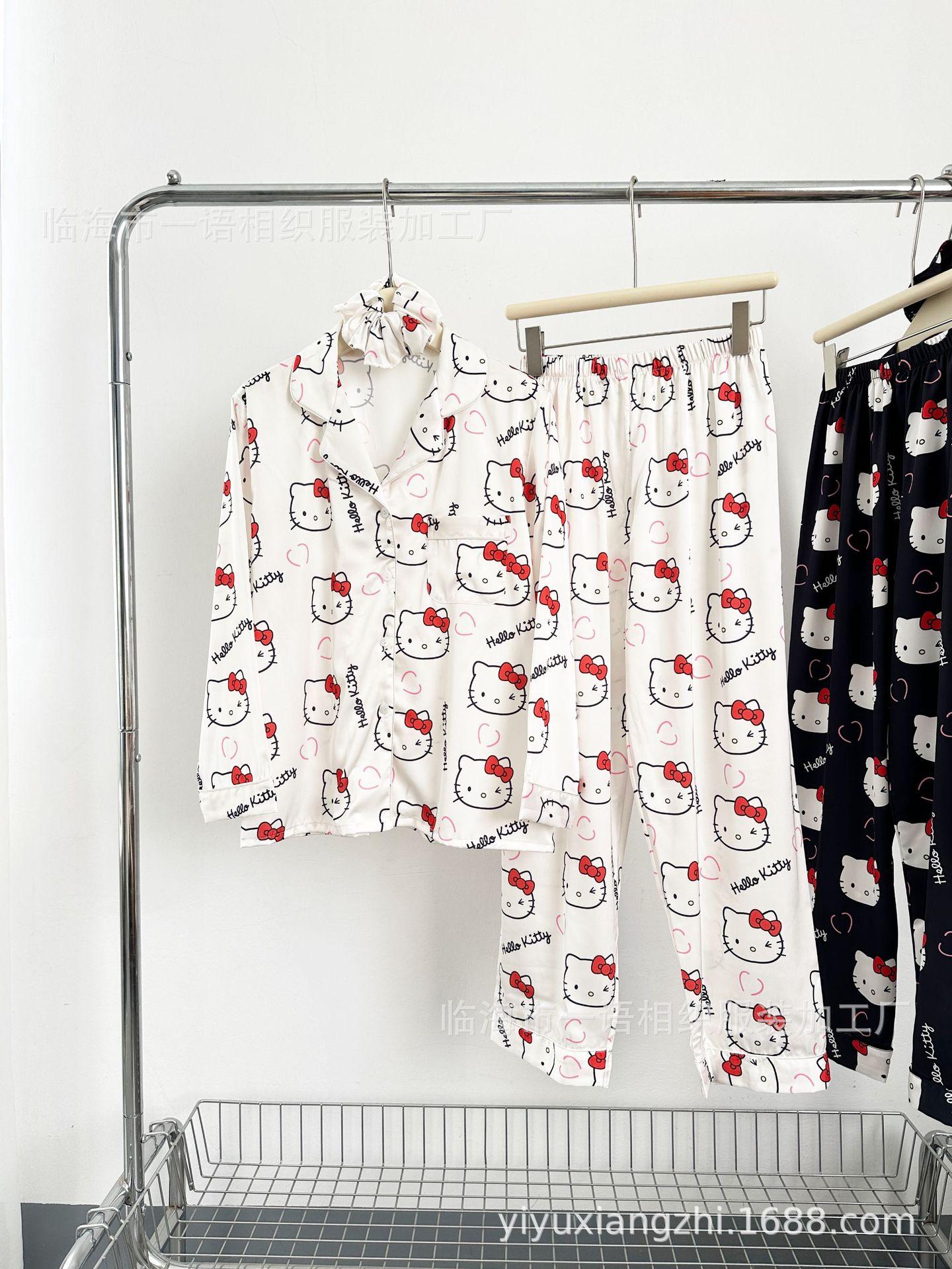 Primavera Nuevo Pijama Negro de Dibujos Animados de Seda de Hielo para Mujer Estilo Francés Casual y Cómodo Conjunto de Ropa para Casa de Niñas con Lazo para el Cabello